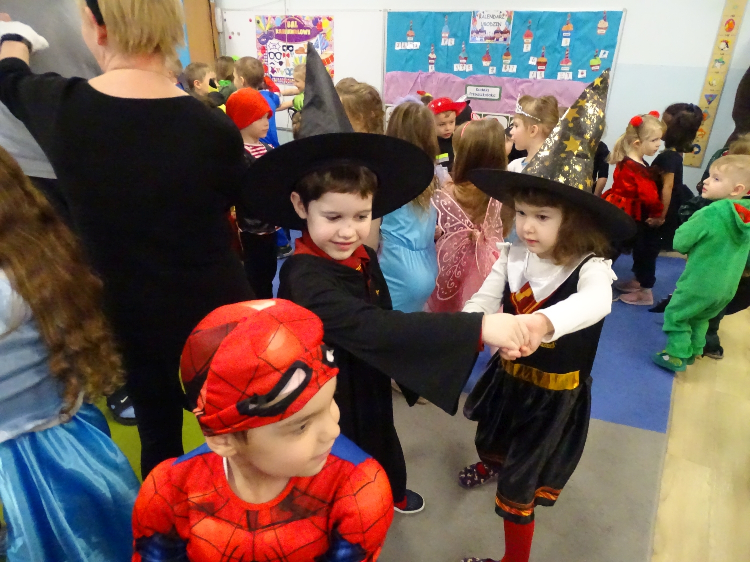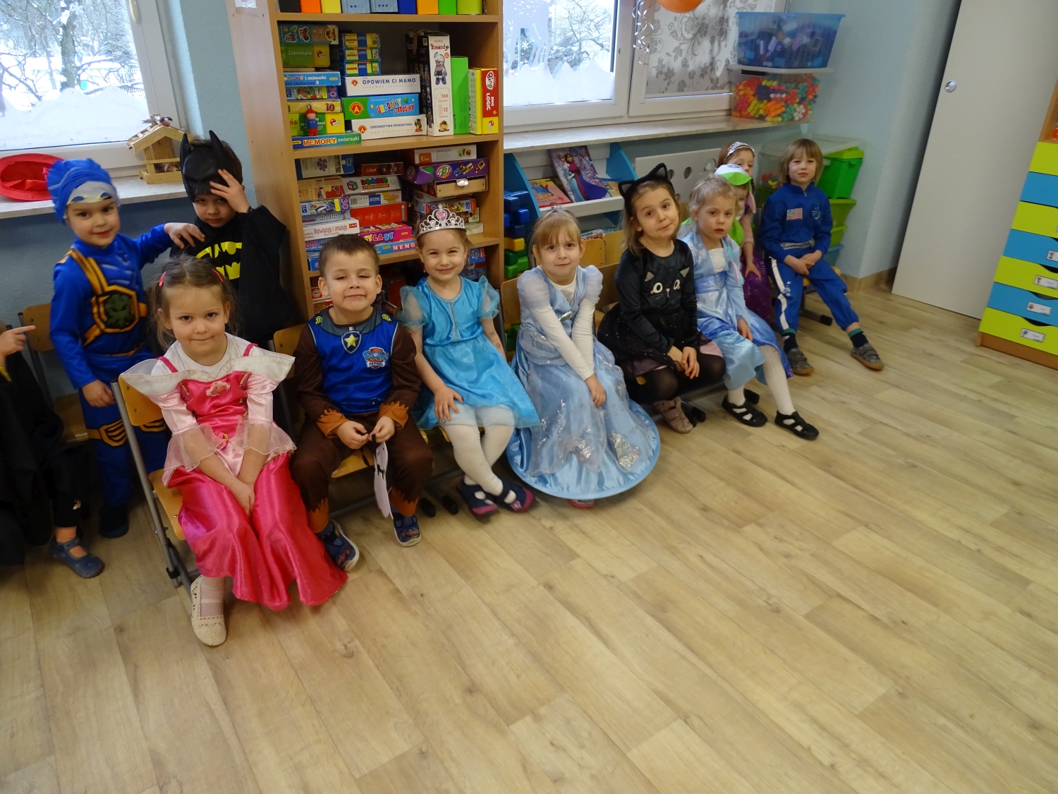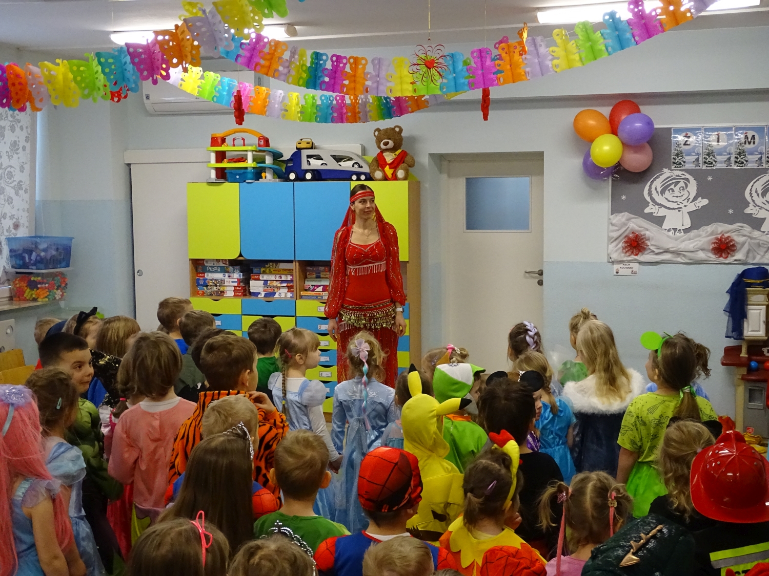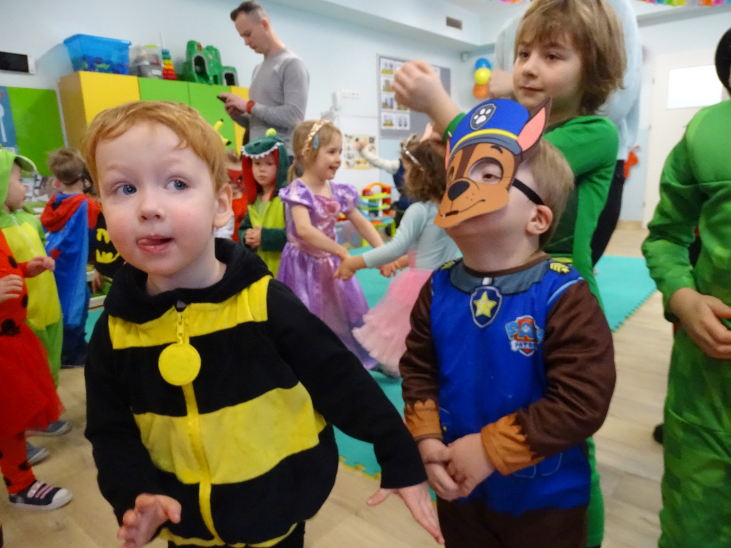 Bal karnawałowy w przedszkolu był dniem pełnym radości, kolorów i wspaniałej zabawy. Dzieci przyszły w pięknych, pomysłowych strojach – można było spotkać księżniczki, superbohaterów, zwierzątka oraz bajkowe postacie. Podczas balu nie zabrakło tańców przy ulubionej muzyce, wspólnych zabaw i konkursów. Sala udekorowana balonami i serpentynami stworzyła wyjątkową, karnawałową atmosferę. To był niezapomniany dzień pełen uśmiechów i dziecięcej radości.