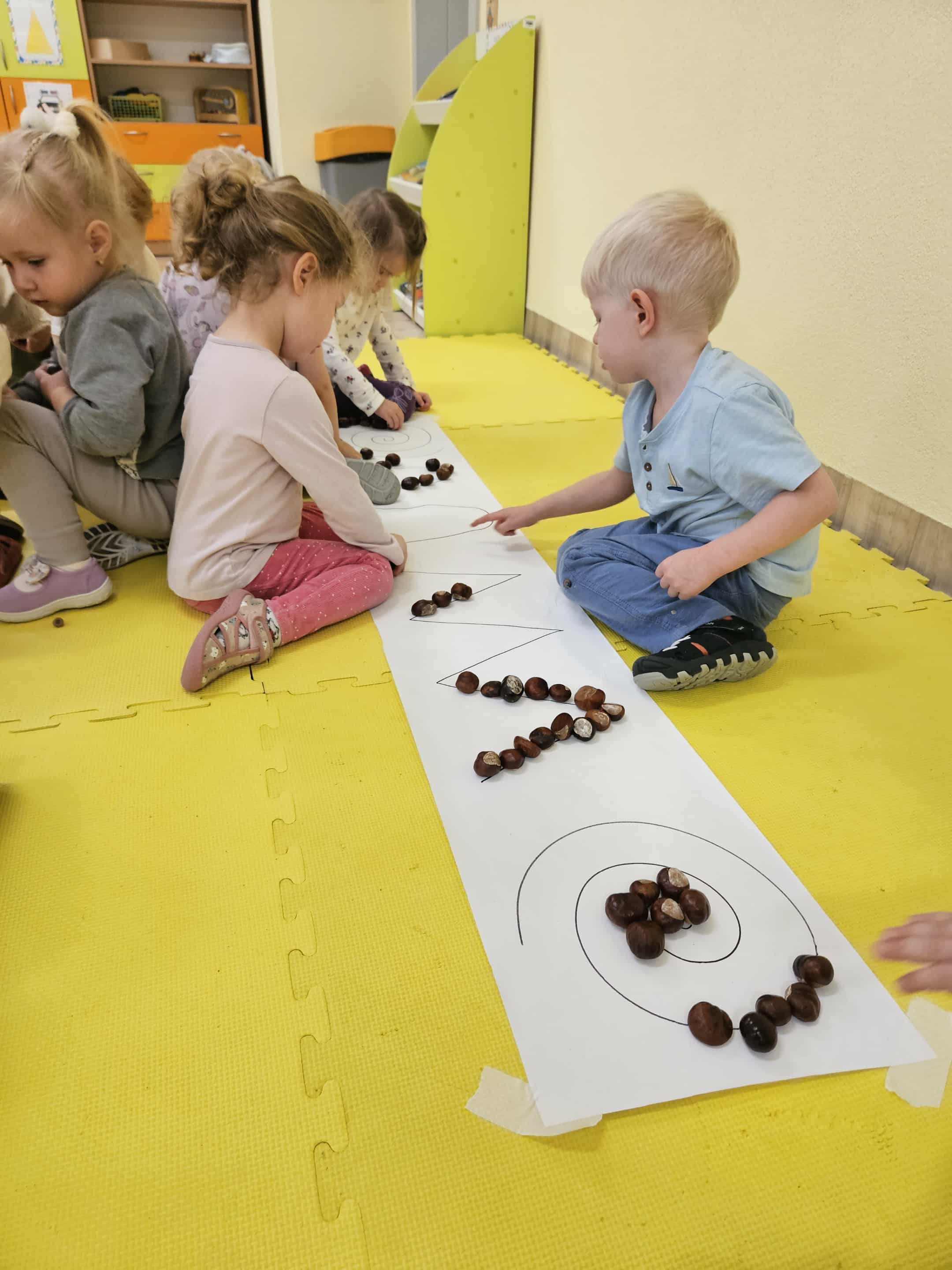 W grupie Rumianki obchodziliśmy Dzień Kasztana. Dzieci z dużym zaangażowaniem uczestniczyły w zabawach z wykorzystaniem kasztanów. Układały różne wzory i obrazki z kasztanów, zgodnie z przygotowanymi schematami, rozwijając przy tym swoją wyobraźnię i zdolności manualne. Przedszkolaki miały też okazję chodzić po kasztanach, co było doskonałym ćwiczeniem sensorycznym oraz grać na kasztanach, poznając ich dźwięk i fakturę.