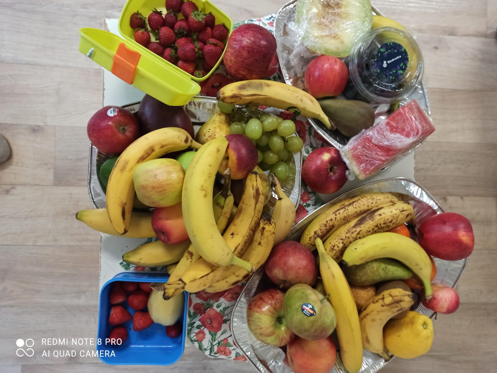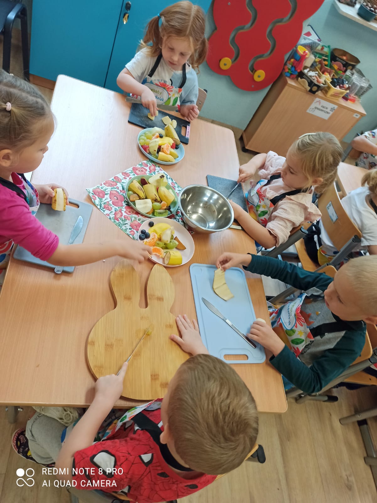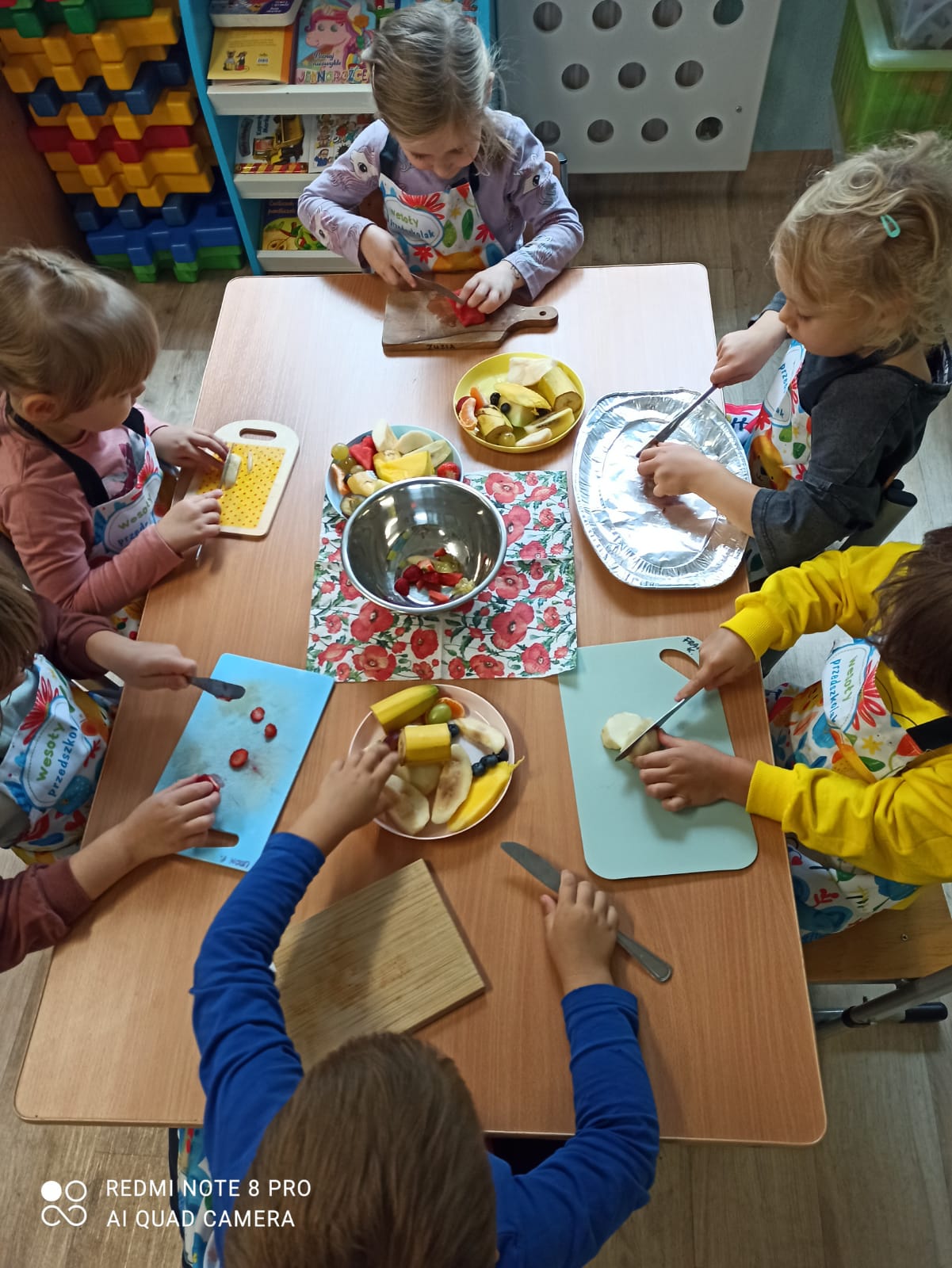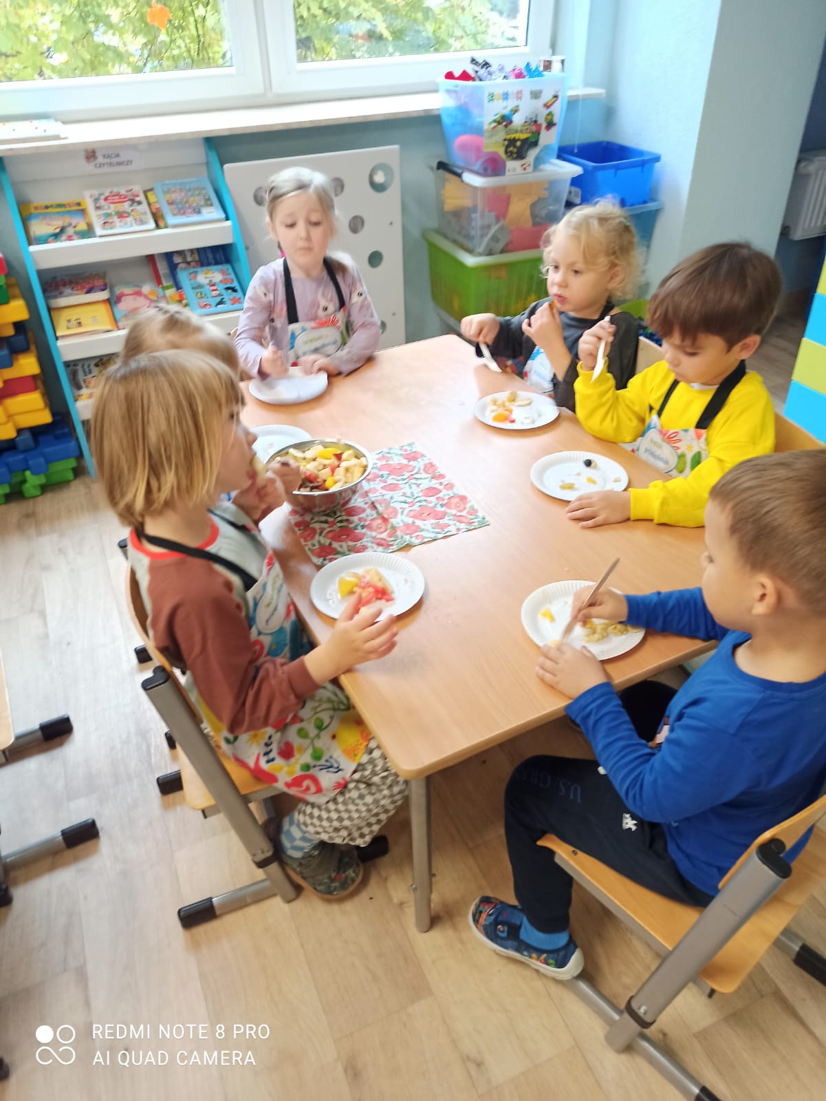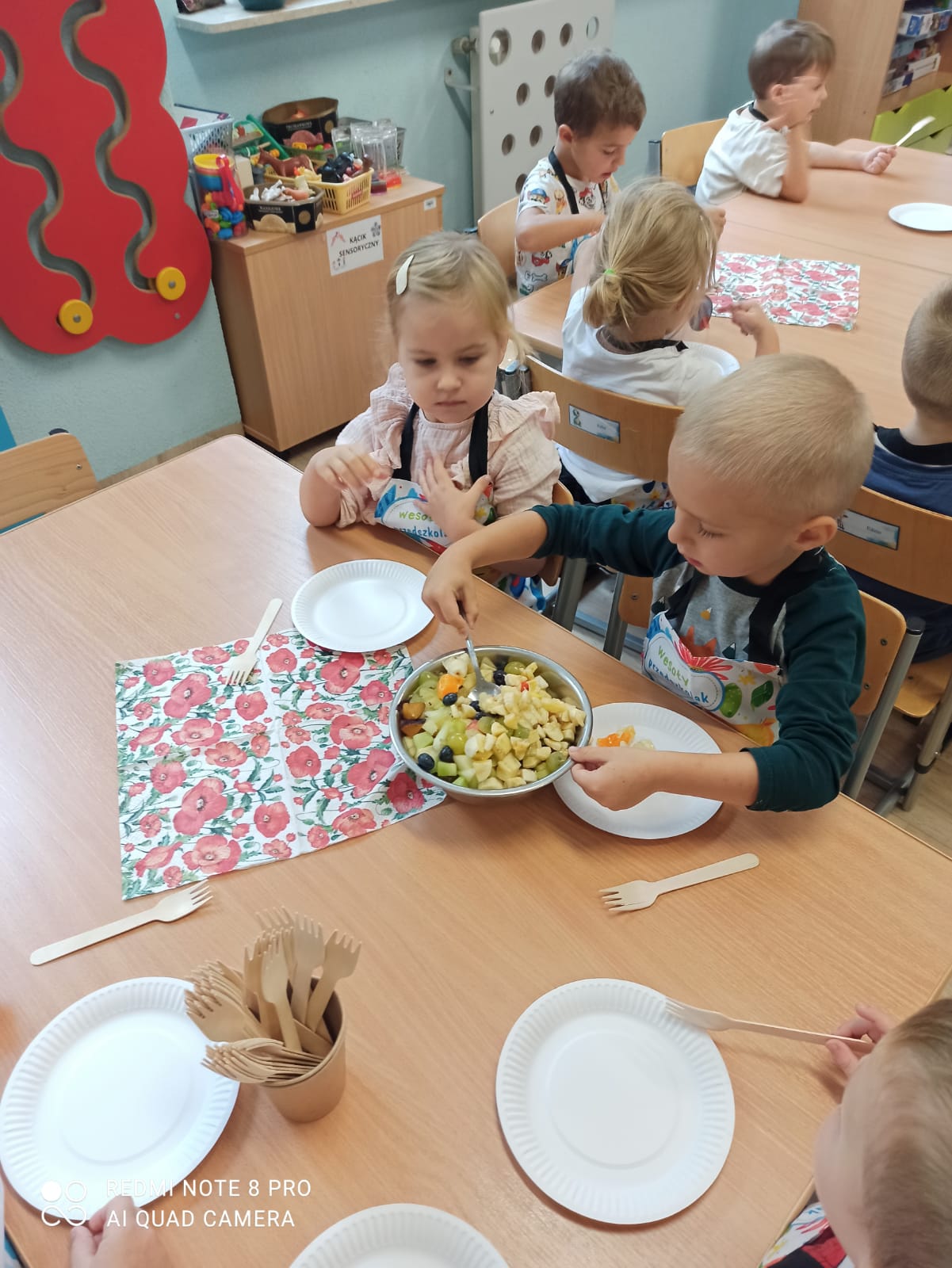 Dziś w naszej przedszkolnej sali zapachniało owocami! Dzieci z grupy Niezapominajki zamieniły się w małych kucharzy i samodzielnie przygotowały pyszną, kolorową sałatkę owocową. Było krojenie, mieszanie, a przede wszystkim mnóstwo radości i dobrej zabawy. Przy okazji dzieci uczyły się nazw owoców, doskonaliły swoje zdolności manualne i dowiedziały się, jak ważne jest zdrowe odżywianie. A na koniec – wspólna degustacja!