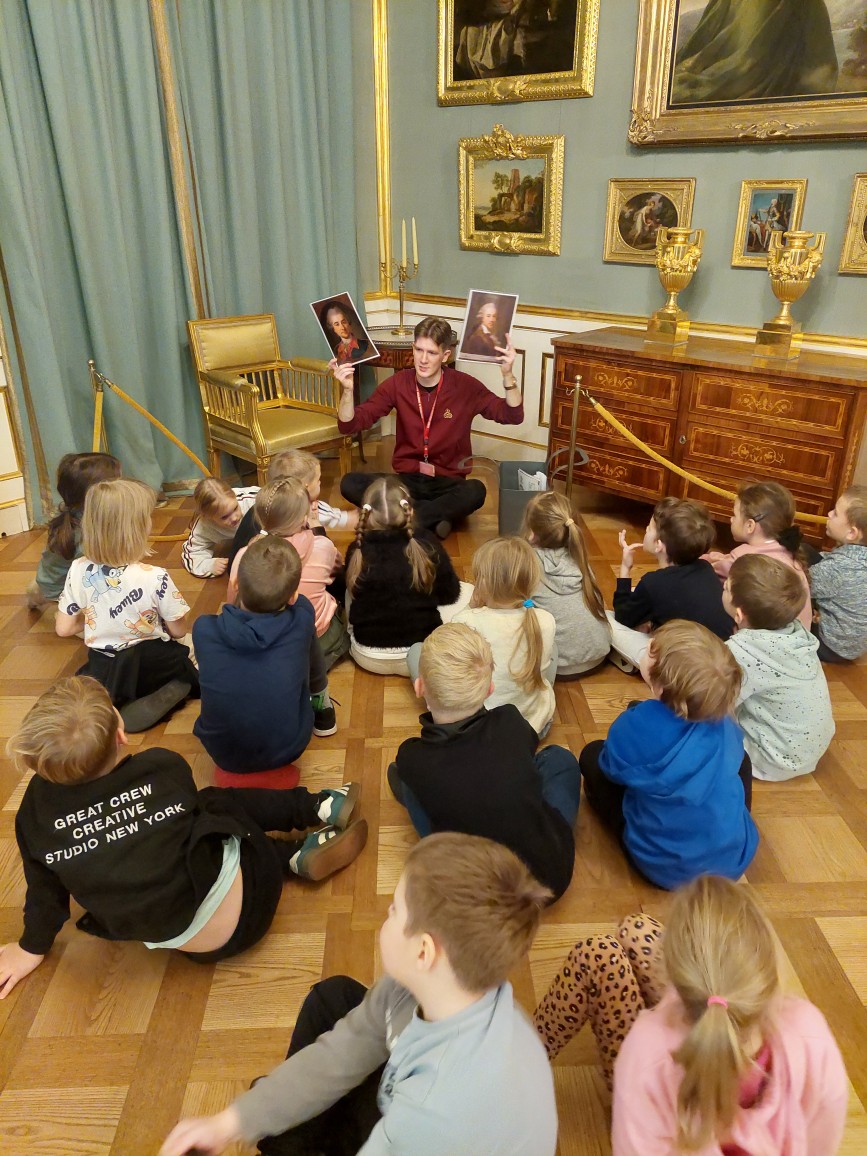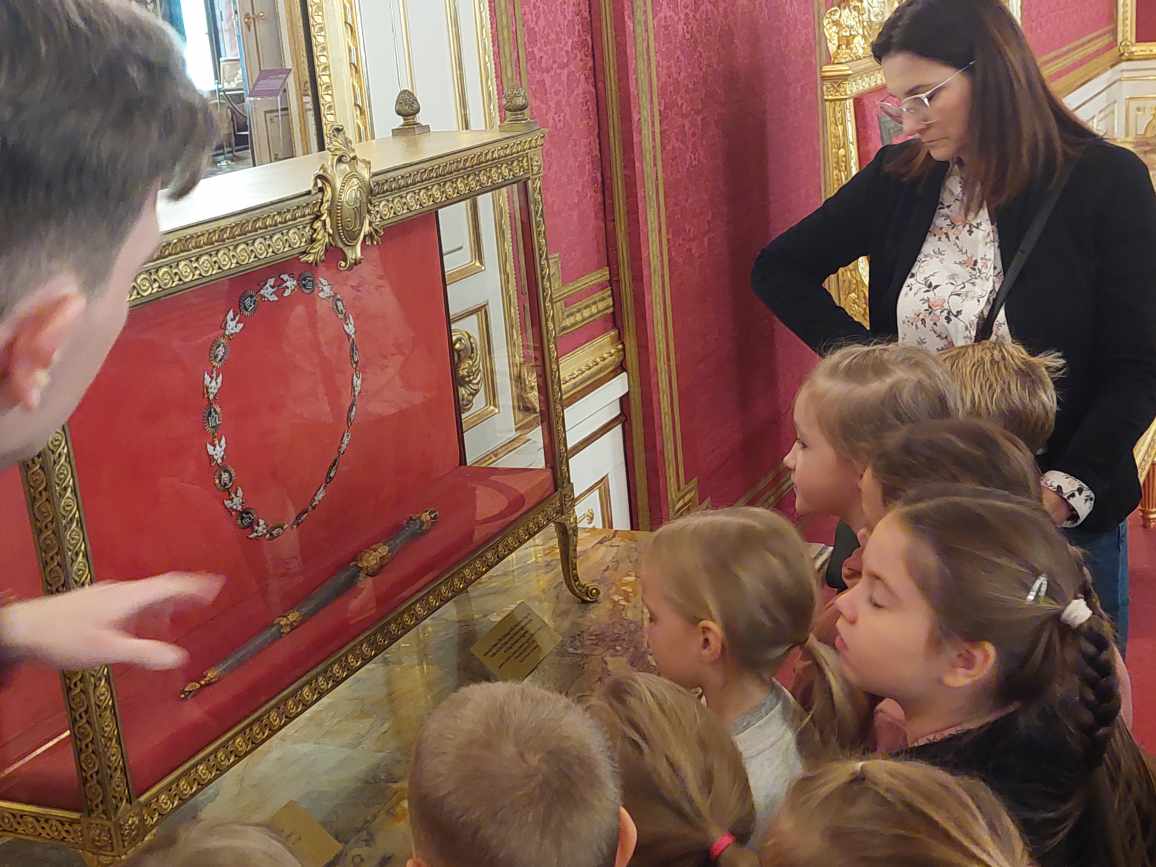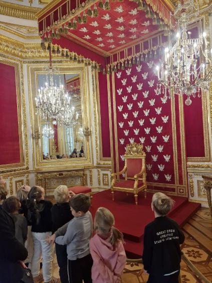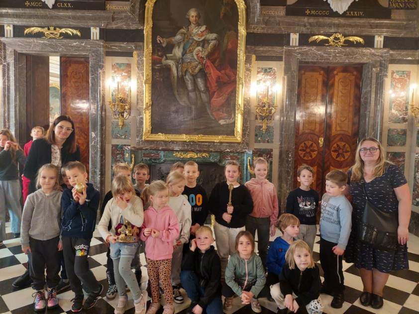 Dnia 5 listopada dzieci z grupy Słoneczniki były na wycieczce w Zamku Królewskim i uczestniczyły w lekcji muzealnej "Spotkanie z królem". Dowiedziały się, jak wyglądał król? gdzie mieszkał i co robił? Na te pytania dzieci szukały odpowiedzi, spacerując po wybranych salach zamkowych. Oglądały dzieła sztuki i pamiątki po królu Stanisławie Auguście m.in. tron królewski, insygnia. Dowiedziały się, jak właściwie zachować się w muzeum. Wycieczka sprawiła wszystkim dużo radości.