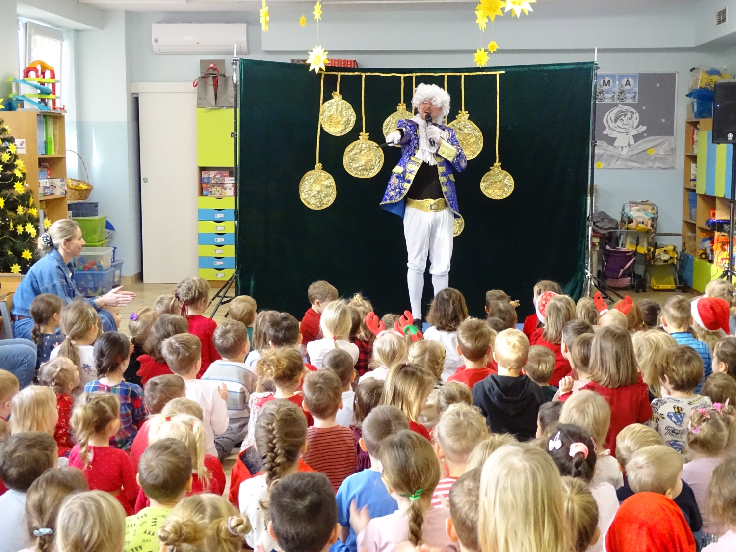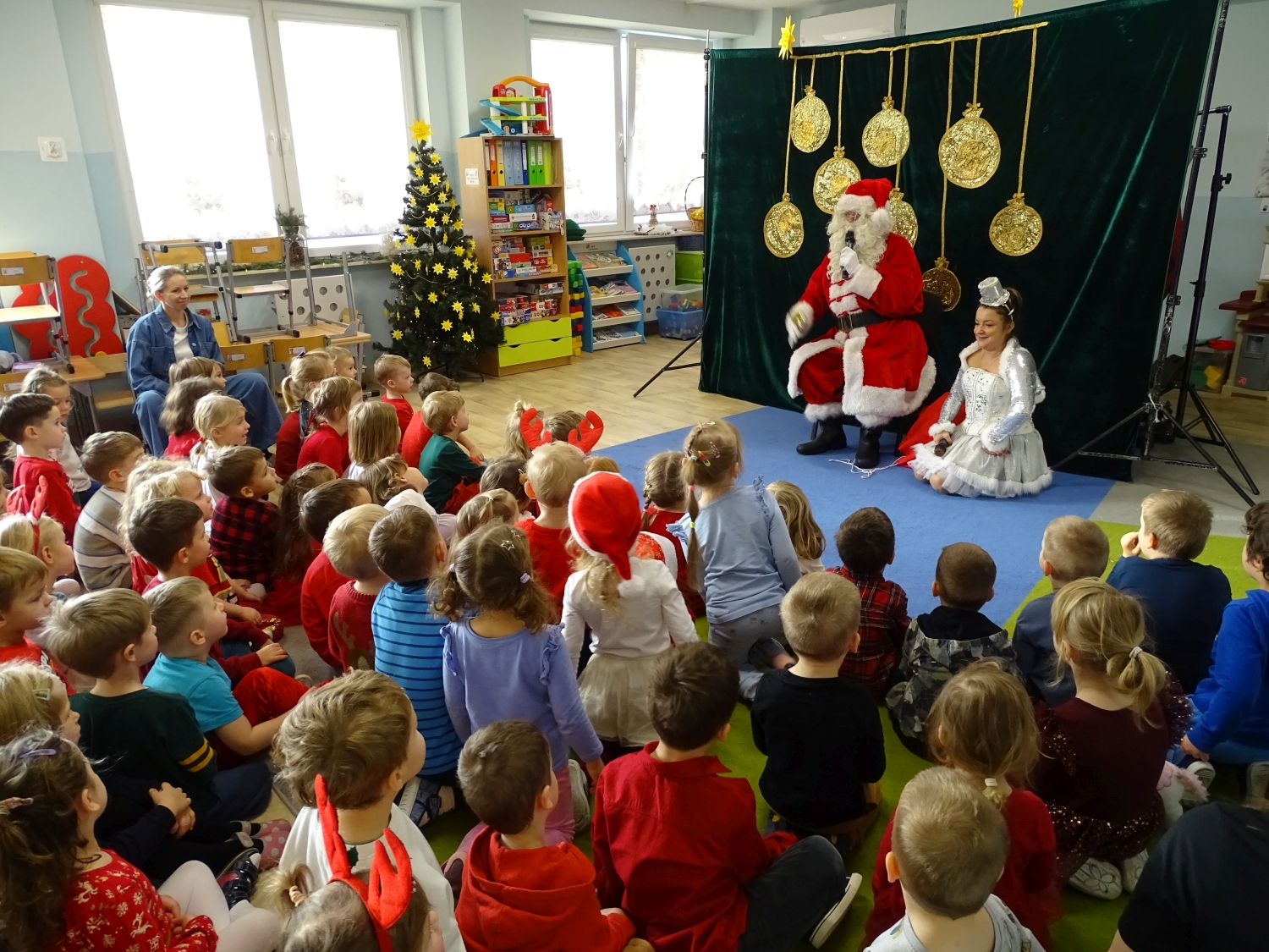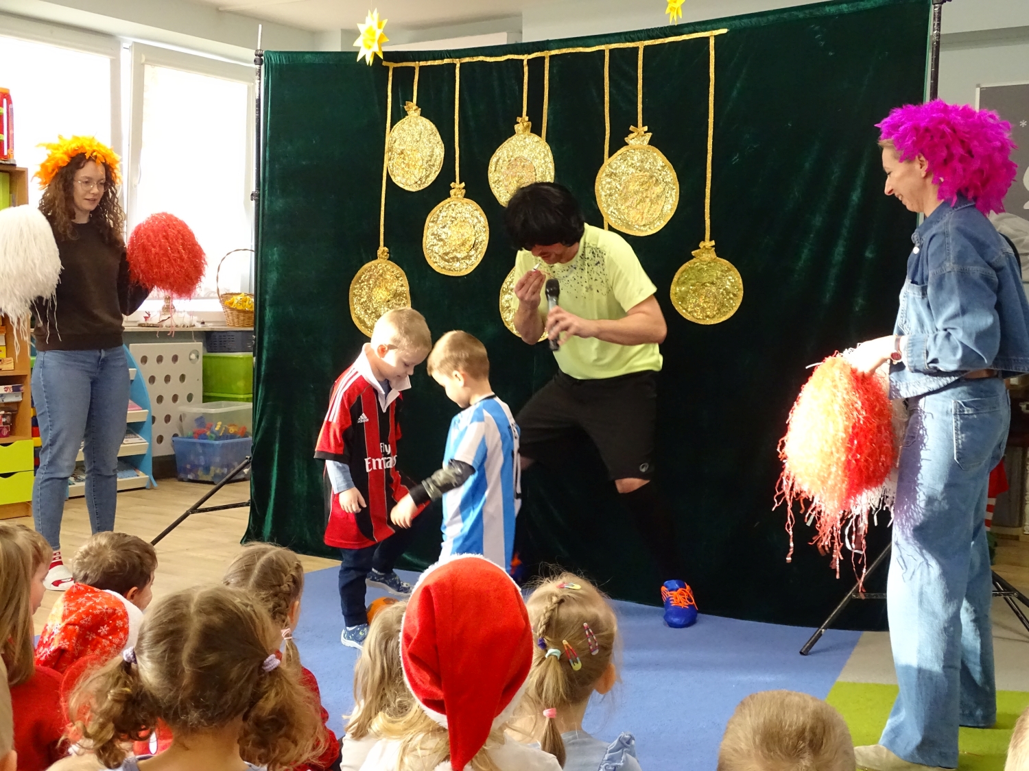 Do naszego przedszkola zawitał Teatr Prima ze spektaklem „Jakiż to święty rozdaje prezenty? Zwyczaje mikołajowe z różnych stron świata”. Przedstawienie w ciekawy i przystępny sposób przybliżyło najmłodszym postać św. Mikołaja oraz mikołajowe tradycje z różnych krajów. Kolorowe kostiumy, muzyka i humorystyczne sceny wzbudziły duże zainteresowanie dzieci, zachęcając je do aktywnego udziału w przedstawieniu. Występ dostarczył przedszkolakom wielu radości i był okazją do poznania różnorodnych zwyczajów związanych z obdarowywaniem prezentami. Na koniec zawitał do nas św. Mikołaj, który wzbudził ogromne zainteresowanie wśród dzieci.