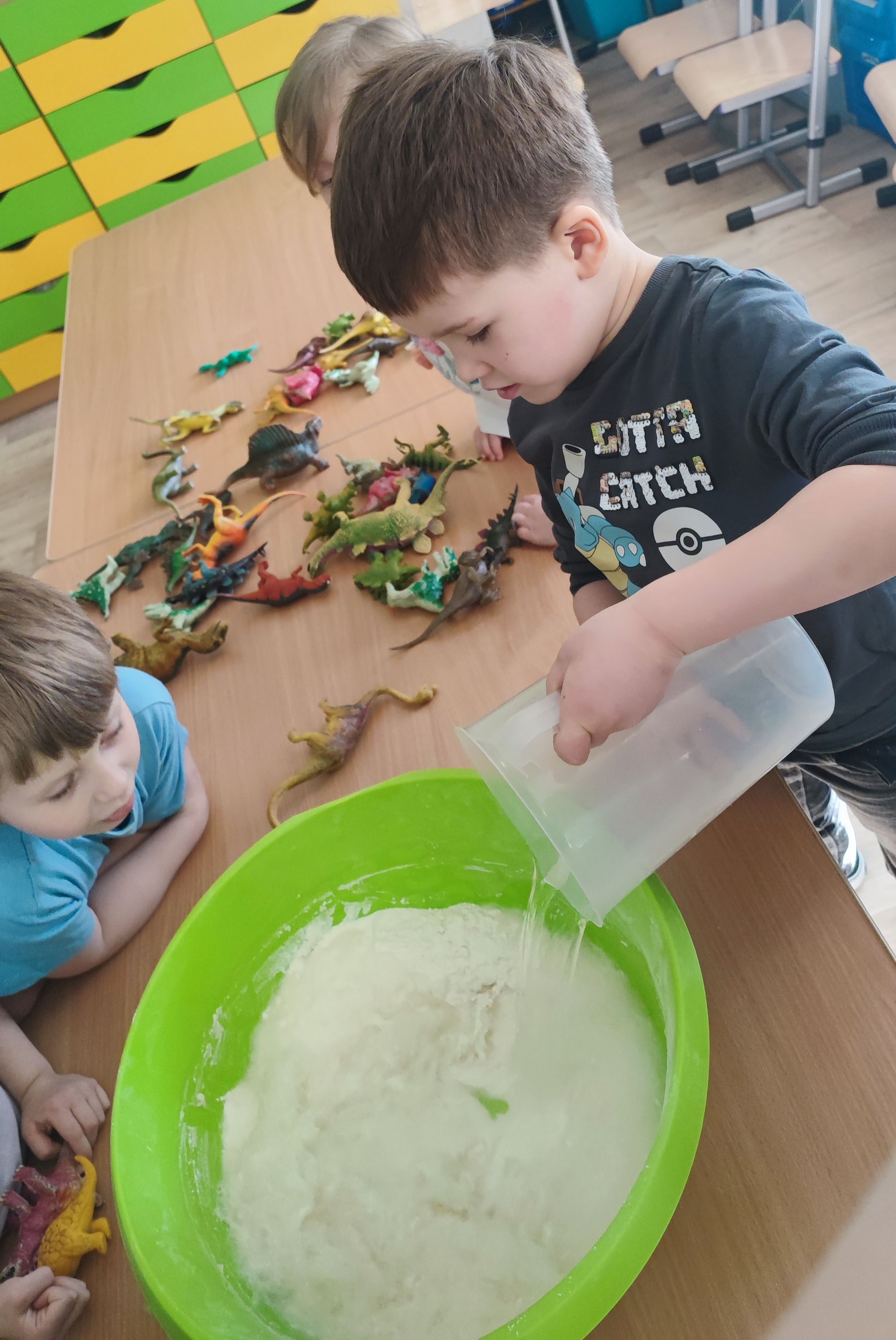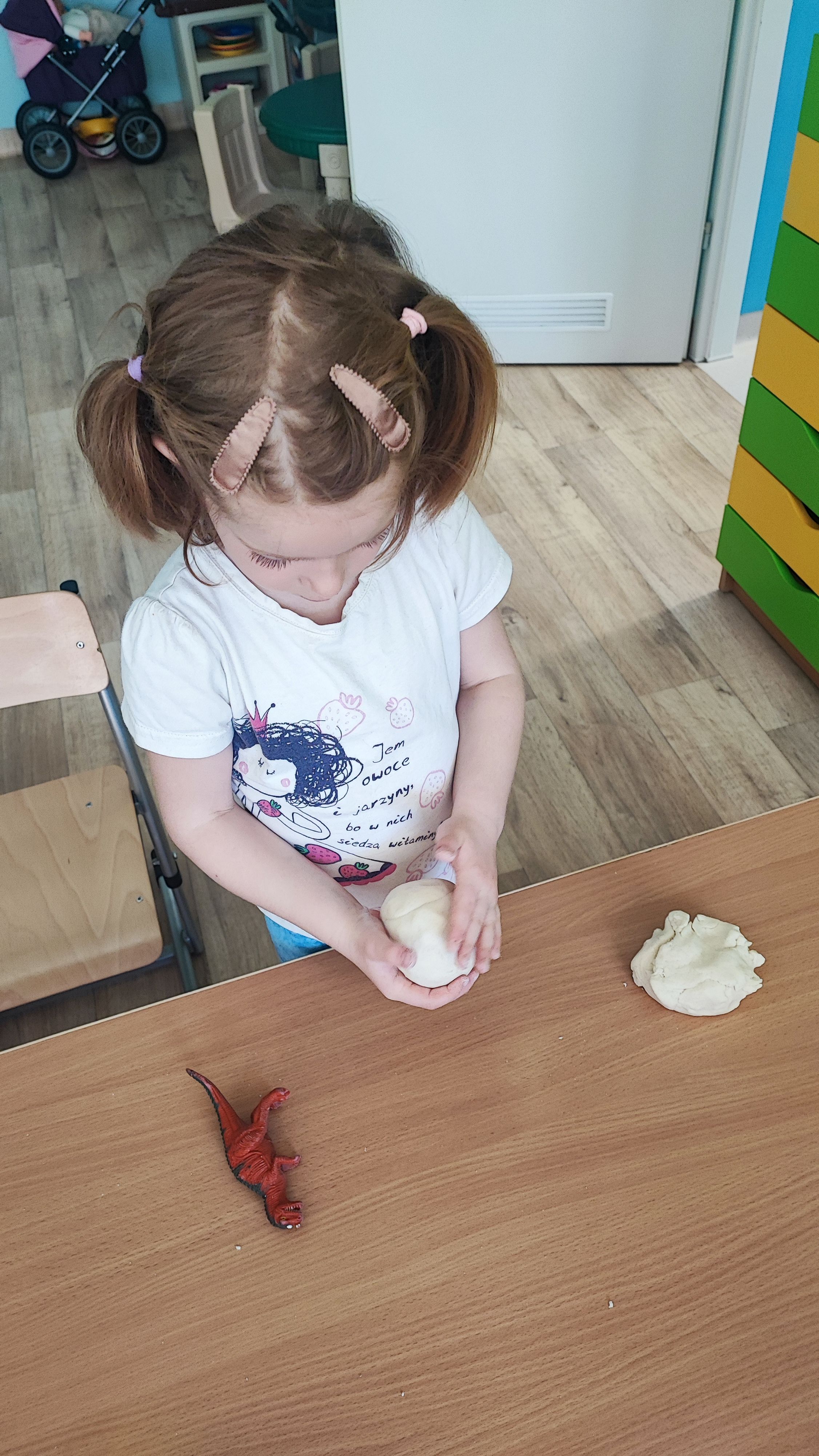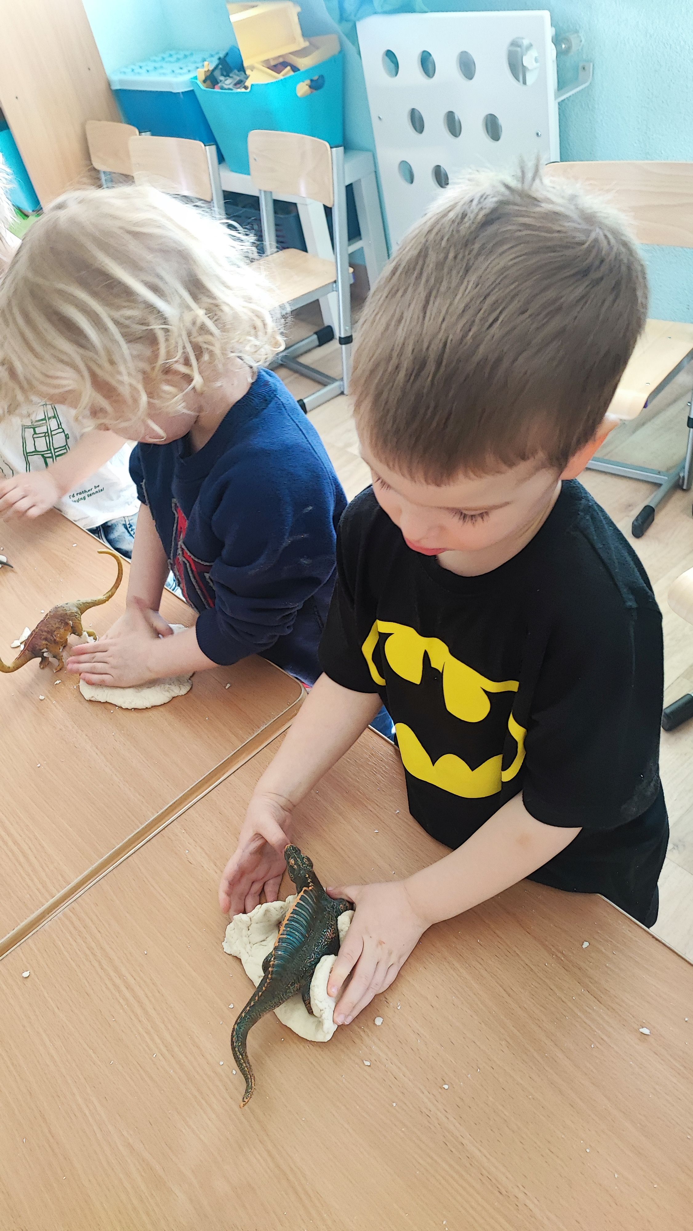 W naszym przedszkolu czterolatki uwielbiają zdobywać wiedzę poprzez zabawę, doświadczenie i tworzenie. Podczas ostatnich zajęć przygotowały masę solną. Pierwsze podjęte kroki to: odmierzanie składników, mieszanie, ugniatanie masy - ćwiczyli mała motorykę oraz współpracę w grupie. Dzieci z ogromnym zaangażowaniem odciskały w masie figurki dinozaurów tworząc "prehistoryczne ślady". Każdy od odcisk był inny i wyjątkowy.