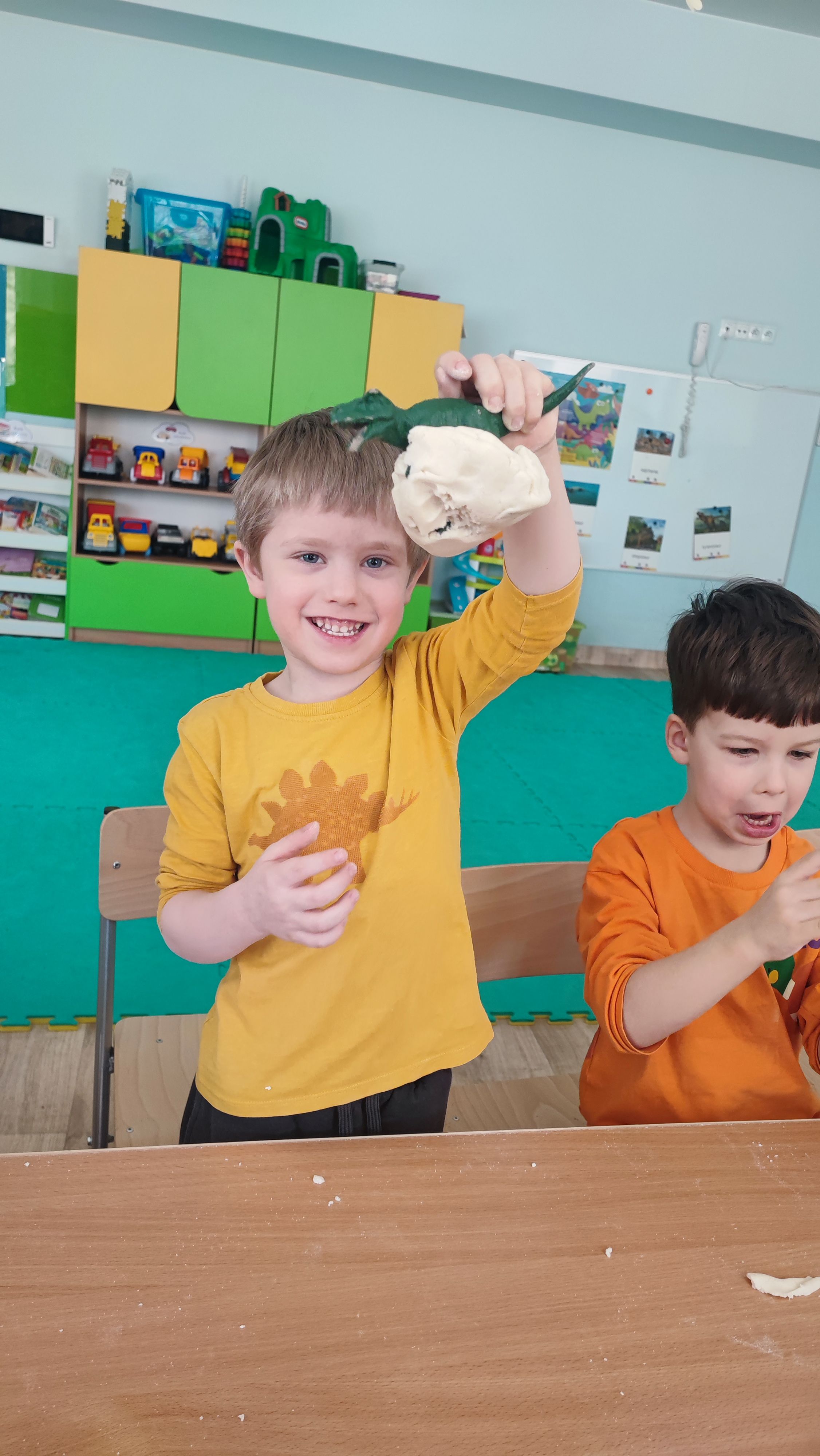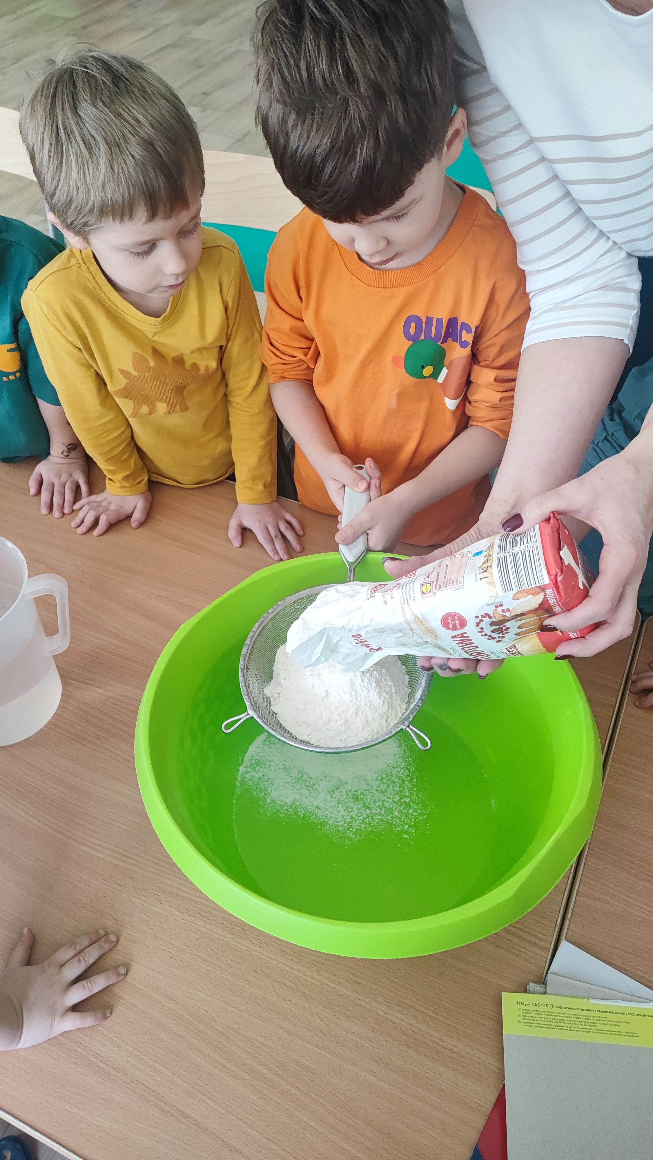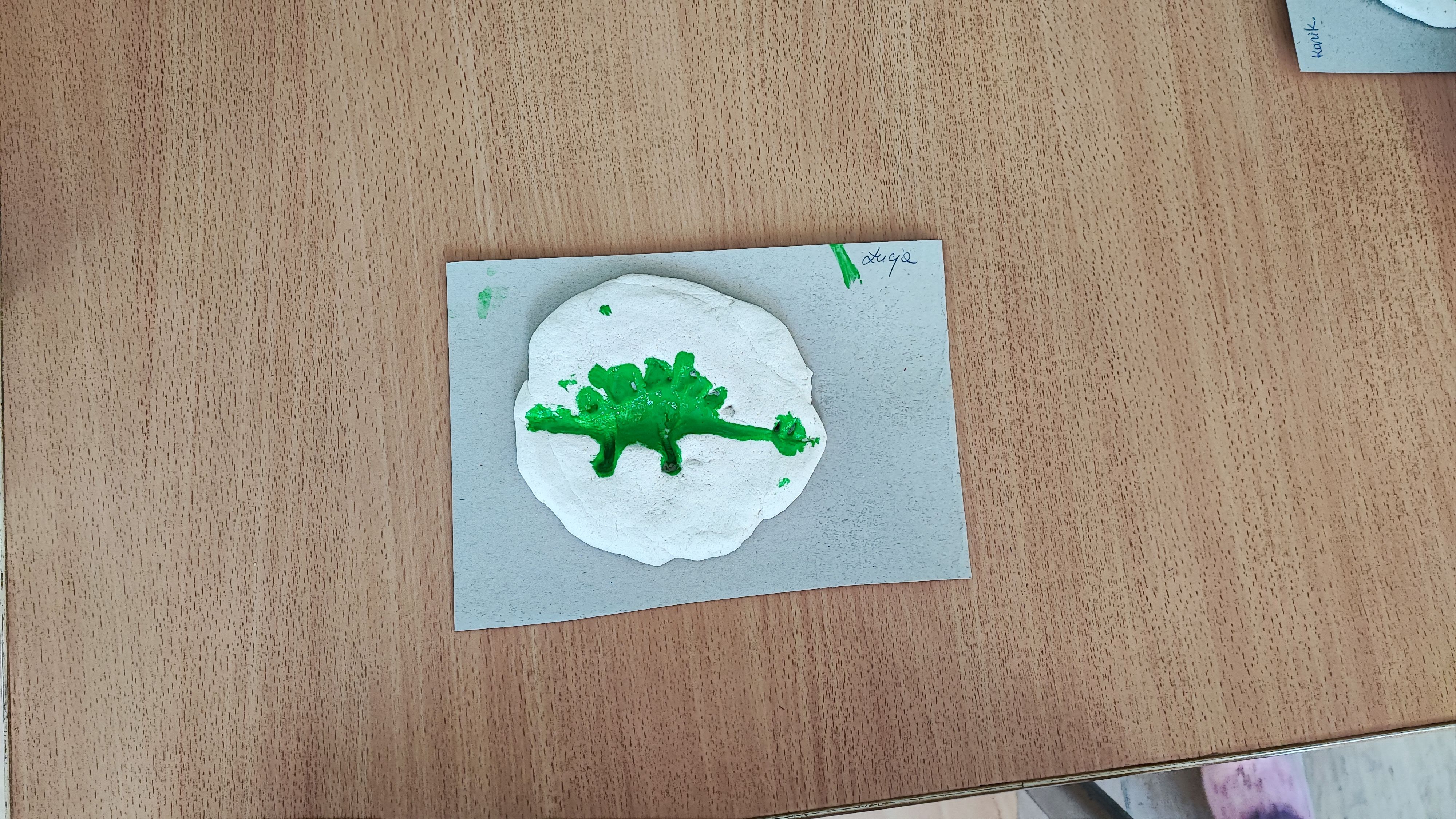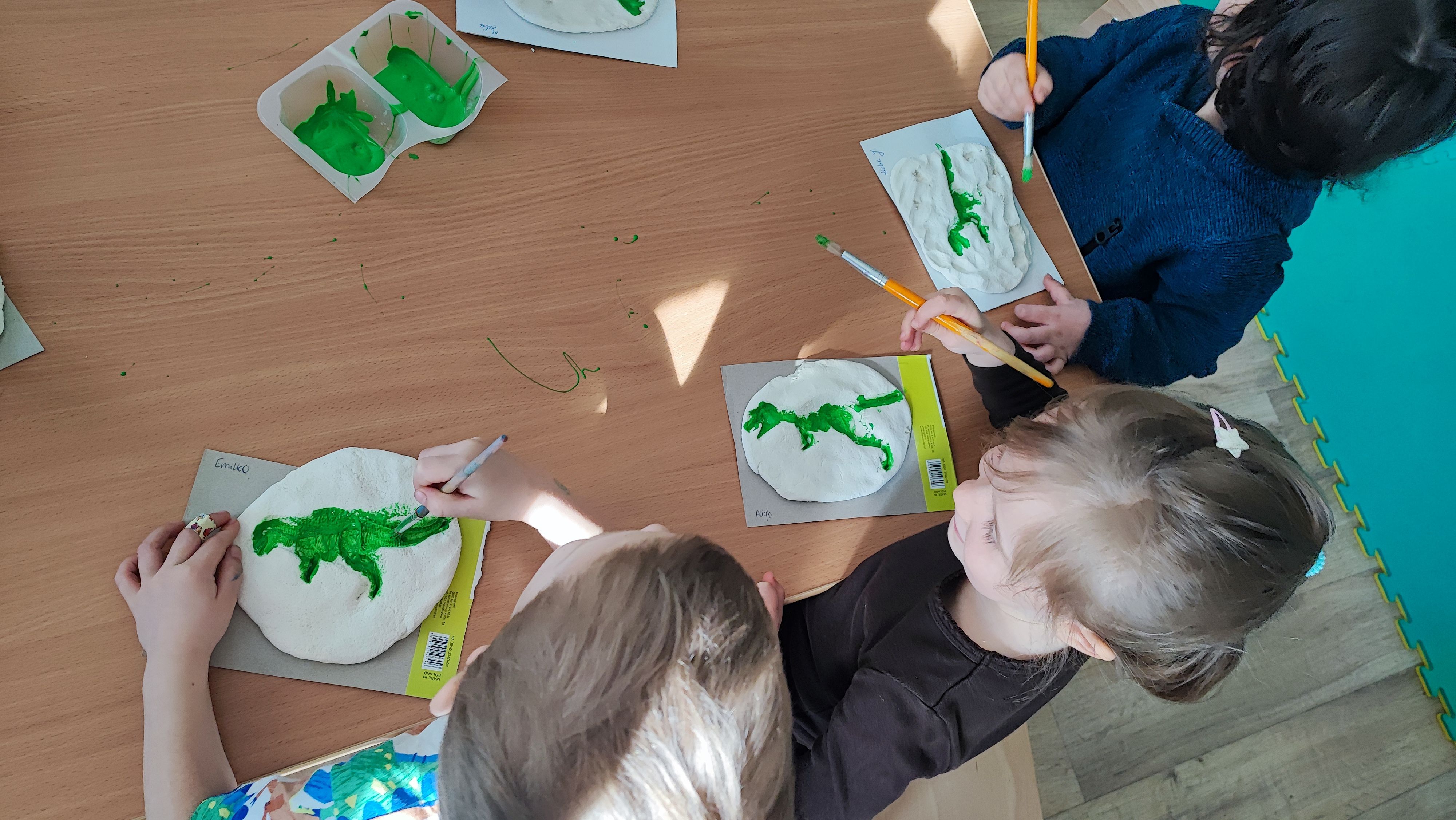W naszym przedszkolu czterolatki uwielbiają zdobywać wiedzę poprzez zabawę, doświadczenie i tworzenie. Podczas ostatnich zajęć przygotowały masę solną. Pierwsze podjęte kroki to: odmierzanie składników, mieszanie, ugniatanie masy - ćwiczyli mała motorykę oraz współpracę w grupie. Dzieci z ogromnym zaangażowaniem odciskały w masie figurki dinozaurów tworząc "prehistoryczne ślady". Każdy od odcisk był inny i wyjątkowy.