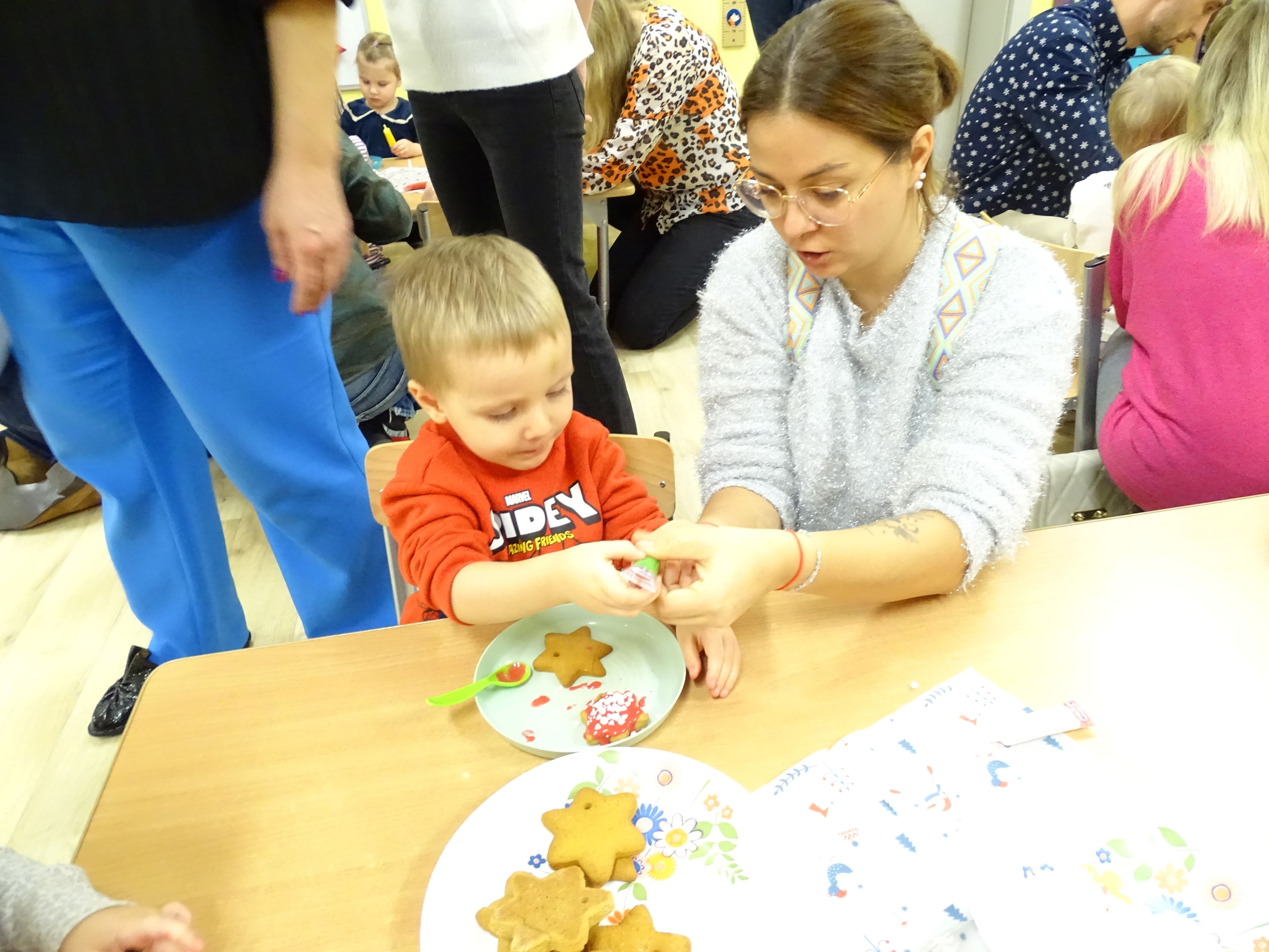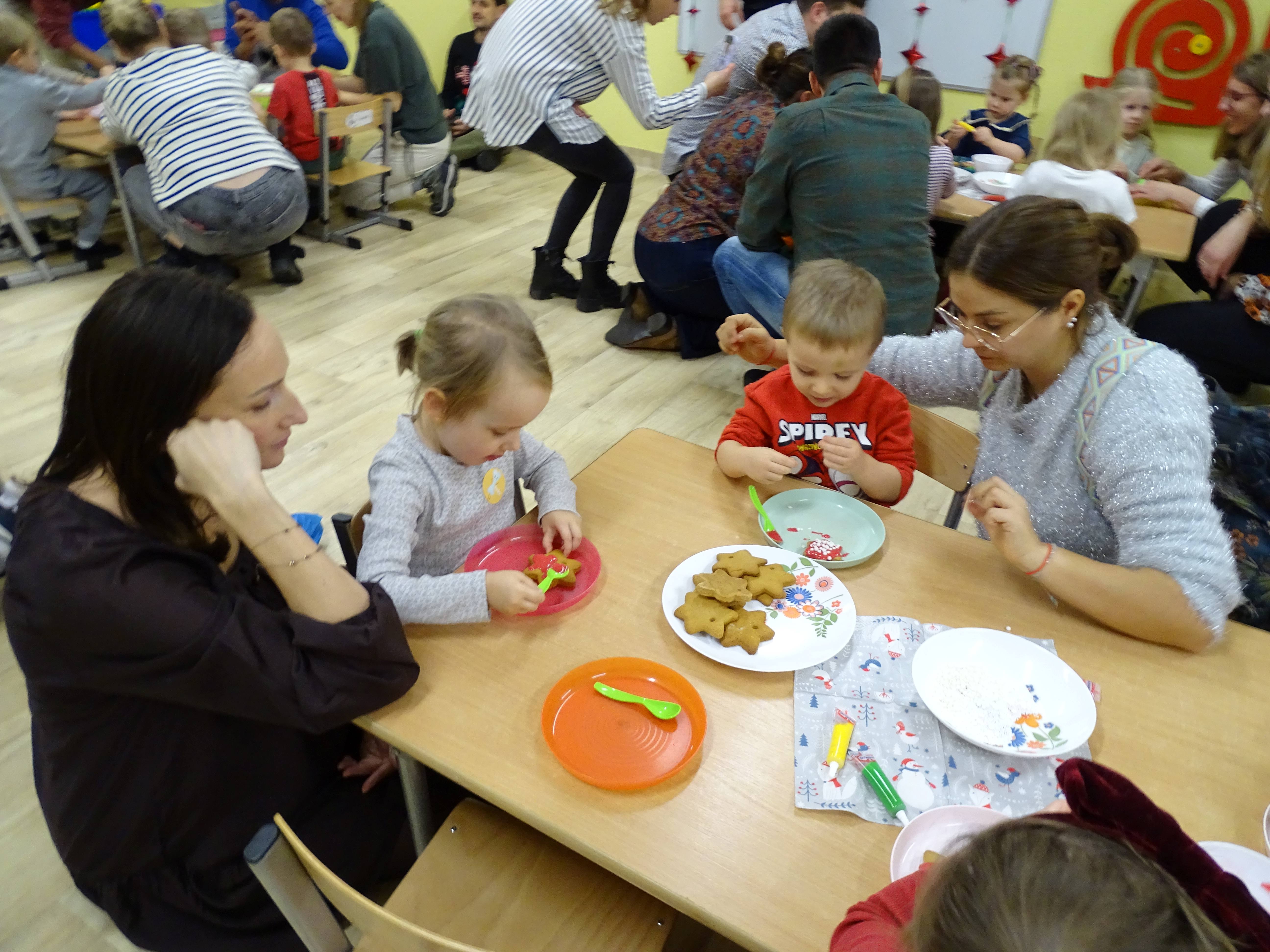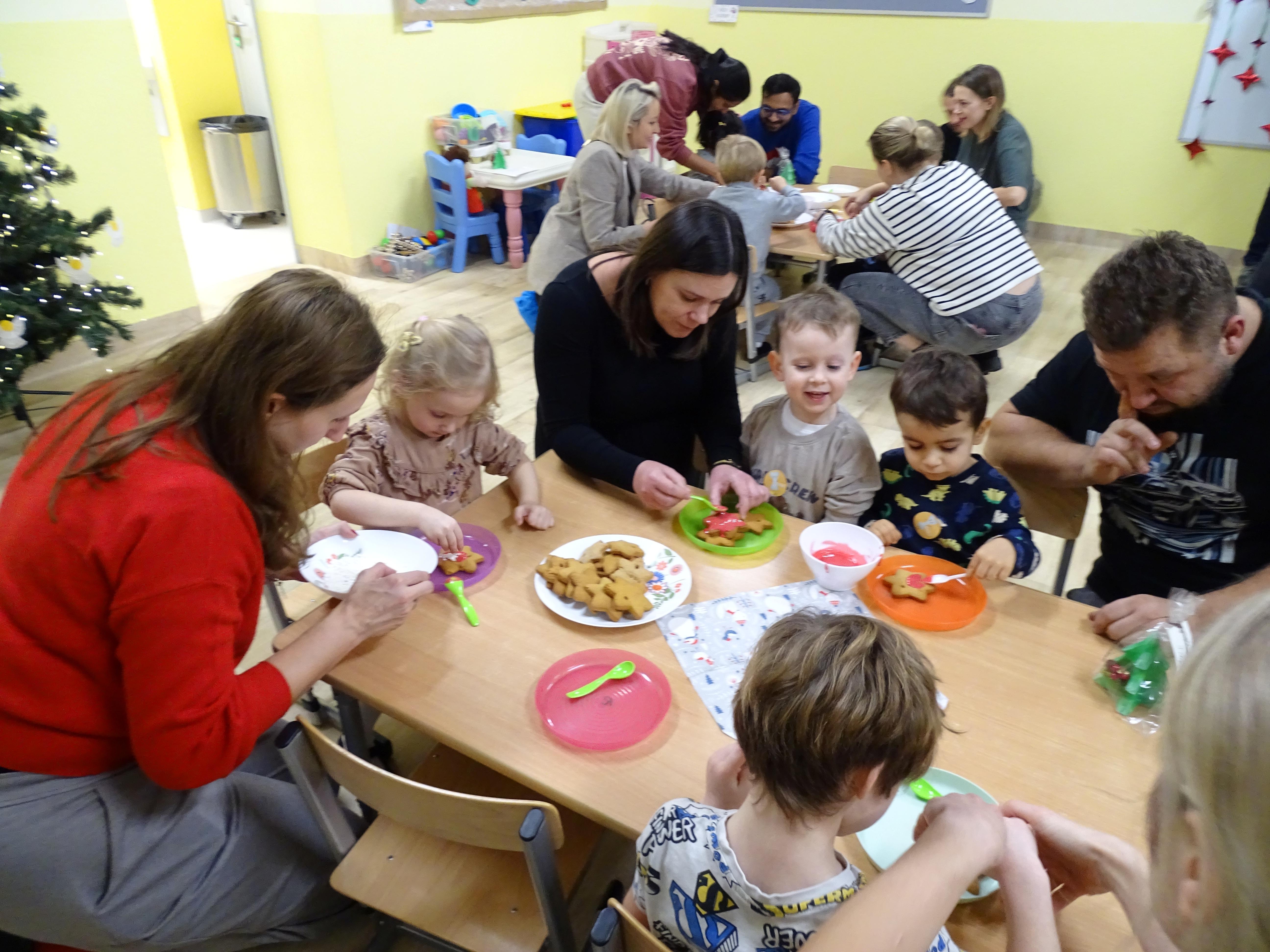 9 grudnia w najmłodszej grupie odbyło się spotkanie z udziałem rodziców. Uroczystość rozpoczęła się krótkim występem dzieci o tematyce świąteczno - zimowej. Po części artystycznej nastąpiła wspólna część warsztatowa – dekorowanie pierników. Dzieci razem z rodzicami ozdabiały wcześniej upieczone ciasteczka kolorowymi lukrami i posypkami. Był to czas pełen radości, rozmów i wzajemnej współpracy. Spotkanie przebiegło w miłej, świątecznej atmosferze, sprzyjało integracji rodzin z przedszkolem oraz wzmacniało więzi między dziećmi a rodzicami.