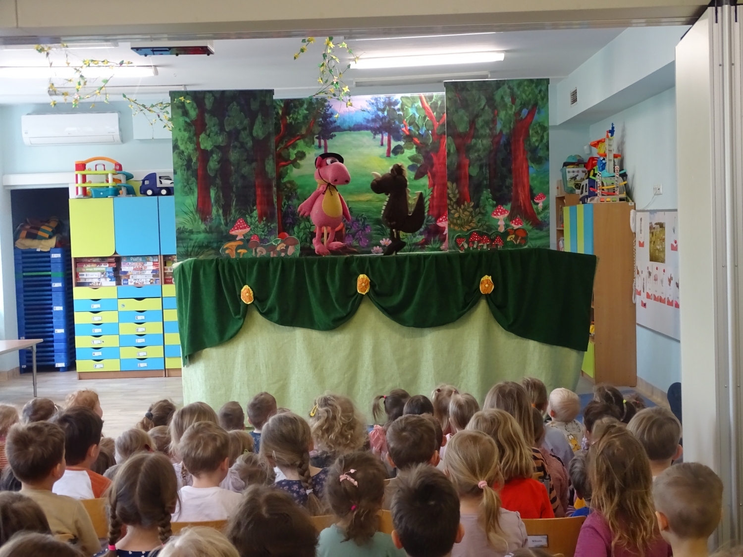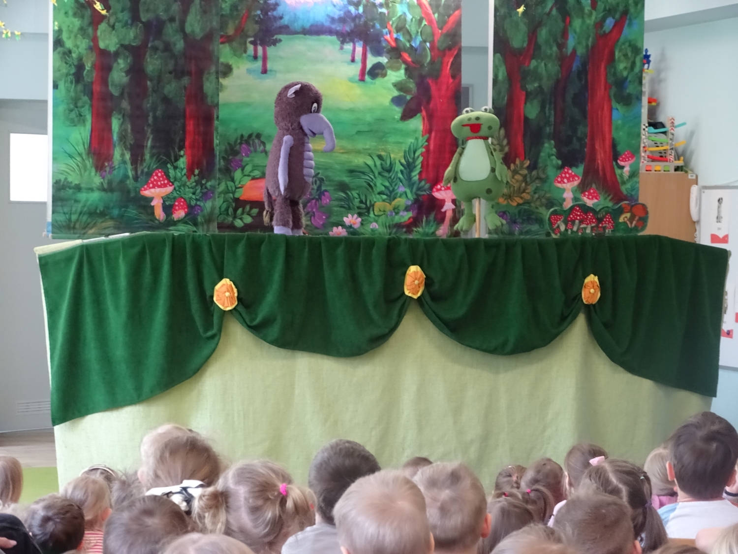 W naszym przedszkolu gościliśmy Teatr Lalek Bajka z przedstawieniem „Wielkie sprawy małej żaby”, które dostarczyło dzieciom wielu radosnych wrażeń. Spektakl opowiadał o małej żabce, która mierzyła się z różnymi wyzwaniami i uczyła się odwagi, przyjaźni oraz wiary w siebie. Kolorowe lalki, ciekawa scenografia i wesoła muzyka sprawiły, że dzieci z dużym zainteresowaniem śledziły losy bohaterki. Przedstawienie nie tylko bawiło, ale również przekazało ważne wartości, pozostawiając u najmłodszych widzów wiele pozytywnych emocji.