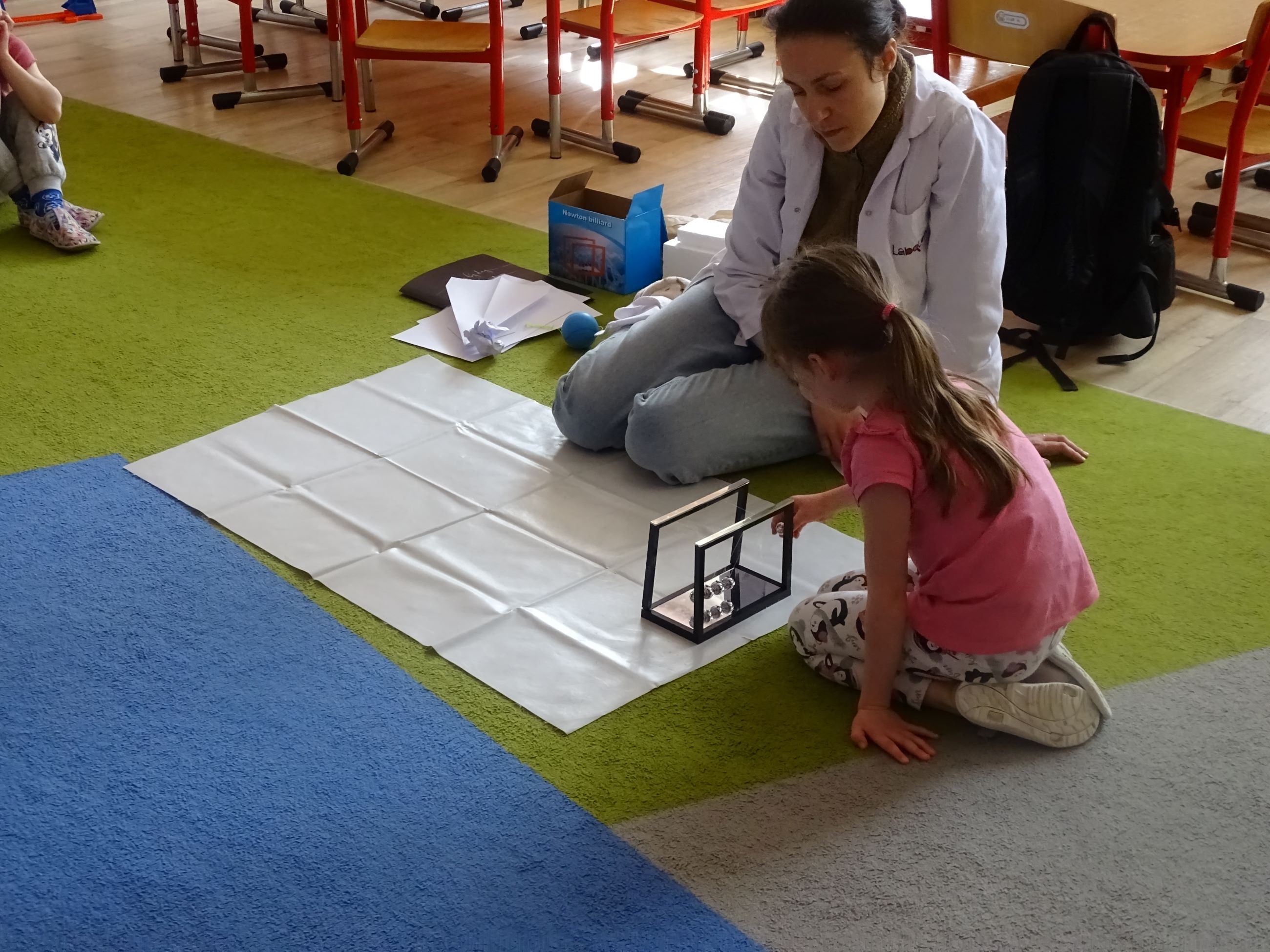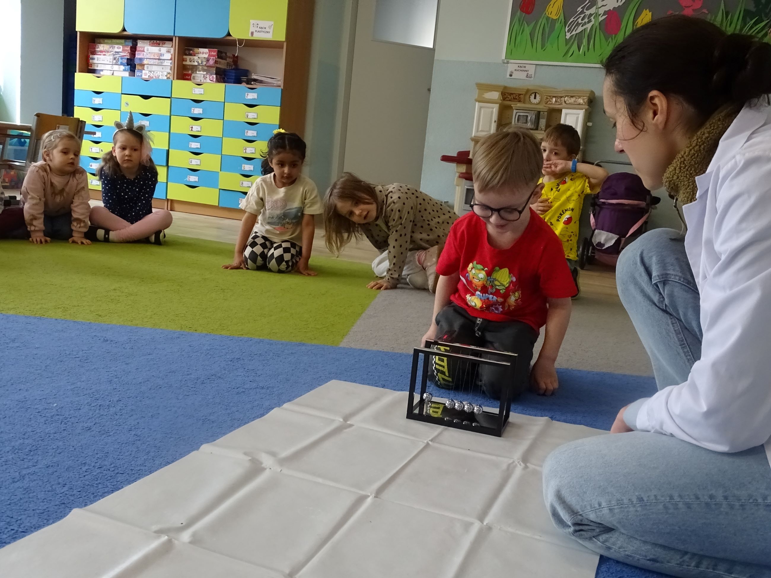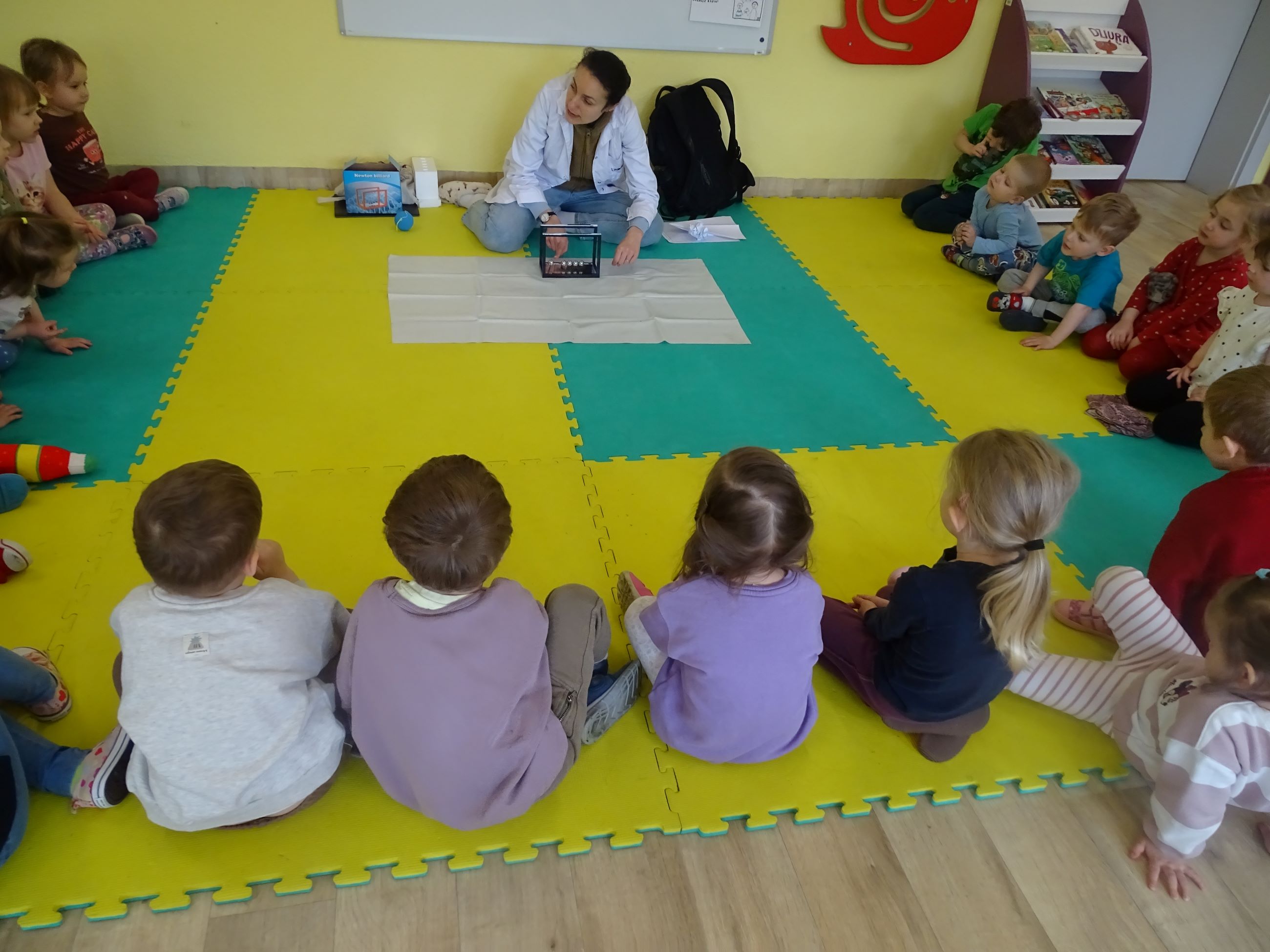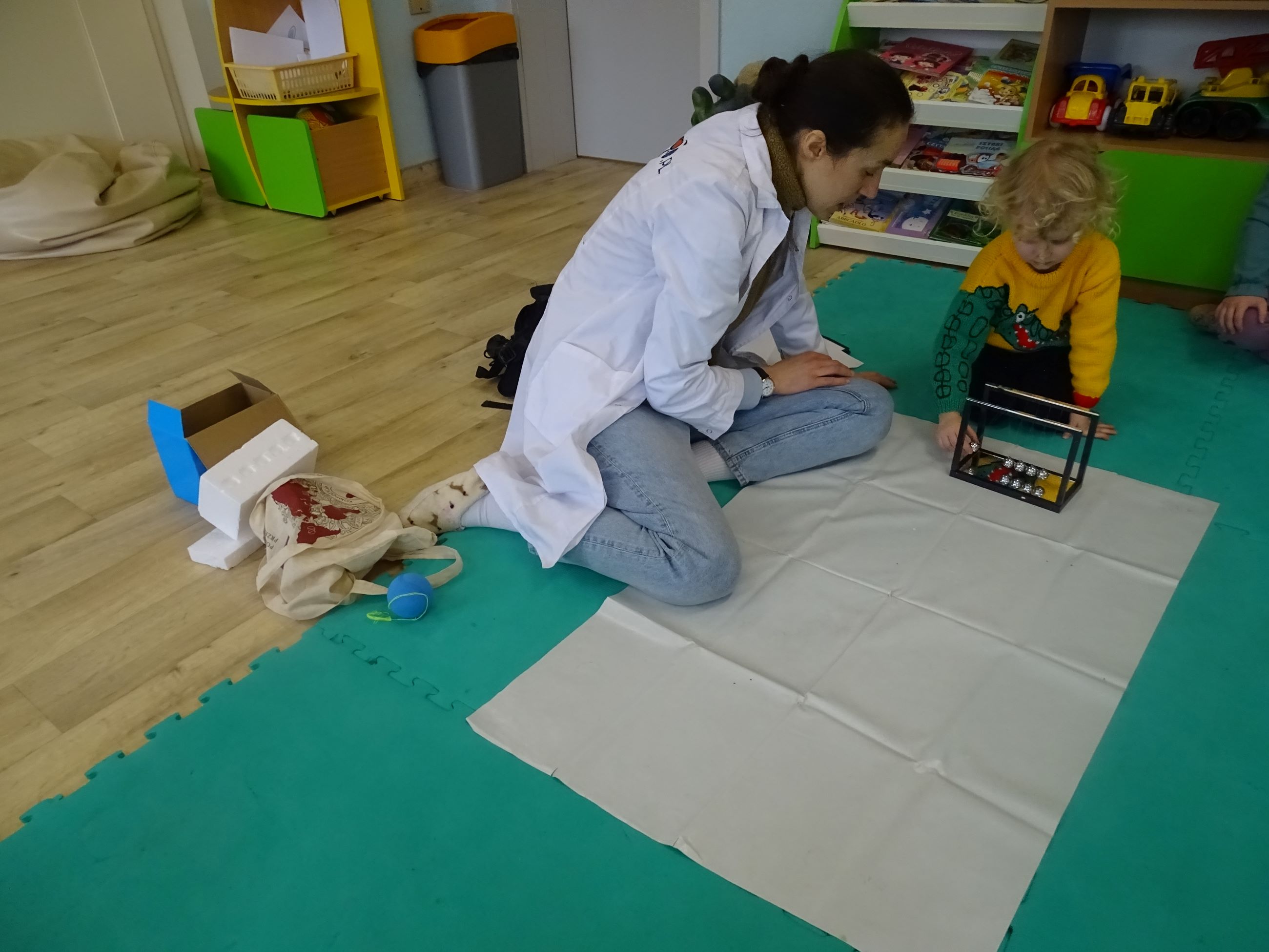 Tym razem w czasie warsztatów eksperymentalnych Labolo, przedszkolaki poznały ciekawostki na temat siły, przyciągania, prędkości. Obserwowały kartki, które spadały na podłogę i jak kształt w jakim były wpływał na ich prędkość. Obserwowały wahadło Newtona oraz samodzielnie wprawiały je w ruch. Dzieci z zainteresowaniem uczestniczyły w zajęciach.