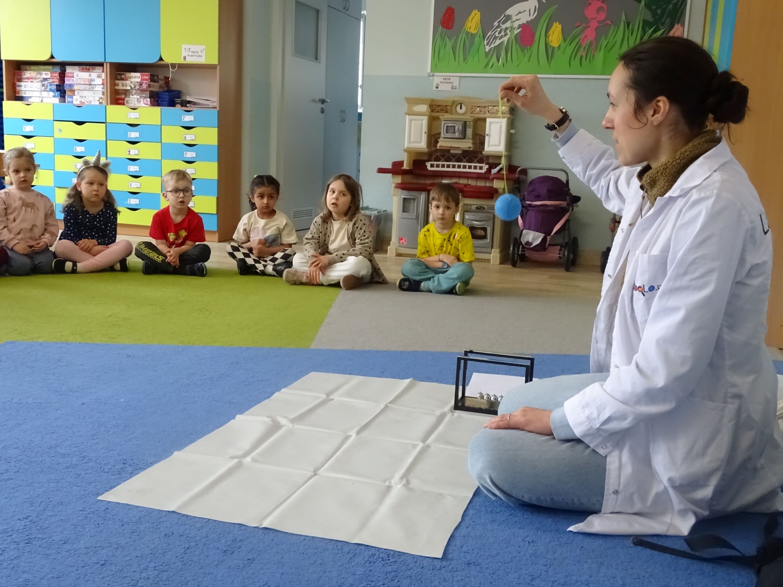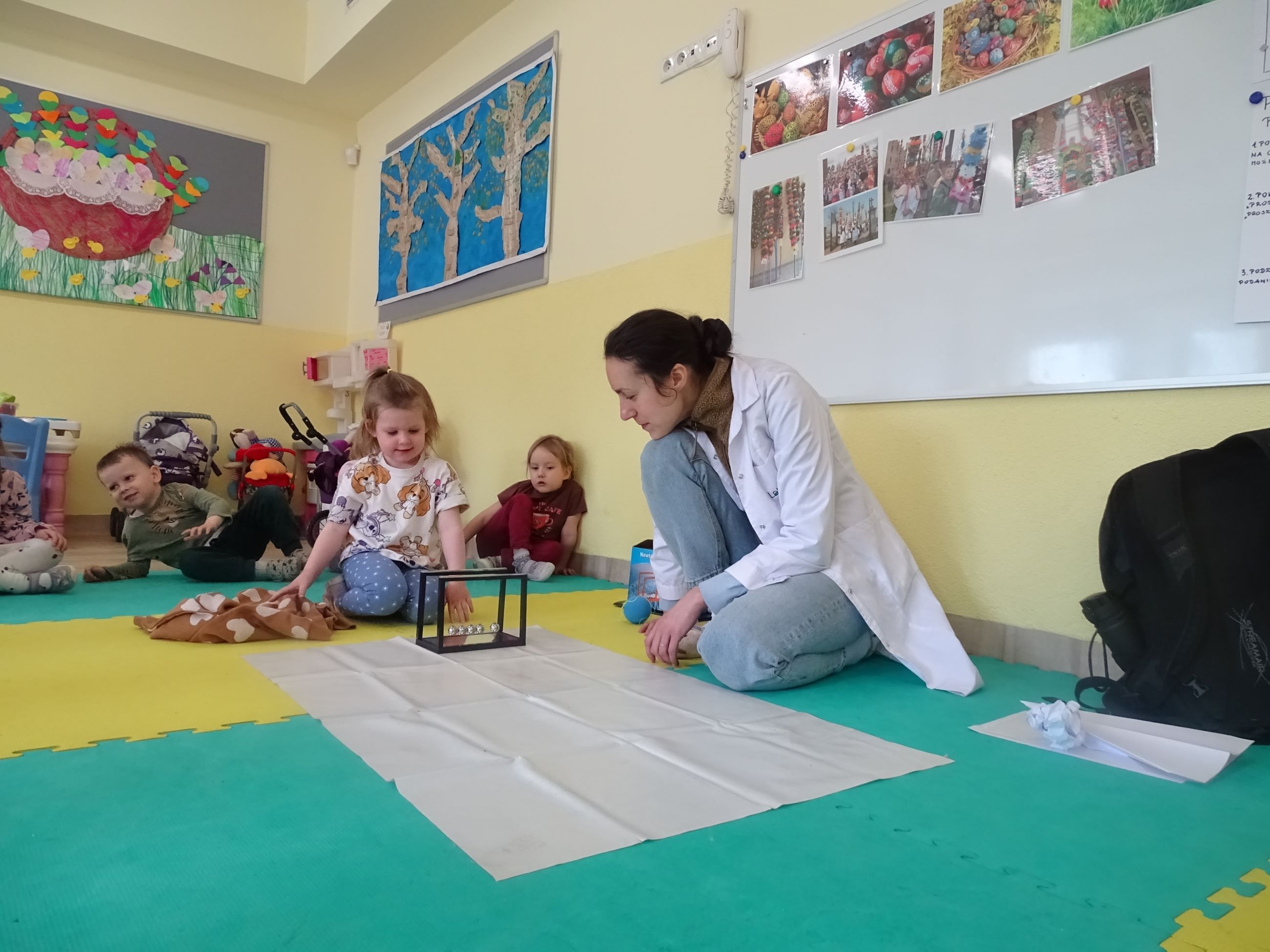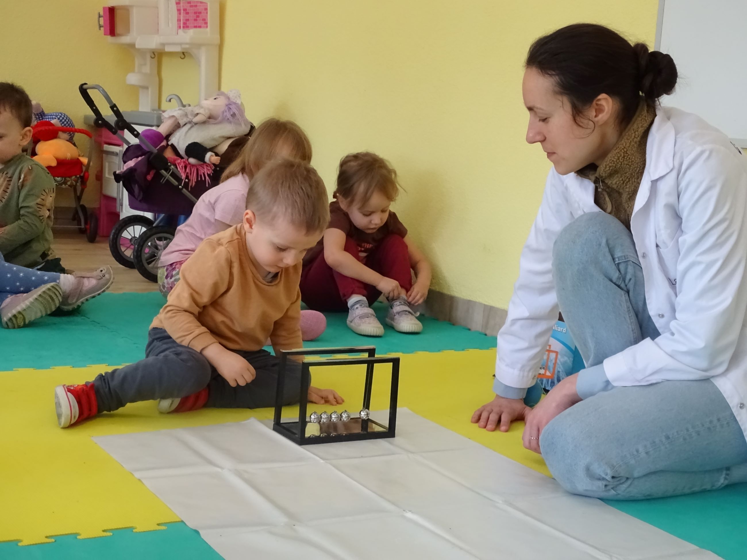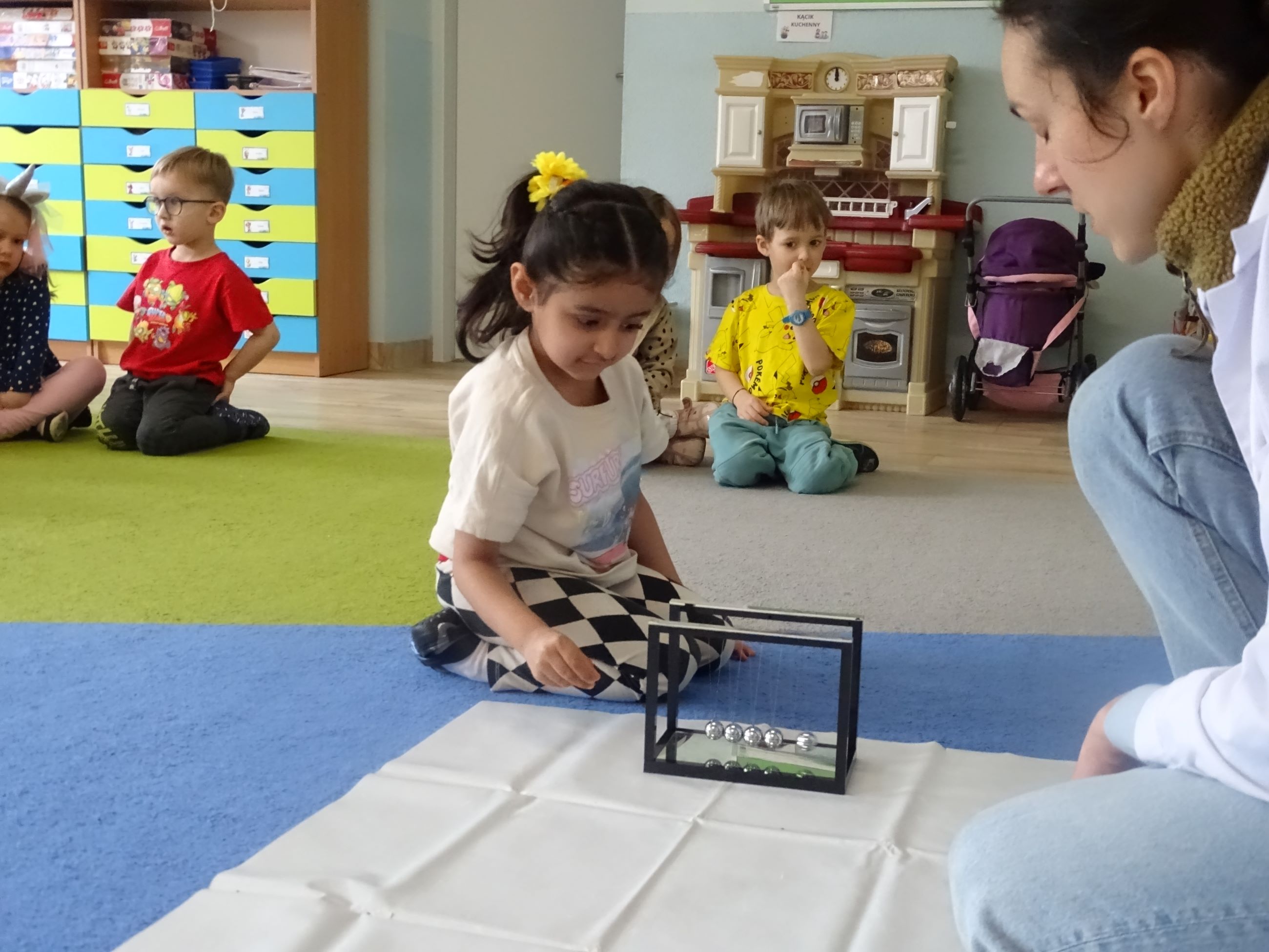 Tym razem w czasie warsztatów eksperymentalnych Labolo, przedszkolaki poznały ciekawostki na temat siły, przyciągania, prędkości. Obserwowały kartki, które spadały na podłogę i jak kształt w jakim były wpływał na ich prędkość. Obserwowały wahadło Newtona oraz samodzielnie wprawiały je w ruch. Dzieci z zainteresowaniem uczestniczyły w zajęciach.