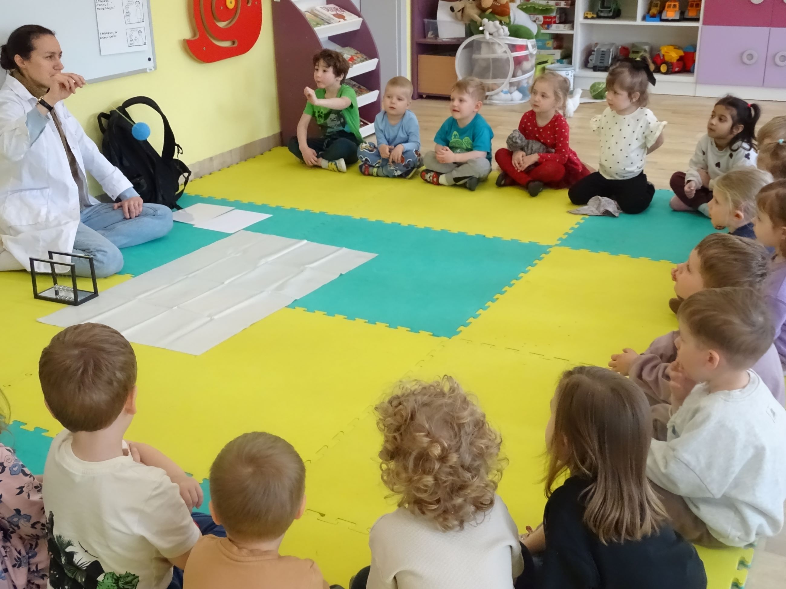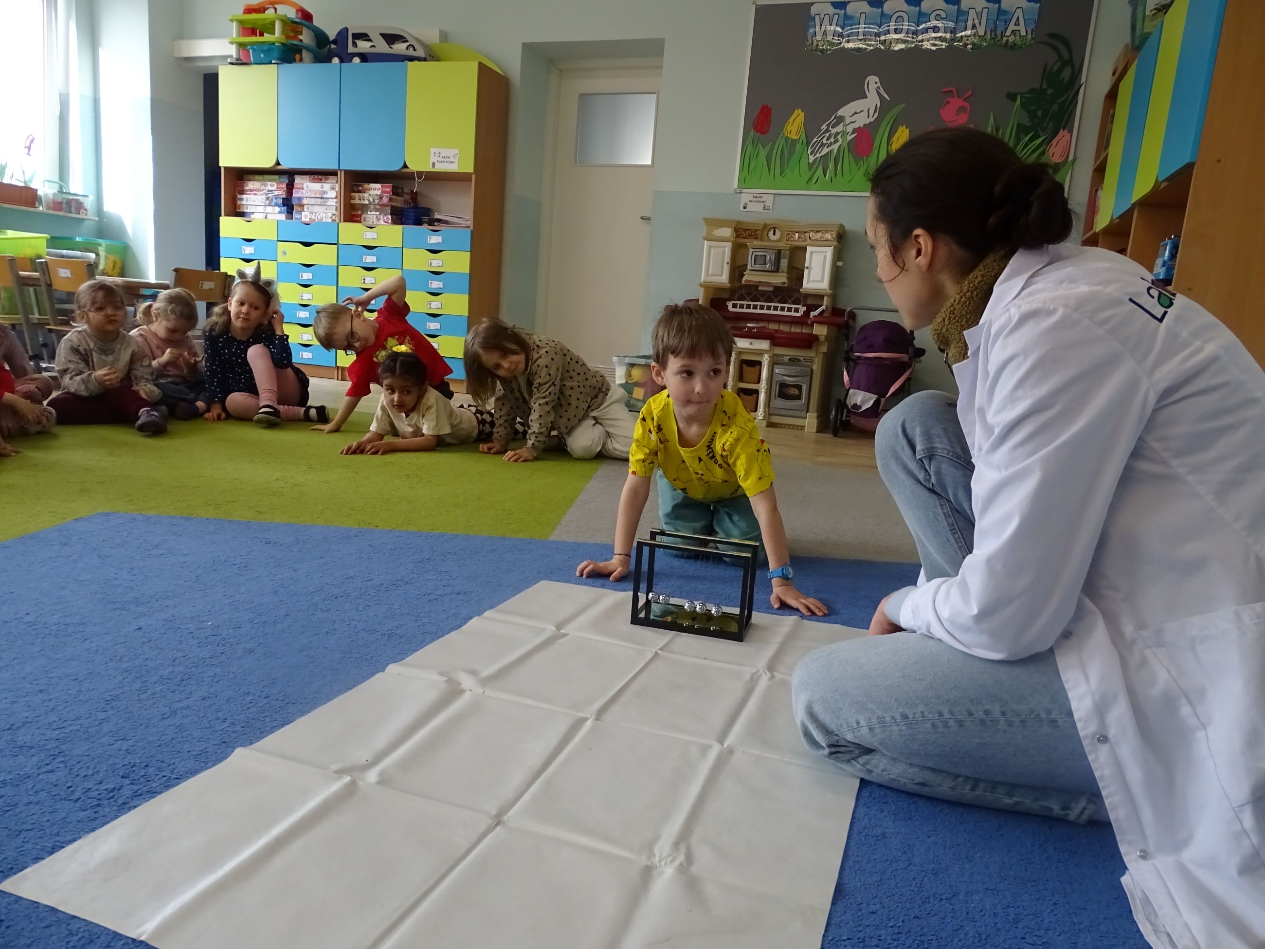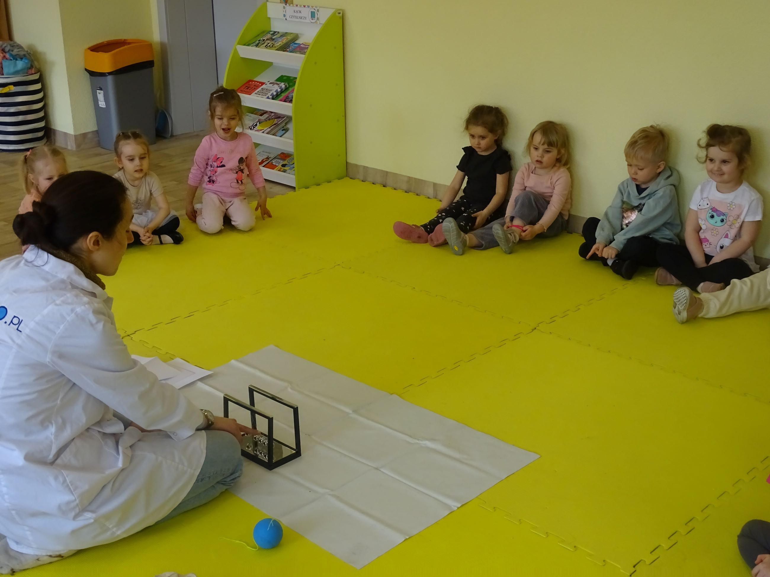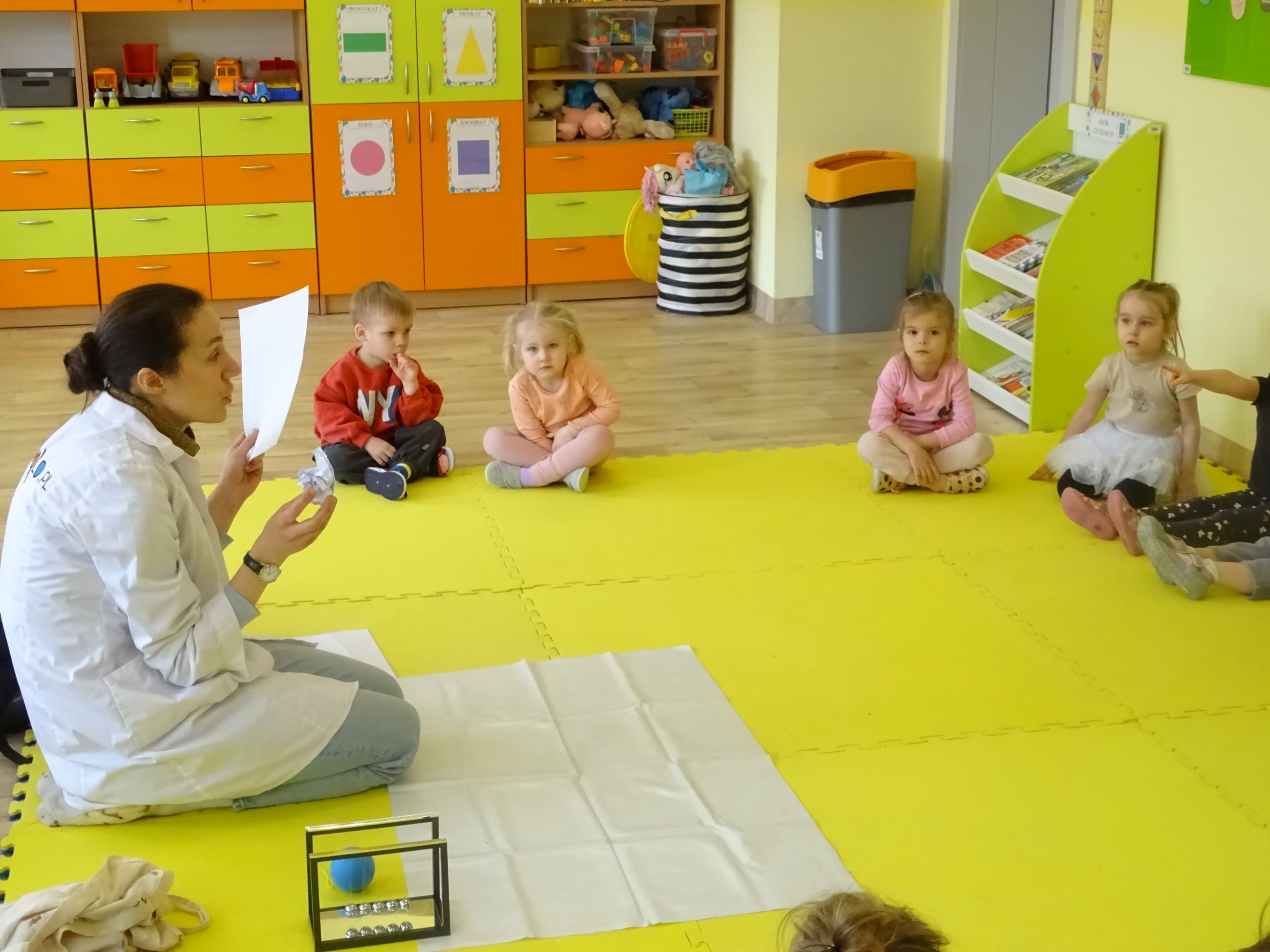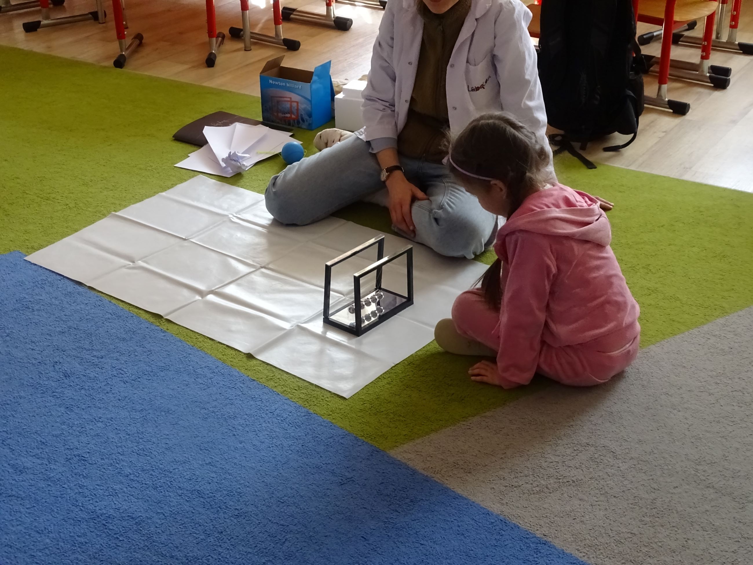 Tym razem w czasie warsztatów eksperymentalnych Labolo, przedszkolaki poznały ciekawostki na temat siły, przyciągania, prędkości. Obserwowały kartki, które spadały na podłogę i jak kształt w jakim były wpływał na ich prędkość. Obserwowały wahadło Newtona oraz samodzielnie wprawiały je w ruch. Dzieci z zainteresowaniem uczestniczyły w zajęciach.