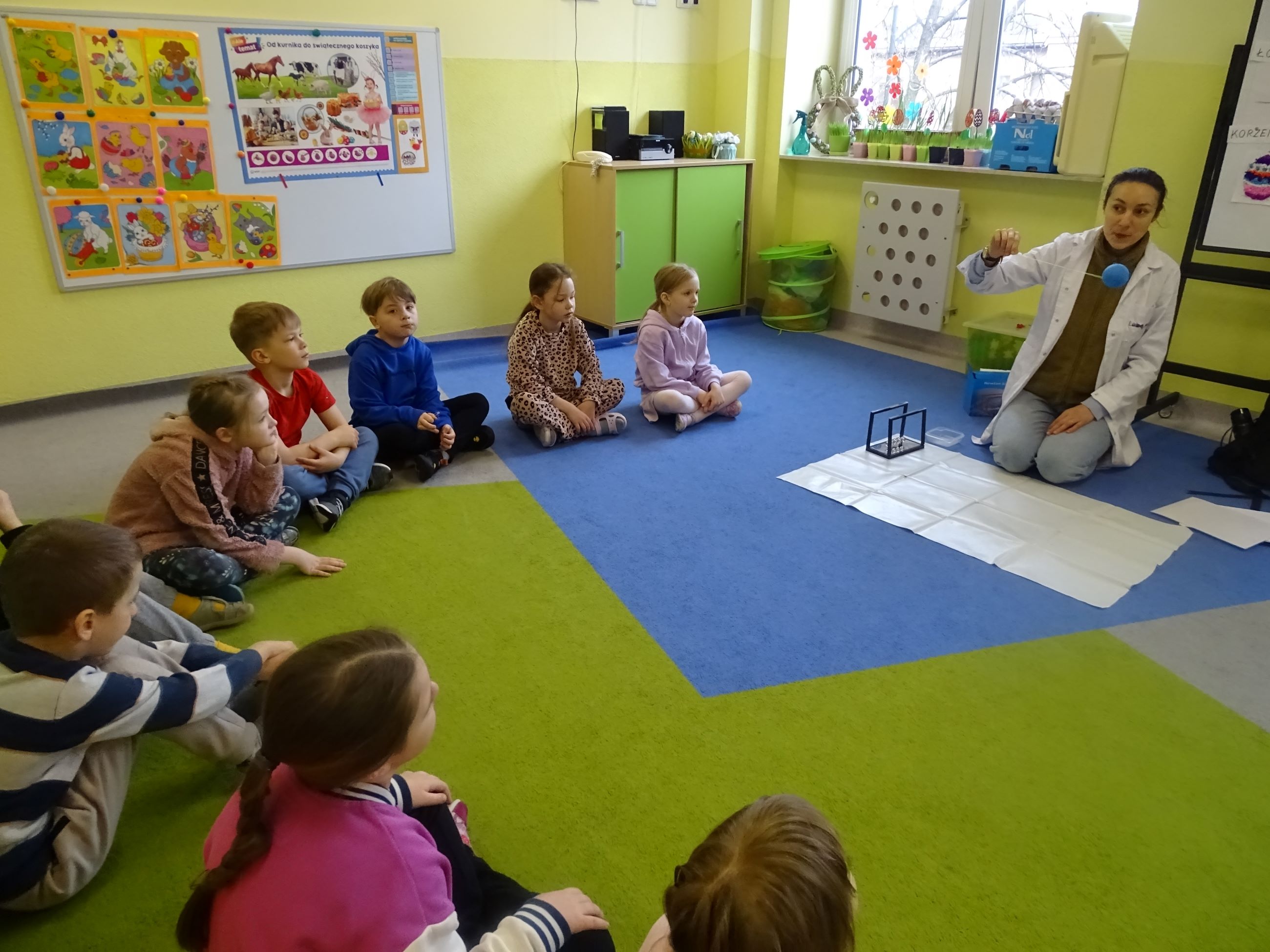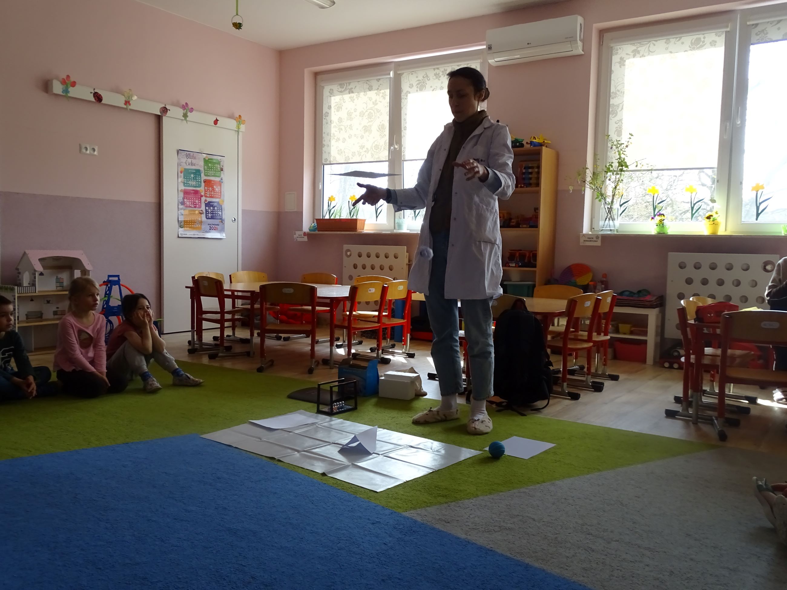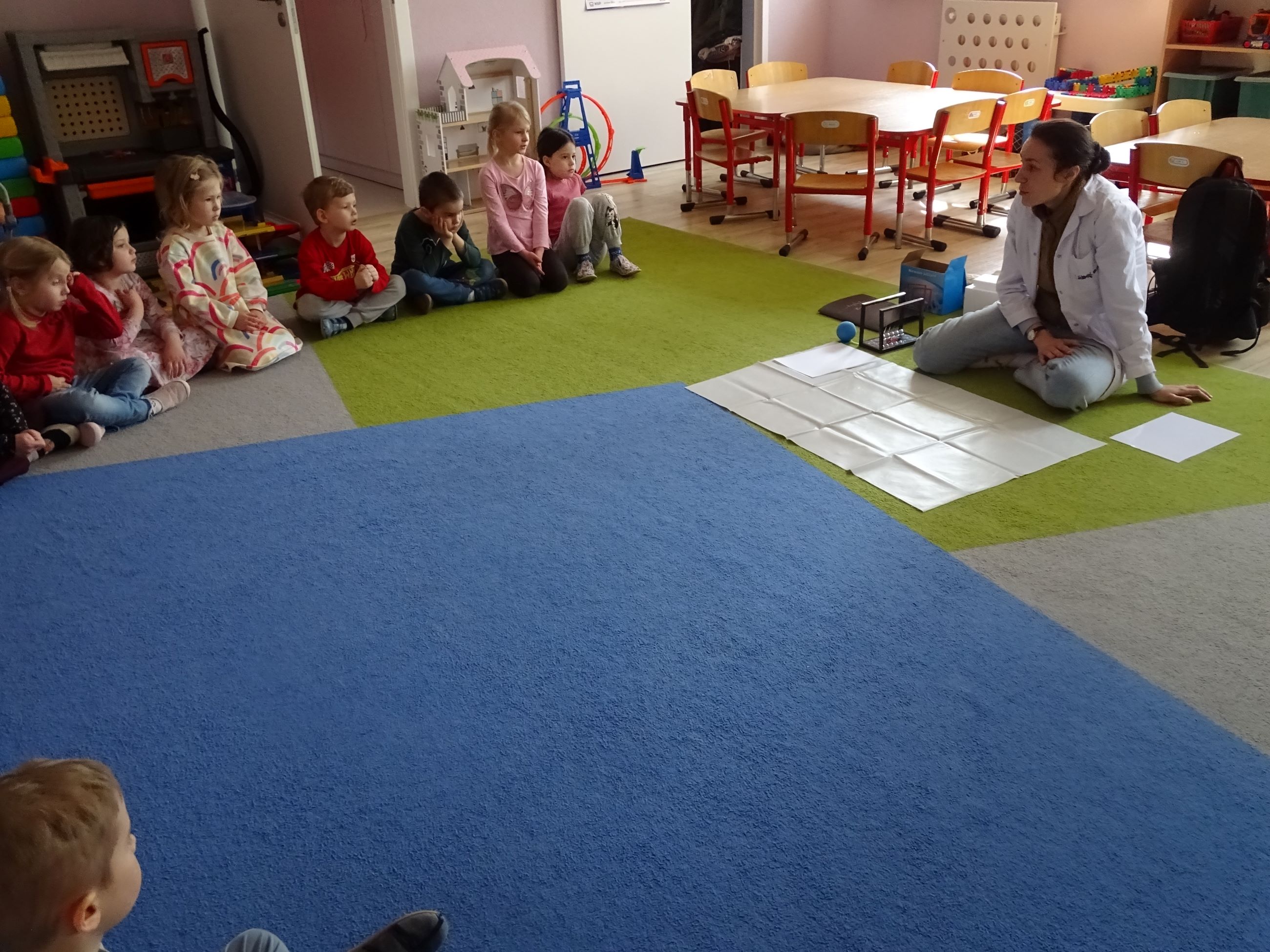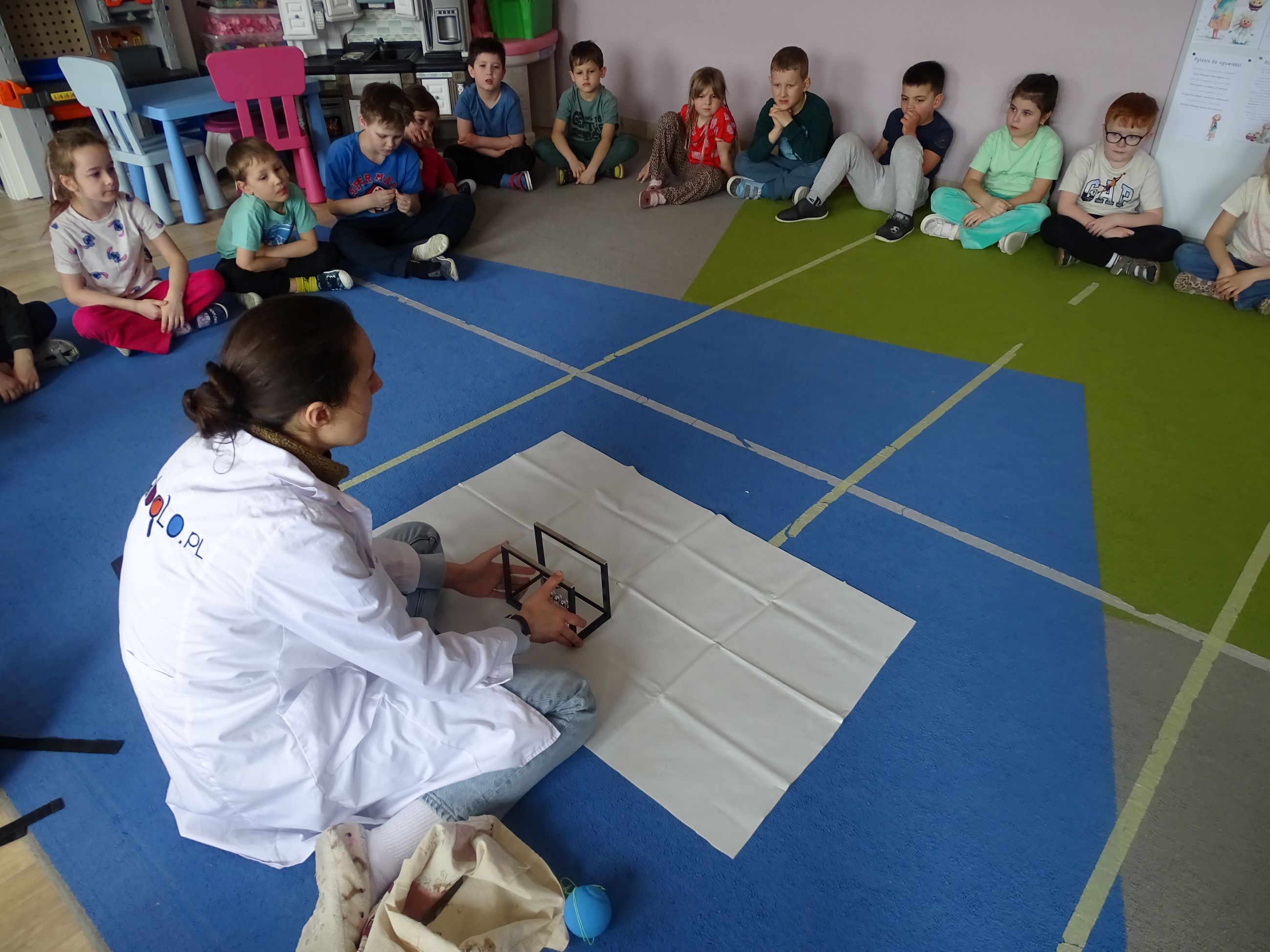 Tym razem w czasie warsztatów eksperymentalnych Labolo, przedszkolaki poznały ciekawostki na temat siły, przyciągania, prędkości. Obserwowały kartki, które spadały na podłogę i jak kształt w jakim były wpływał na ich prędkość. Obserwowały wahadło Newtona oraz samodzielnie wprawiały je w ruch. Dzieci z zainteresowaniem uczestniczyły w zajęciach.