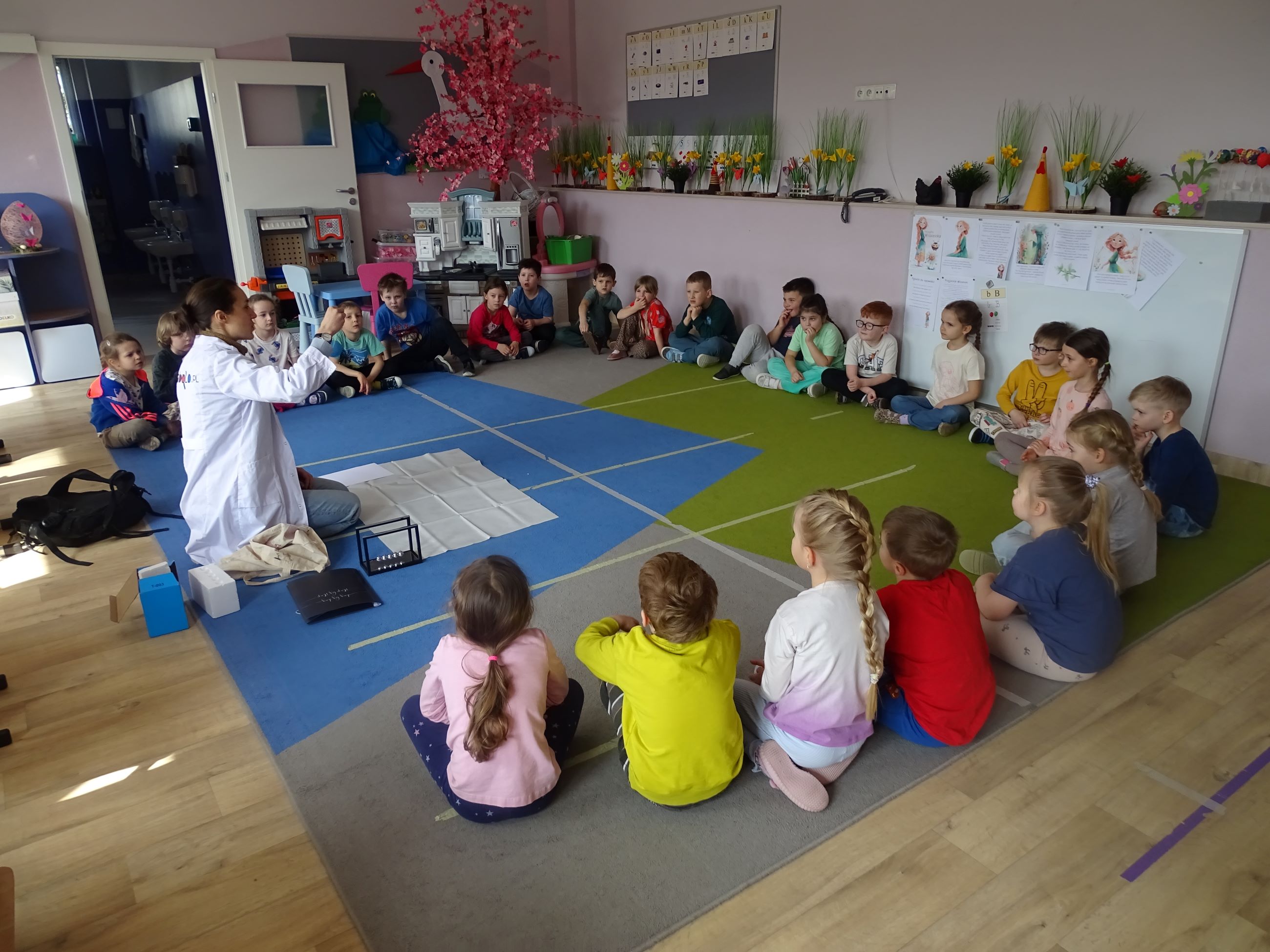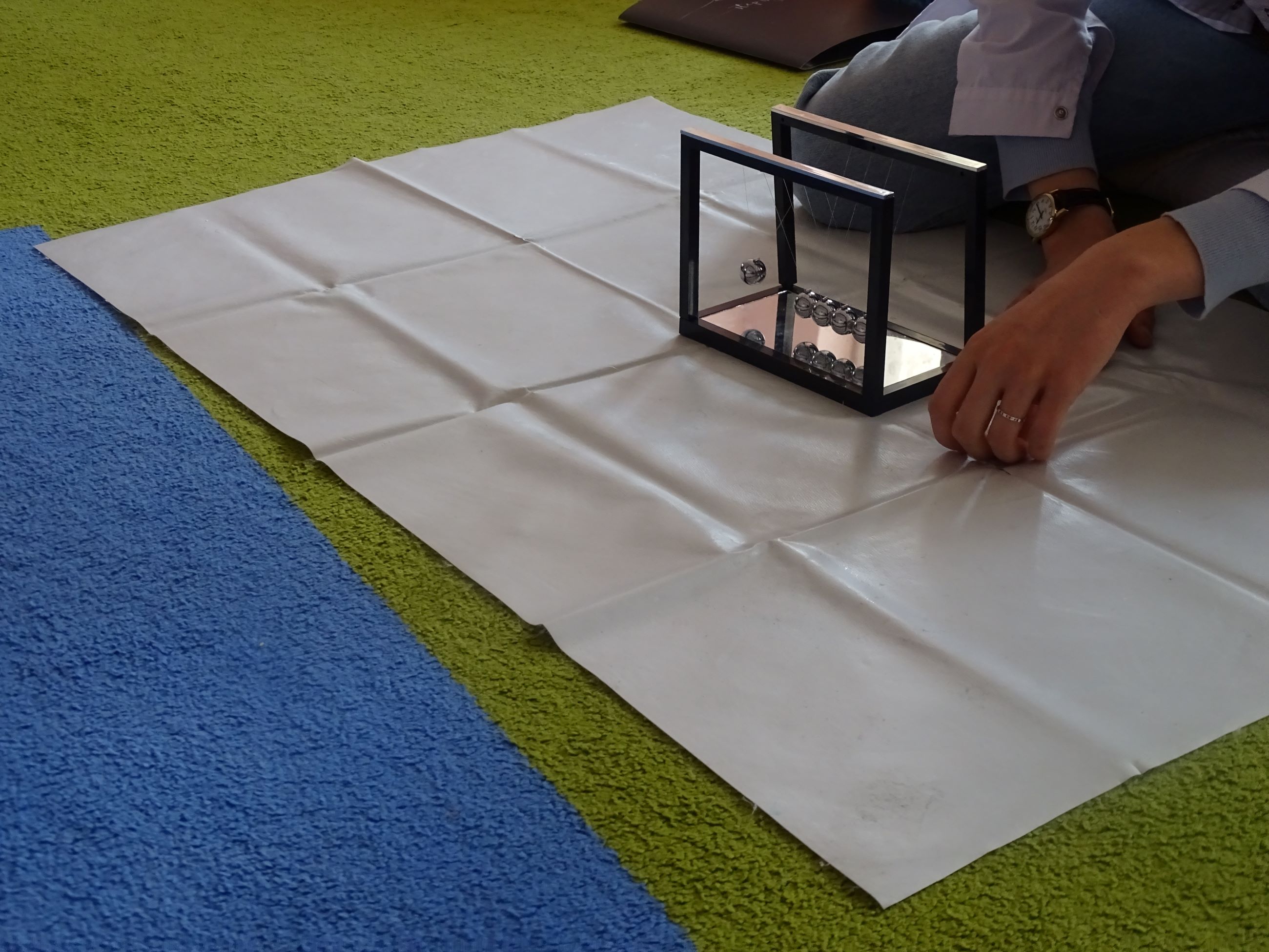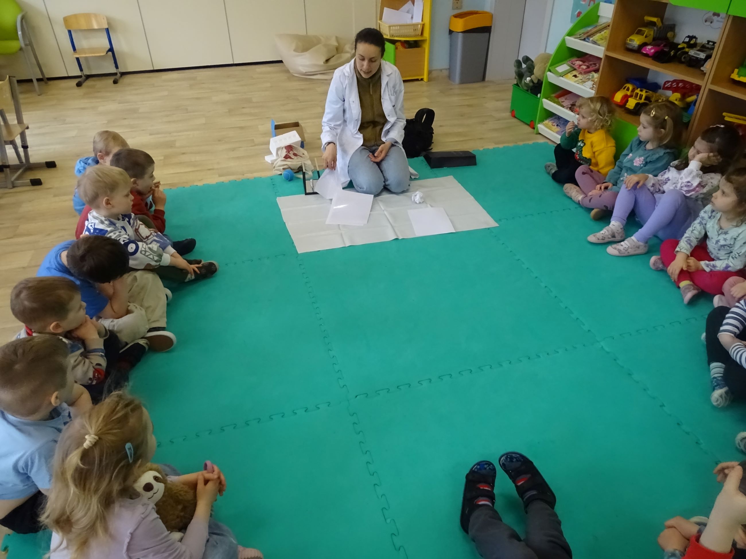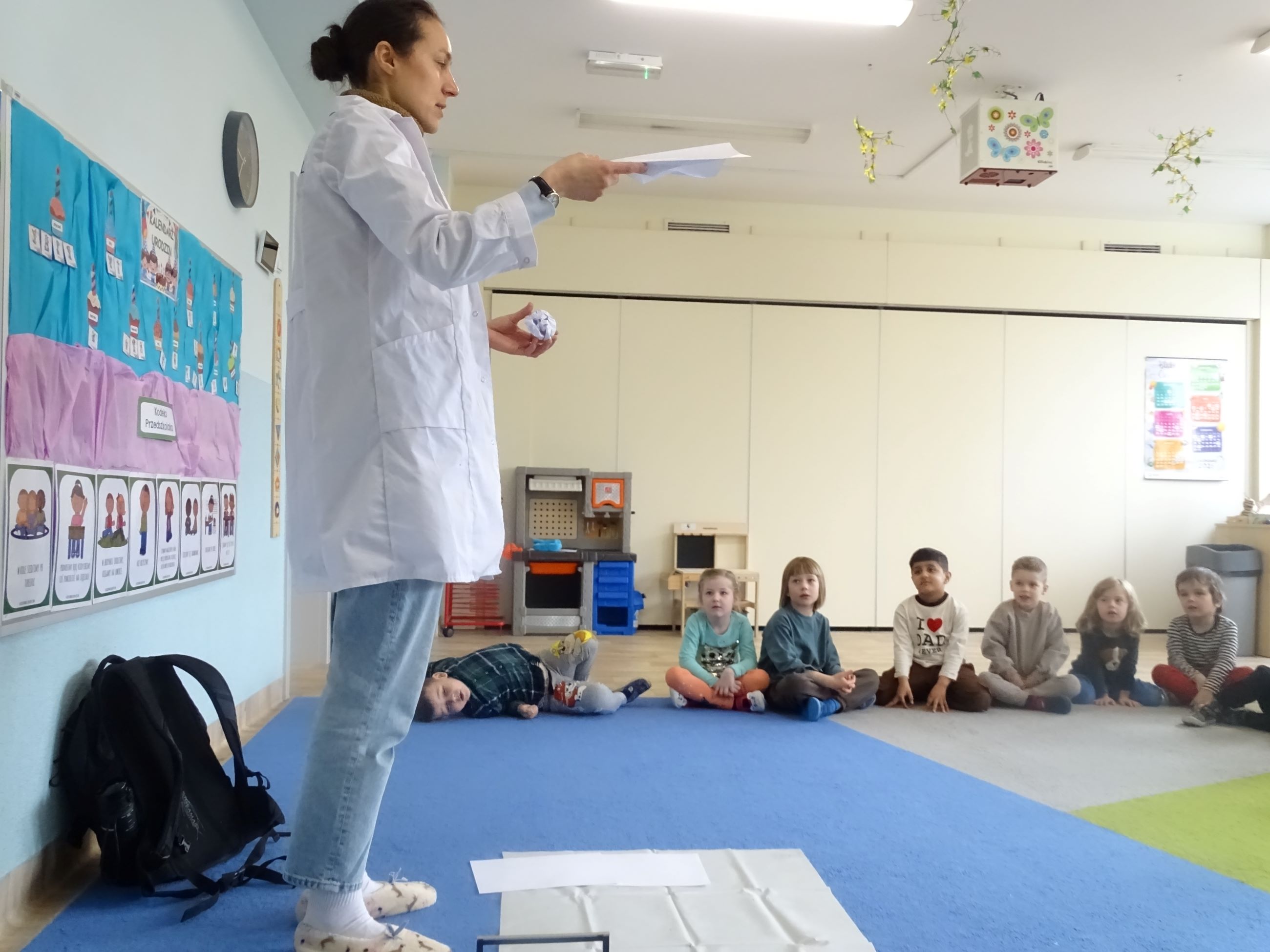 Tym razem w czasie warsztatów eksperymentalnych Labolo, przedszkolaki poznały ciekawostki na temat siły, przyciągania, prędkości. Obserwowały kartki, które spadały na podłogę i jak kształt w jakim były wpływał na ich prędkość. Obserwowały wahadło Newtona oraz samodzielnie wprawiały je w ruch. Dzieci z zainteresowaniem uczestniczyły w zajęciach.