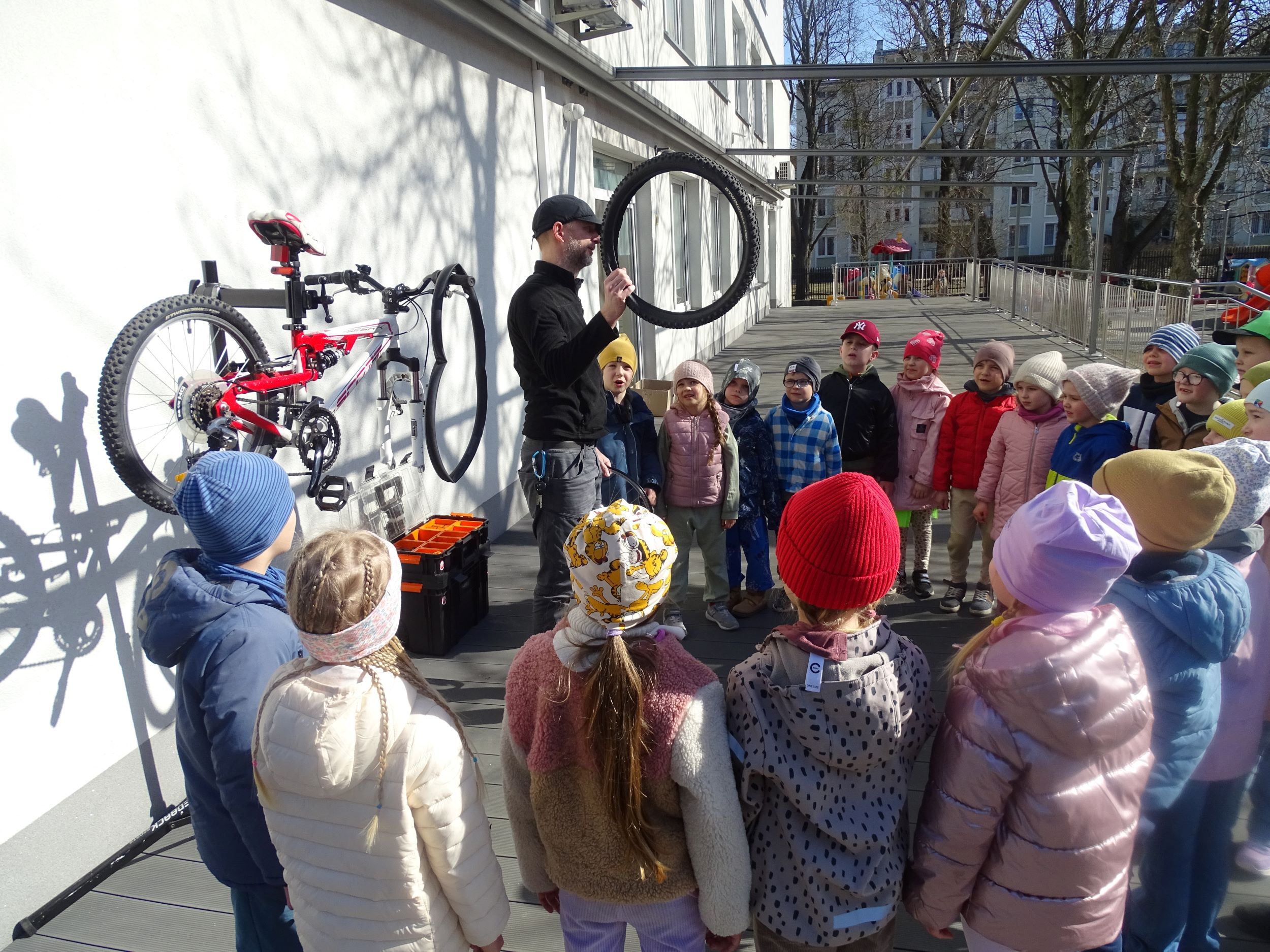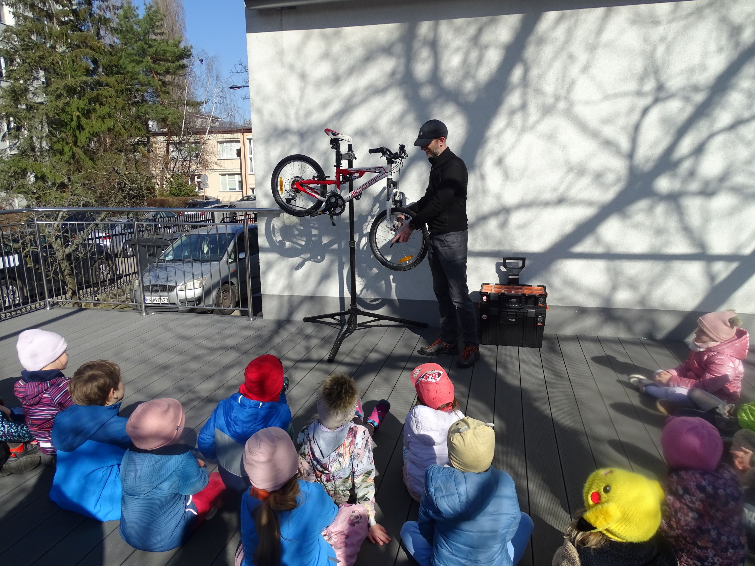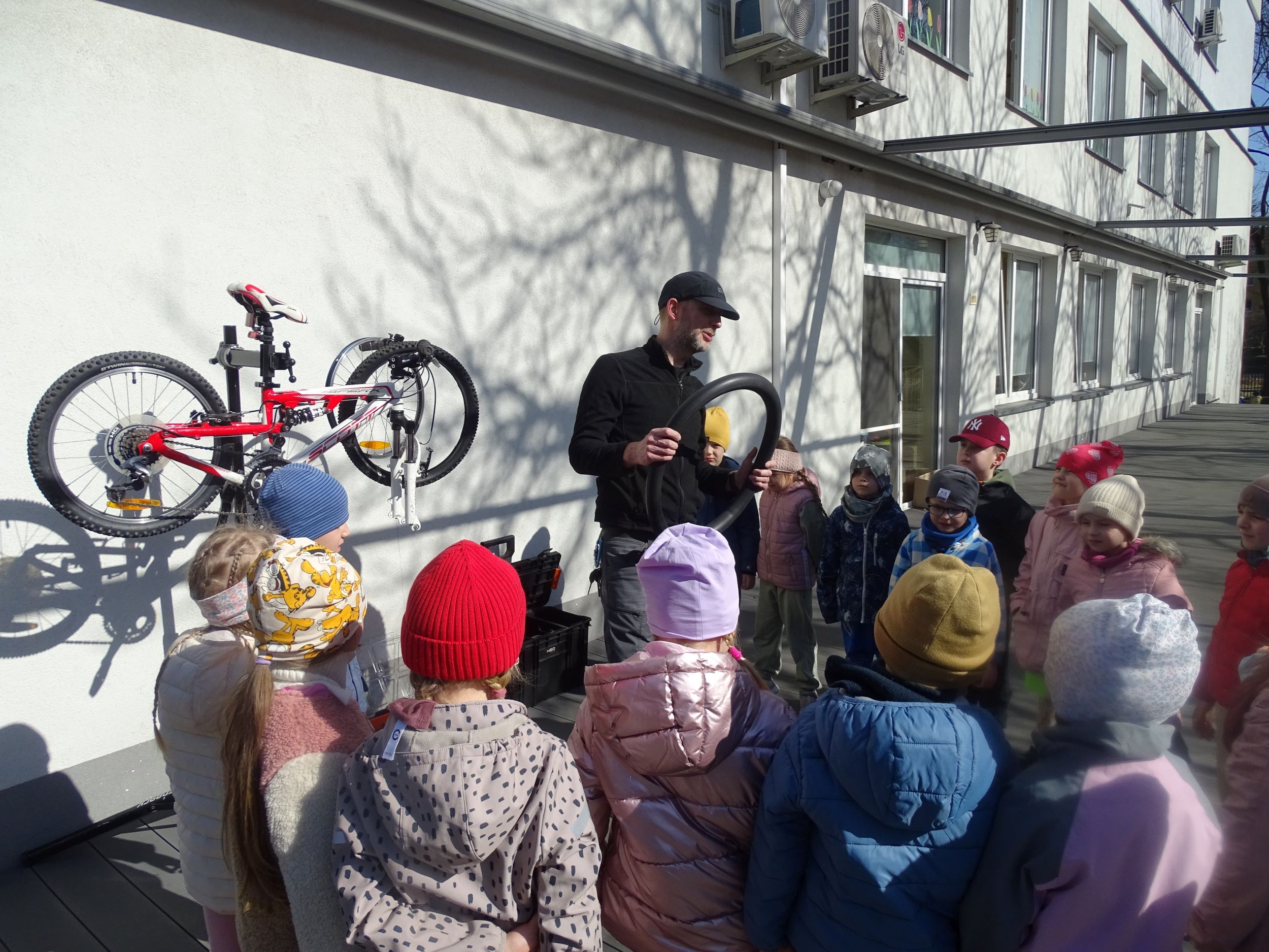 Na początku marca dzieci z grup Maki i Chabry wzięły udział w warsztatach rowerowych, które zostały zorganizowane w ramach projektu "Po Warszawie pieszo i na kółkach". Pan z Mobilnego Serwisu Rowerowego odwiedził nasze przedszkole i opowiedział dzieciom z jakich elementów zbudowany jest rower jak również nauczył je zmieniać przedziurawioną dętkę. Przedszkolaki z ogromnym zaangażowaniem i zainteresowaniem wzięły w nich udział.