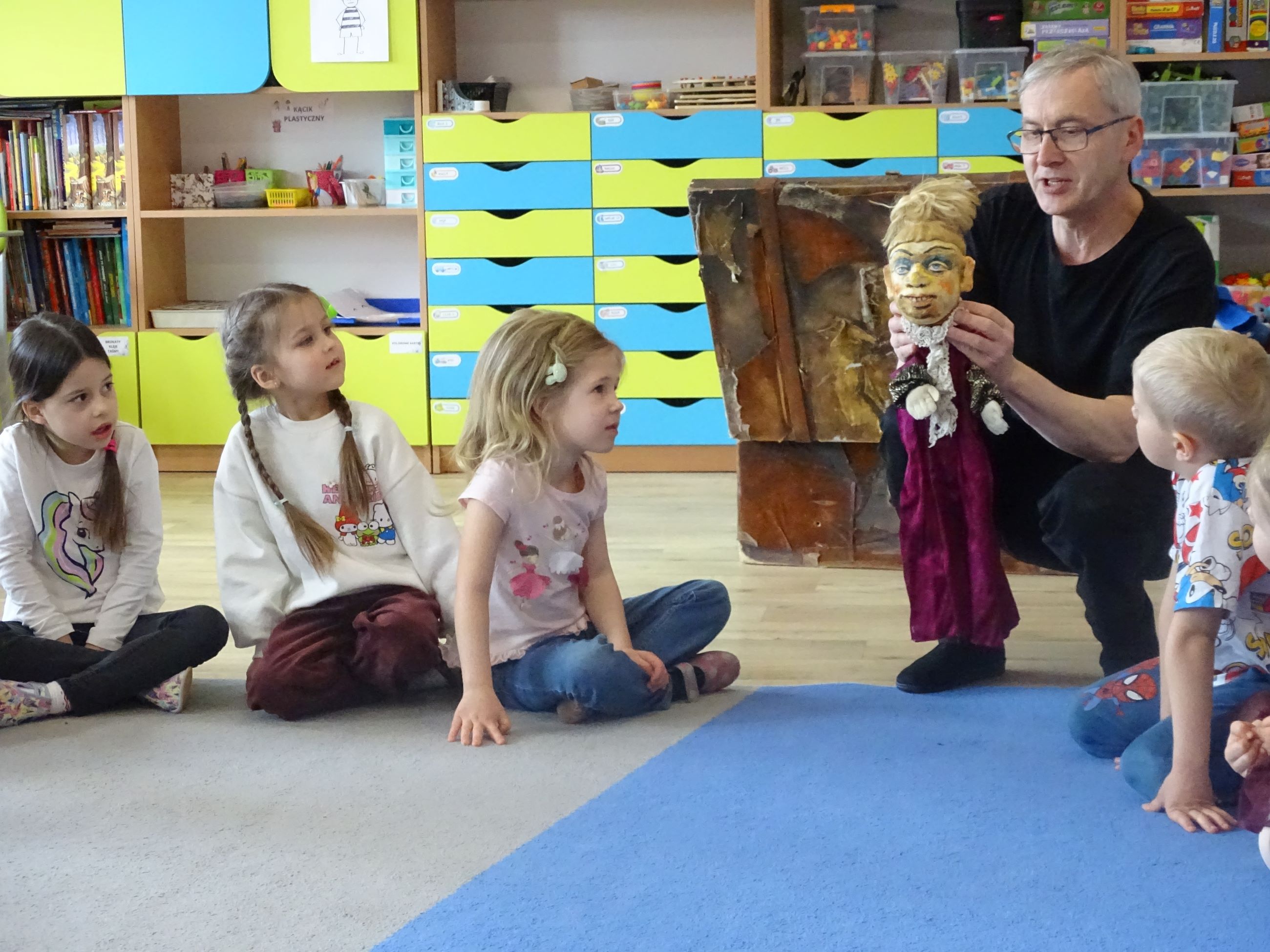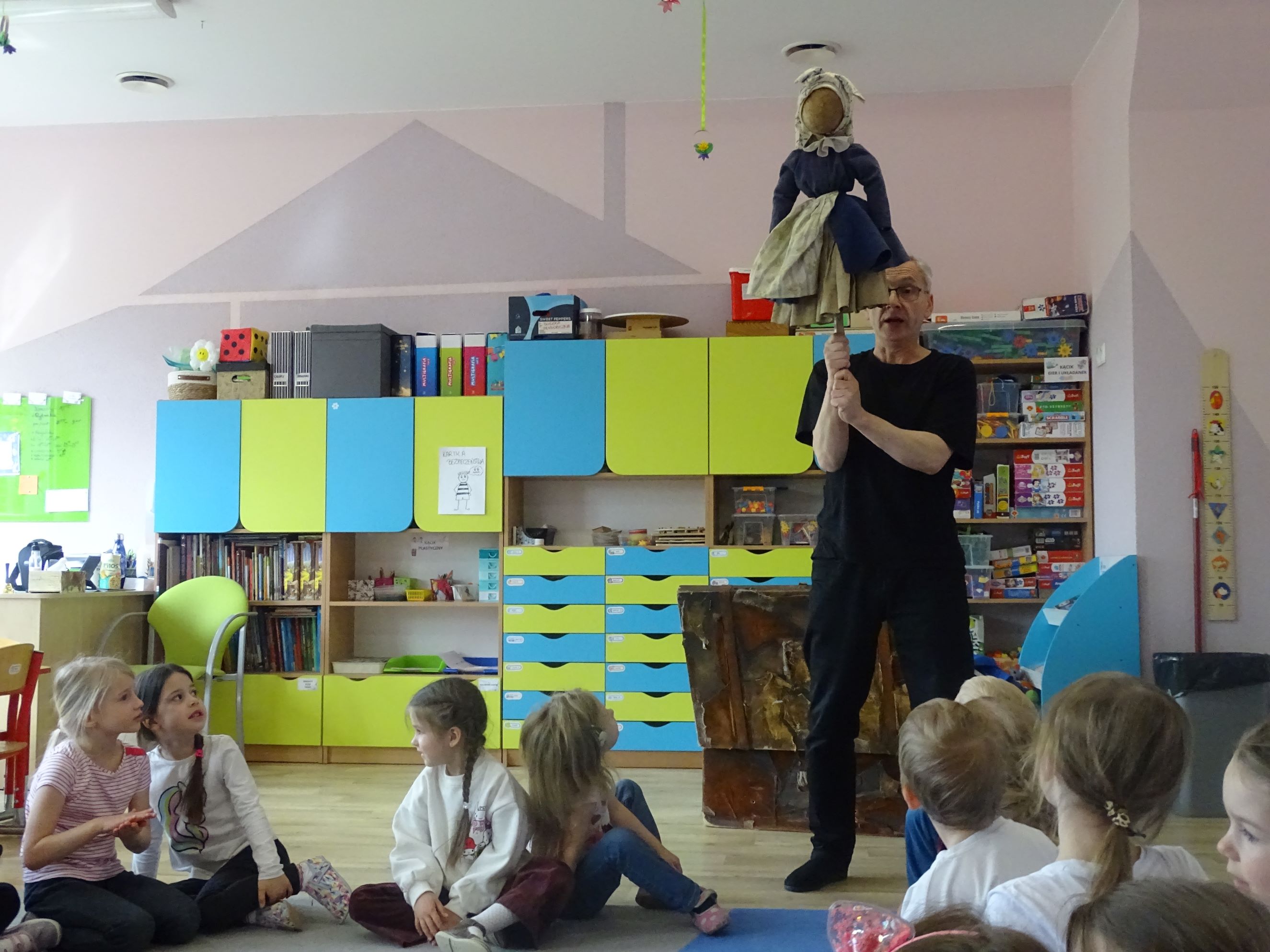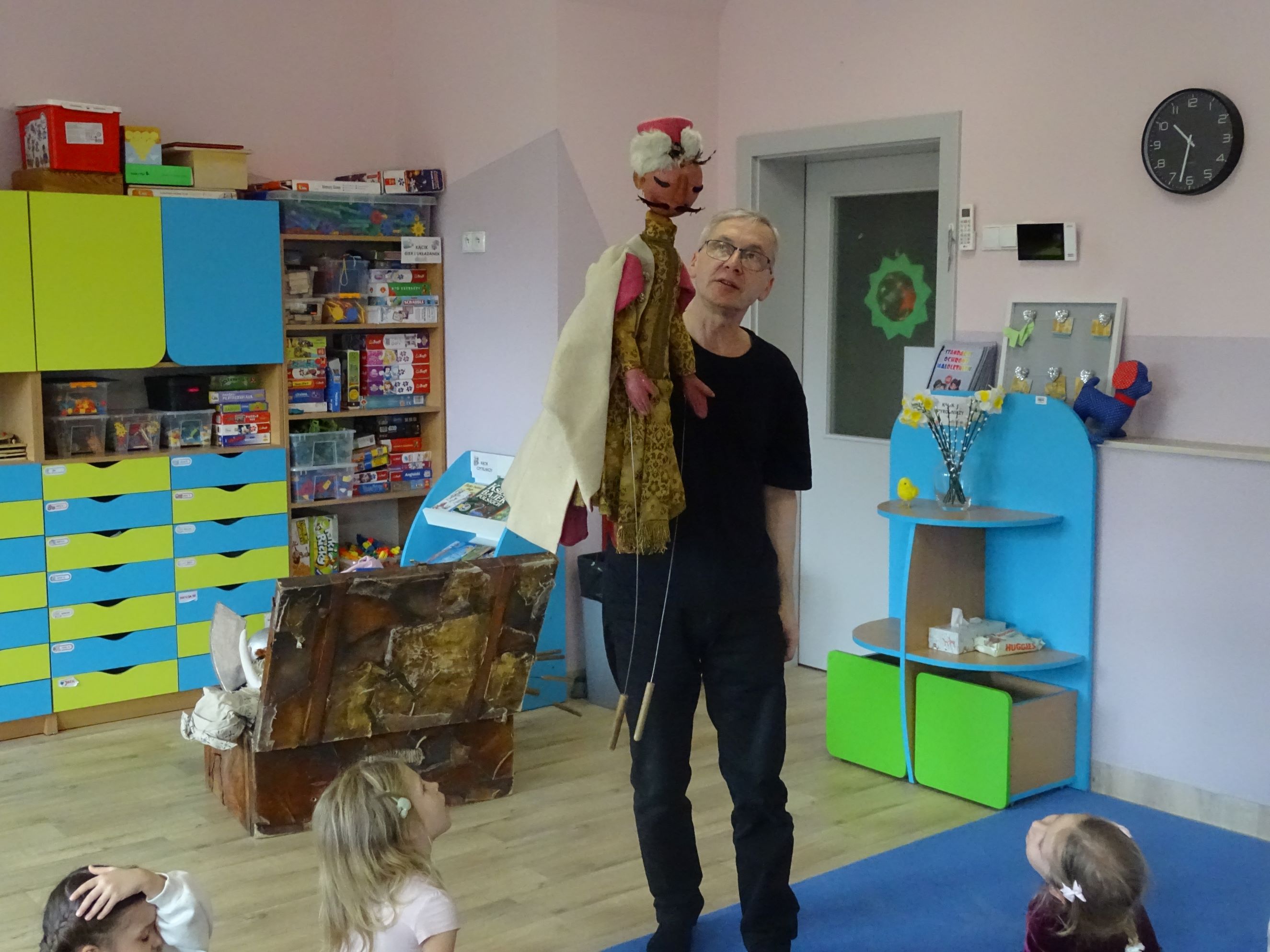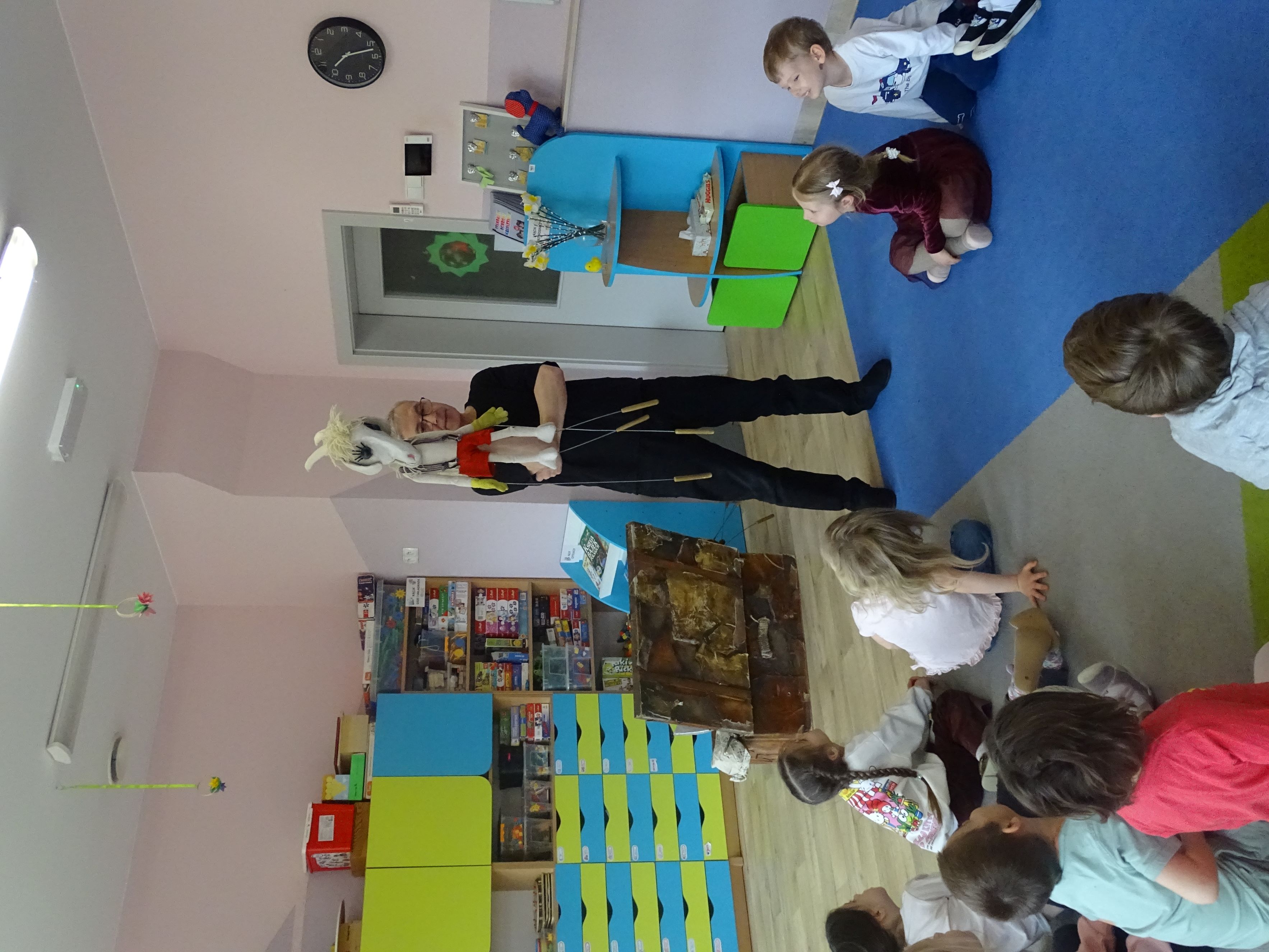 W minionym tygodniu przedszkolaki z grupy Maki odwiedził pan Paweł Jaroszewicz, aktor z Teatru Lalek Guliwer, który pokazał oraz opowiedział dzieciom ciekawostki na temat lalek grających w spektaklach. Były to historyczne pacynki, kukły, jawajki, marionetki, które dzieci mogły dokładnie obejrzeć oraz nimi animować. Przedszkolaki z ogromnym zainteresowaniem uczestniczyły w zajęciach i z radością bawiły się lalkami podziwiając ich wygląd oraz mechanizmy dzięki, którym aktor mógł nimi poruszać.