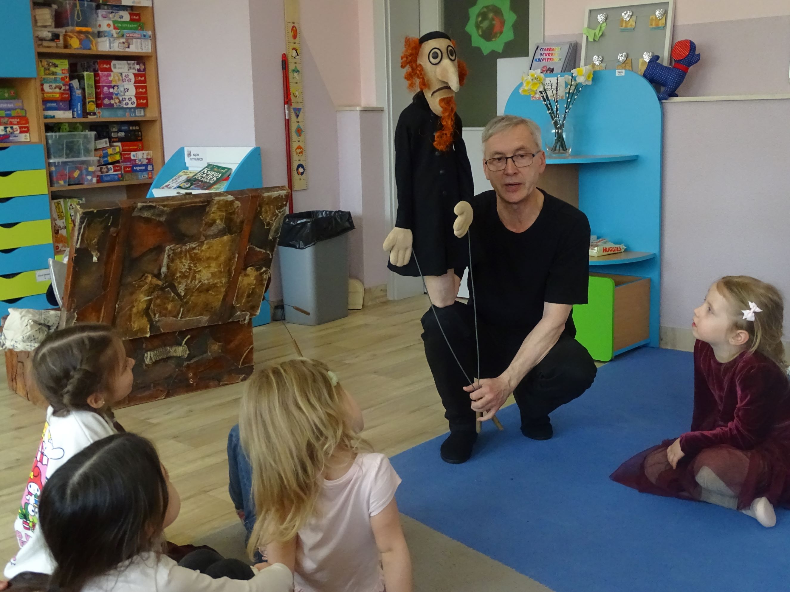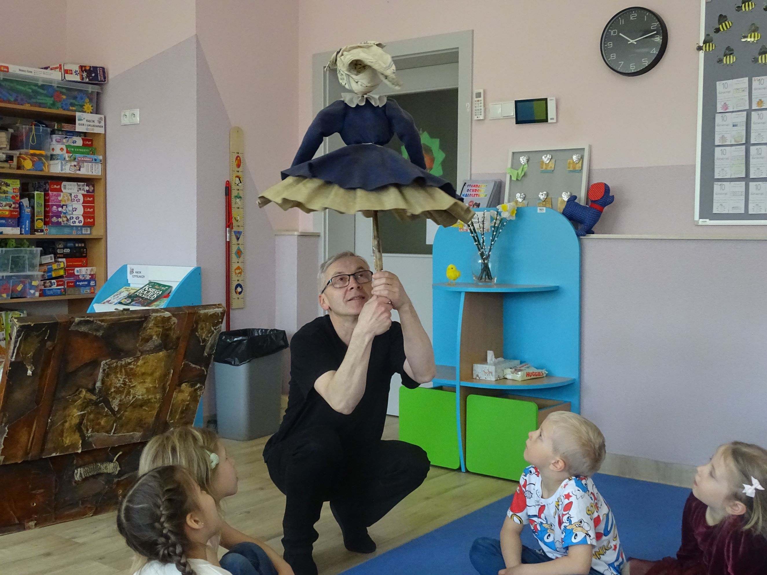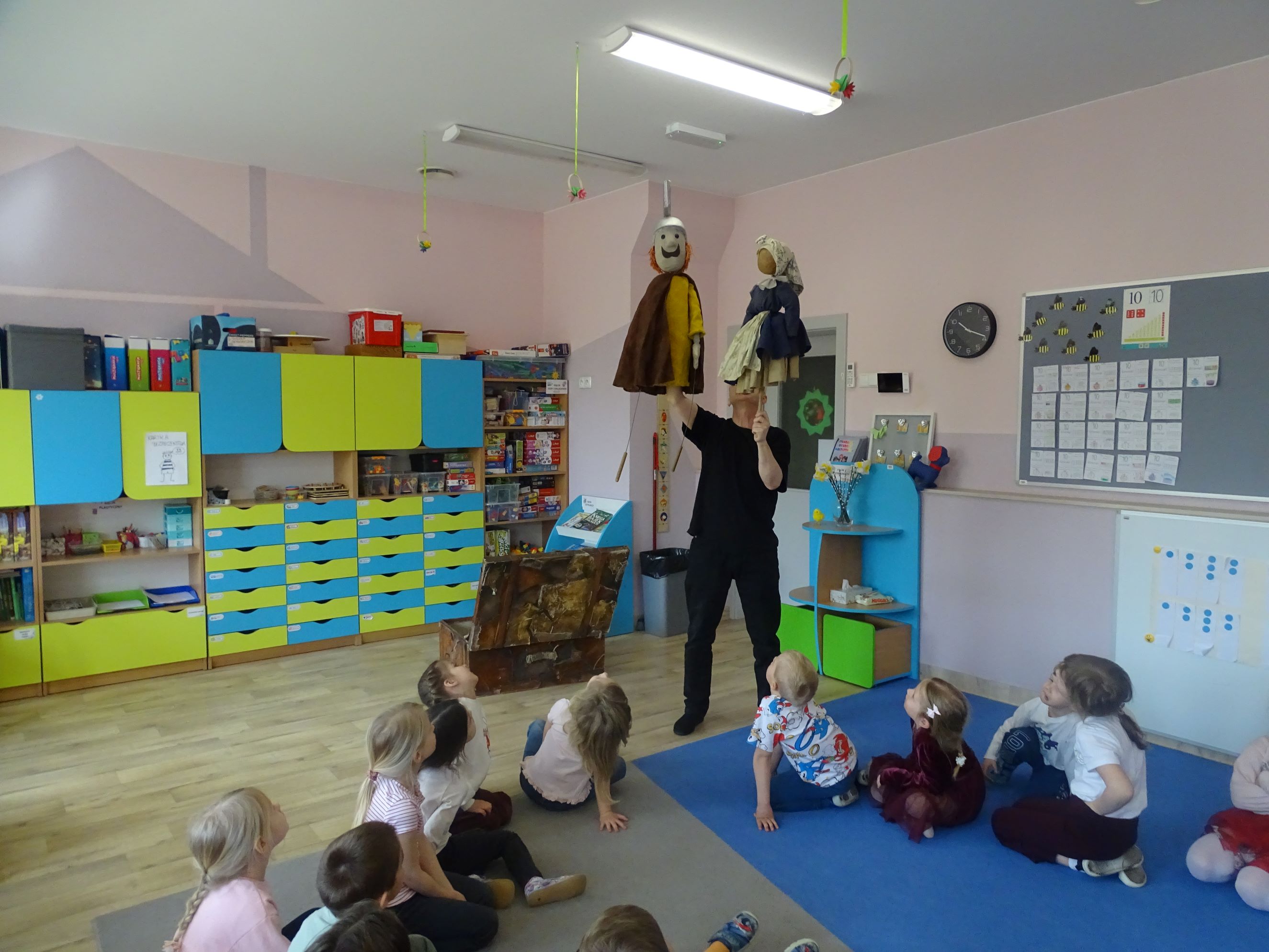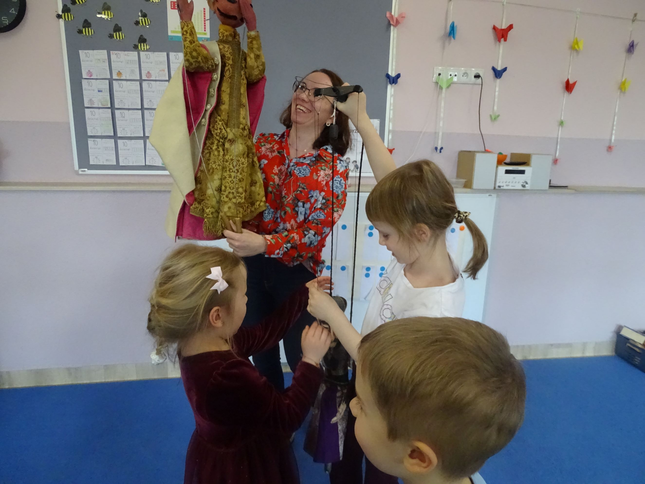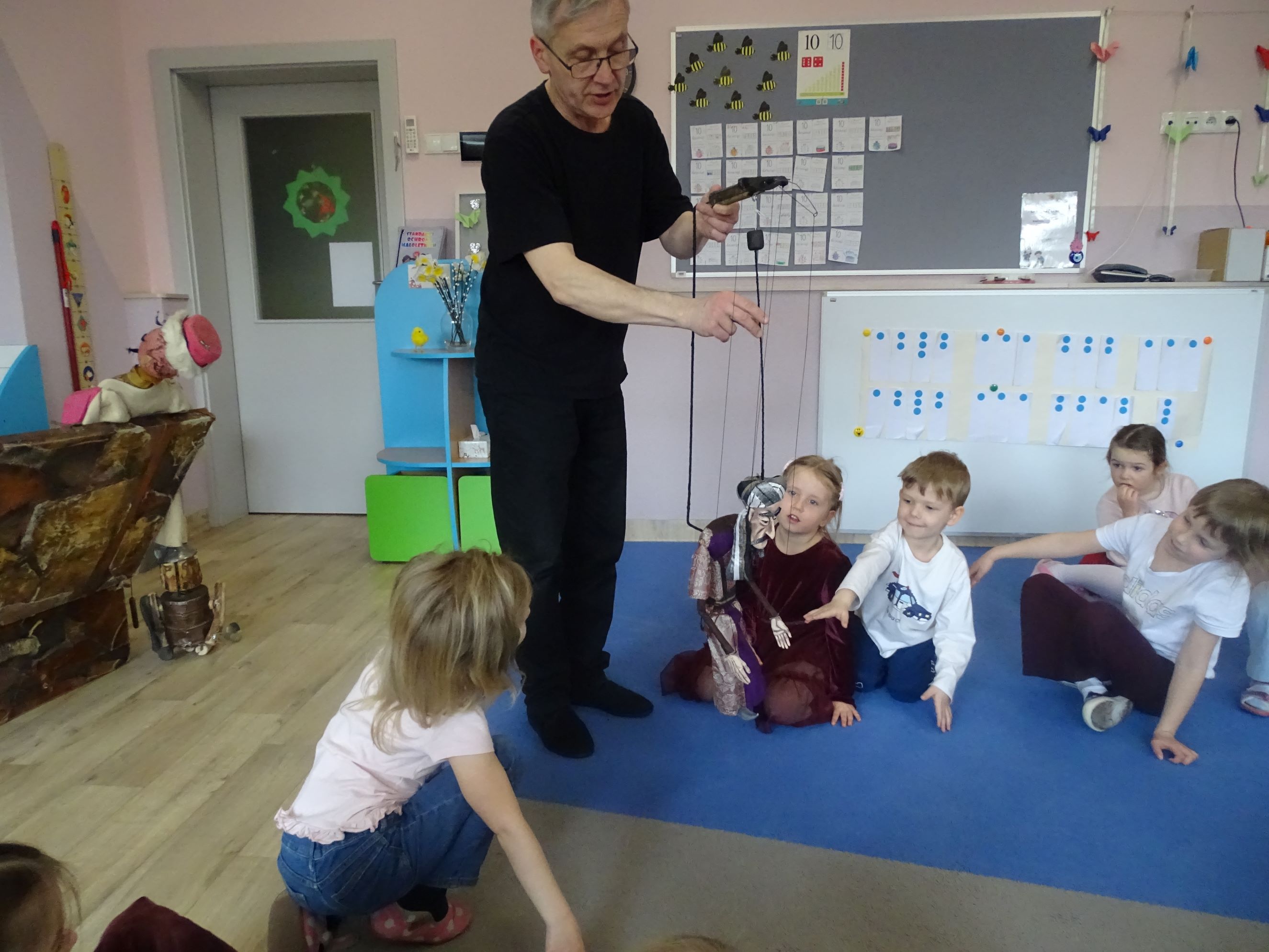 W minionym tygodniu przedszkolaki z grupy Maki odwiedził pan Paweł Jaroszewicz, aktor z Teatru Lalek Guliwer, który pokazał oraz opowiedział dzieciom ciekawostki na temat lalek grających w spektaklach. Były to historyczne pacynki, kukły, jawajki, marionetki, które dzieci mogły dokładnie obejrzeć oraz nimi animować. Przedszkolaki z ogromnym zainteresowaniem uczestniczyły w zajęciach i z radością bawiły się lalkami podziwiając ich wygląd oraz mechanizmy dzięki, którym aktor mógł nimi poruszać.