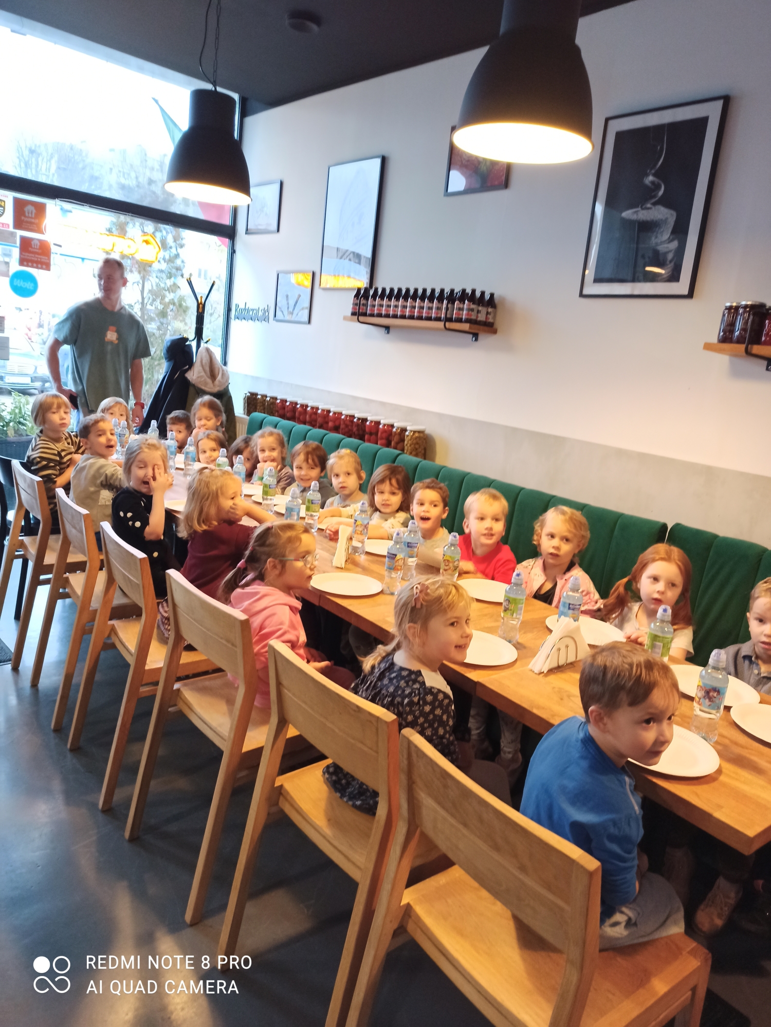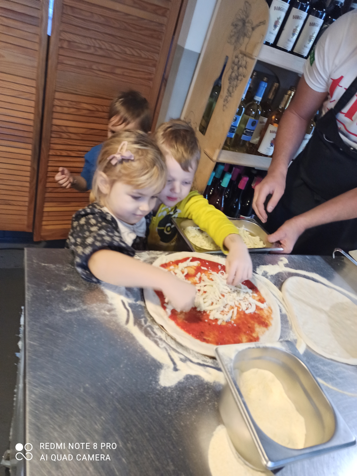 Na zaproszenie jednego z Rodziców nasze przedszkolaki miały niezwykłą okazję odwiedzić pizzerię. Dzieci z ogromnym zaangażowaniem uczestniczyły w warsztatach kulinarnych – samodzielnie formowały ciasto, wybierały ulubione składniki i tworzyły swoje własne, wyjątkowe pizze. Największą przyjemnością była oczywiście degustacja – świeżo upieczone, pachnące pizze smakowały wyśmienicie! Serdecznie dziękujemy za zaproszenie, gościnność oraz wspaniałą możliwość wspólnej zabawy i nauki. To była pyszna i niezapomniana wyprawa!