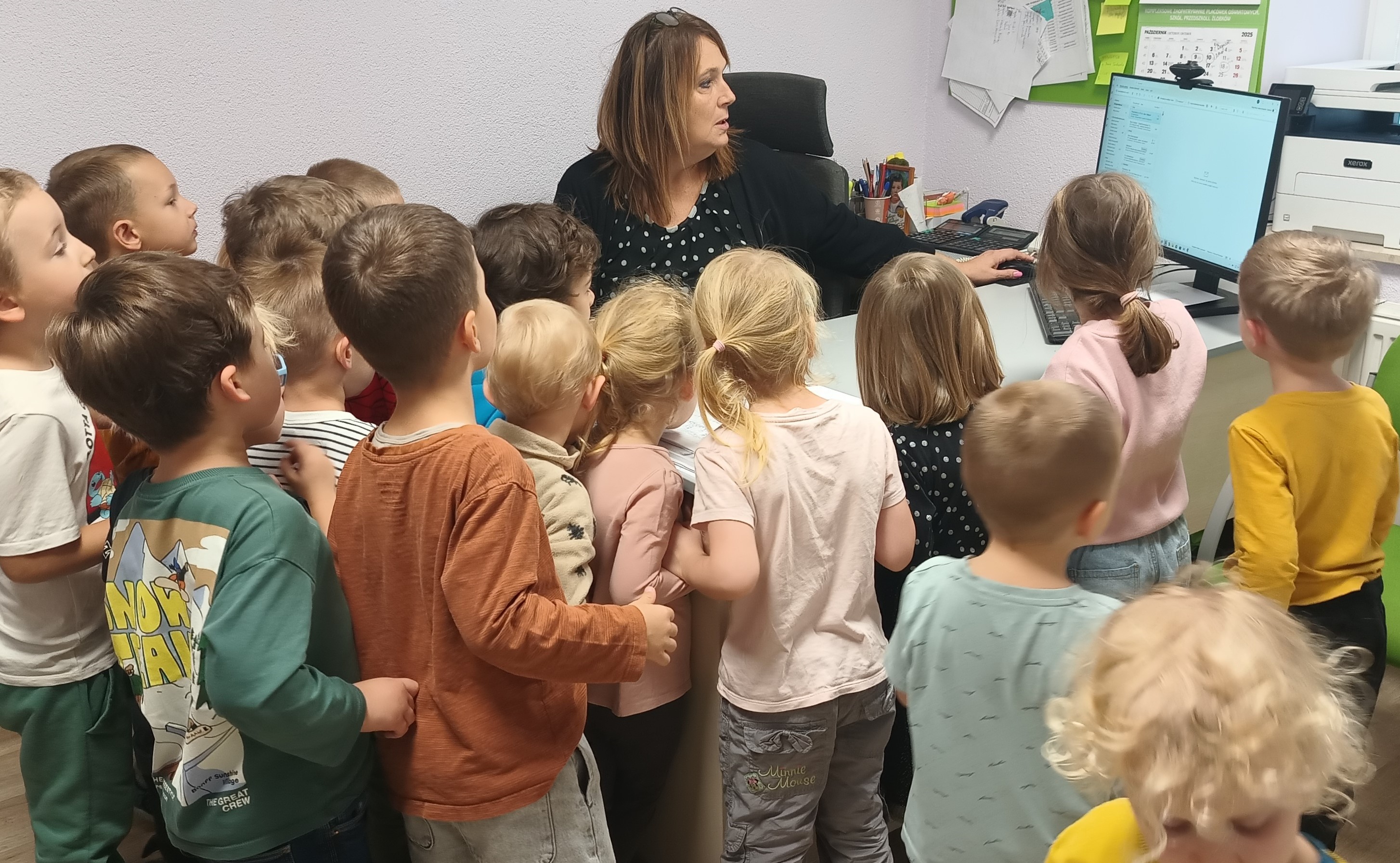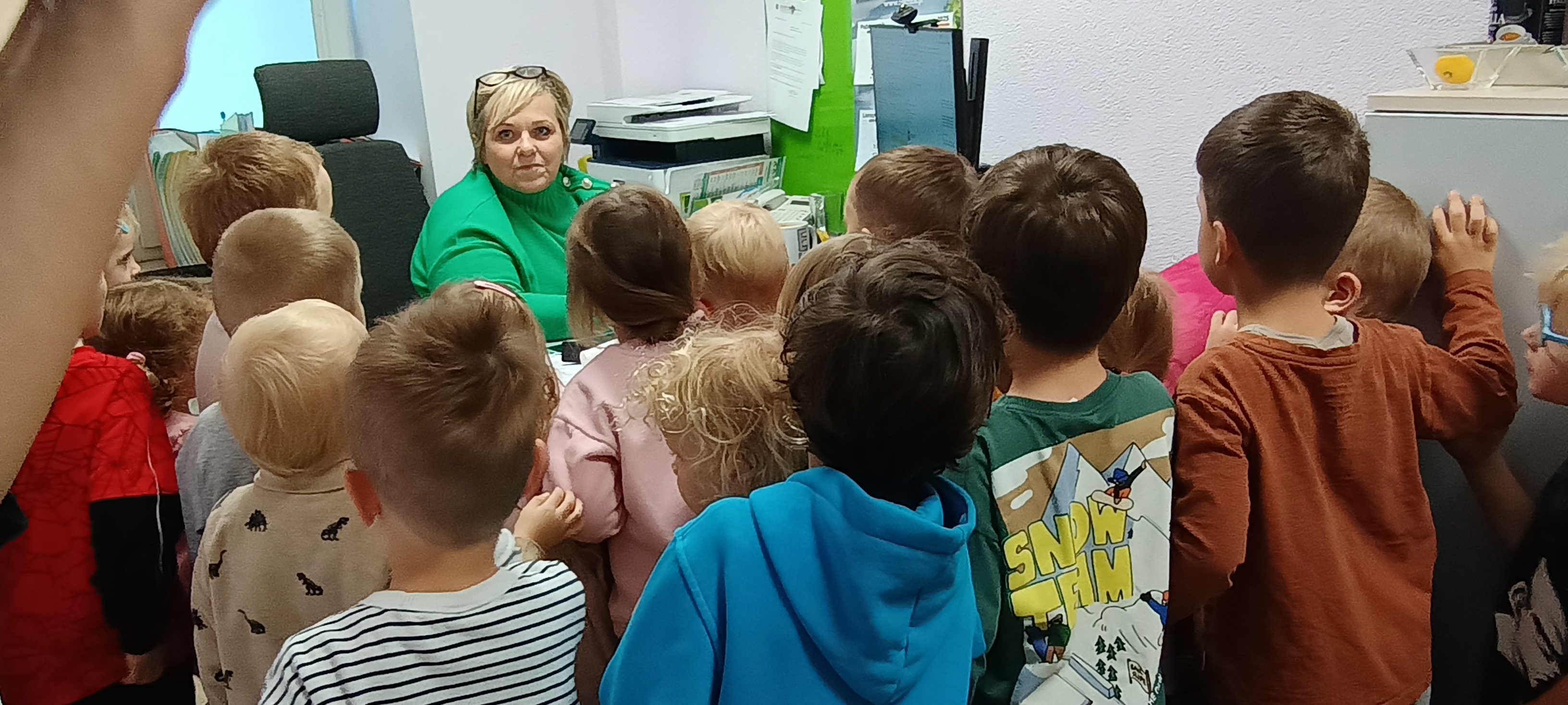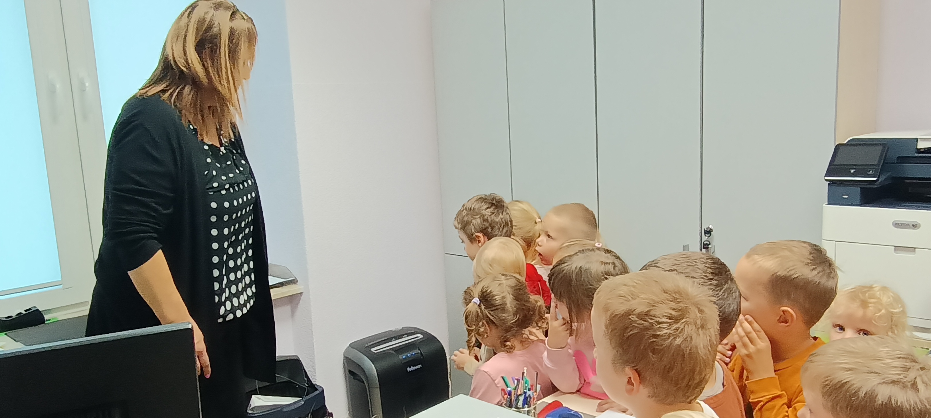 Bratki podczas realizacji tematu kompleksowego ,,Kto pracuje w przedszkolu” miały przyjemność gościć w swojej sali Panią Dyrektor, Panią Kucharkę oraz Pana Dozorcę, którzy opowiedzieli o swojej pracy i obowiązkach, które wypełniają. Dzieci na zaproszenie udały się z rewizytą do gabinetu Pani Dyrektor, która opowiedziała Bratkom o roli jaką pełni w przedszkolu. Dzieci poznały również zawód sekretarki, który pełni Pani Karolina i kierownika gospodarczego sprawowanego przez Panią Ewę. Przedszkolaki dowiedziały się jakie urządzenia potrzebne są do pracy wyżej wymienionym osobom, do czego służy niszczarka, co przechowuje się w dużych szafach i wielu innych ciekawostek.