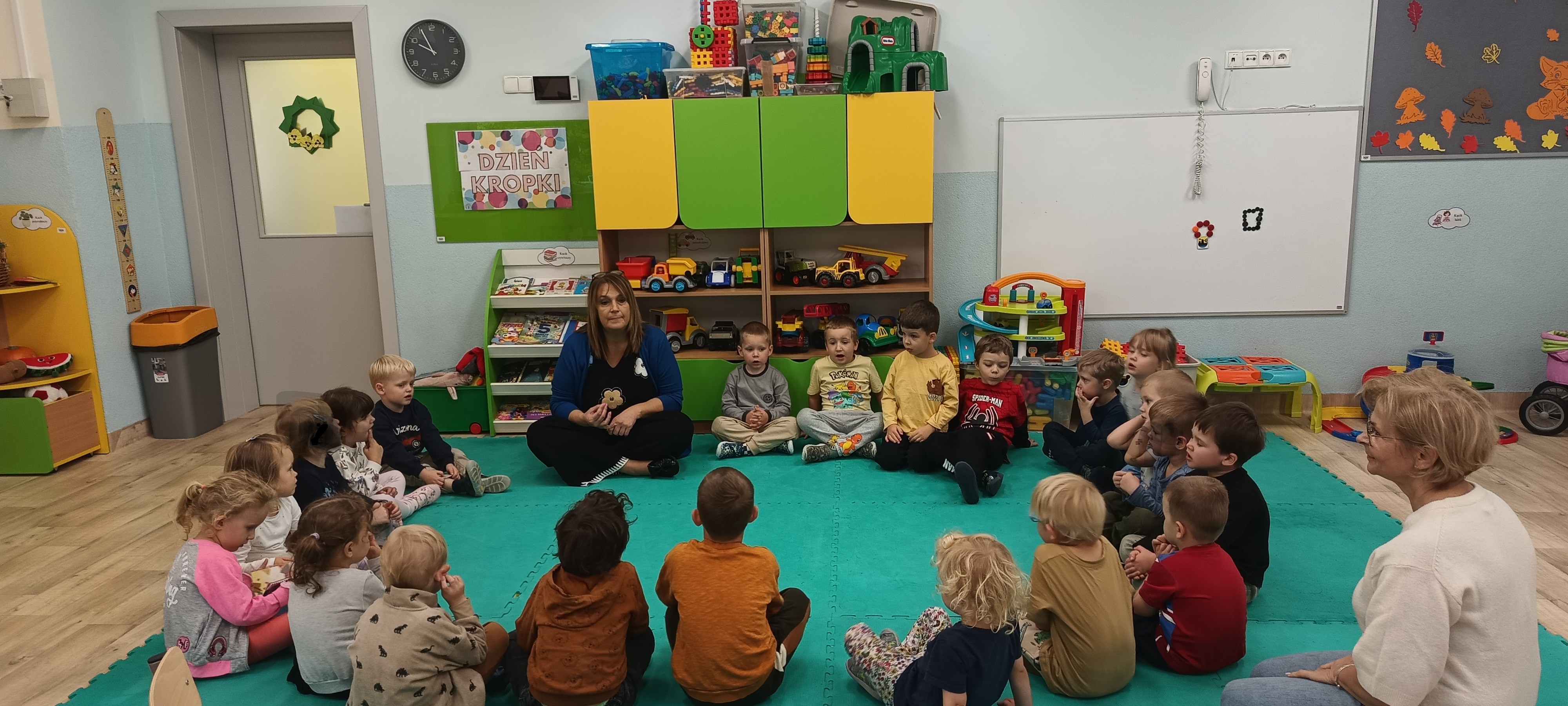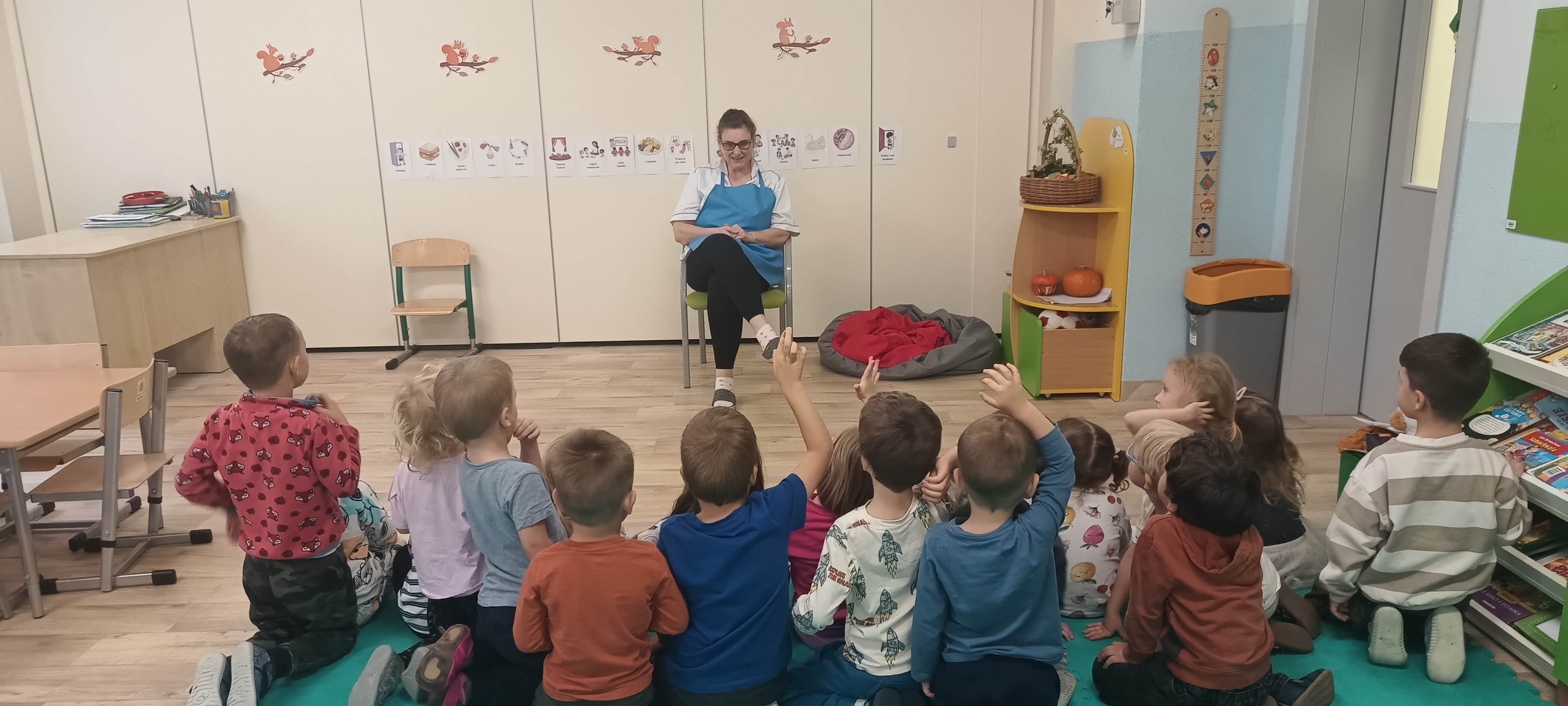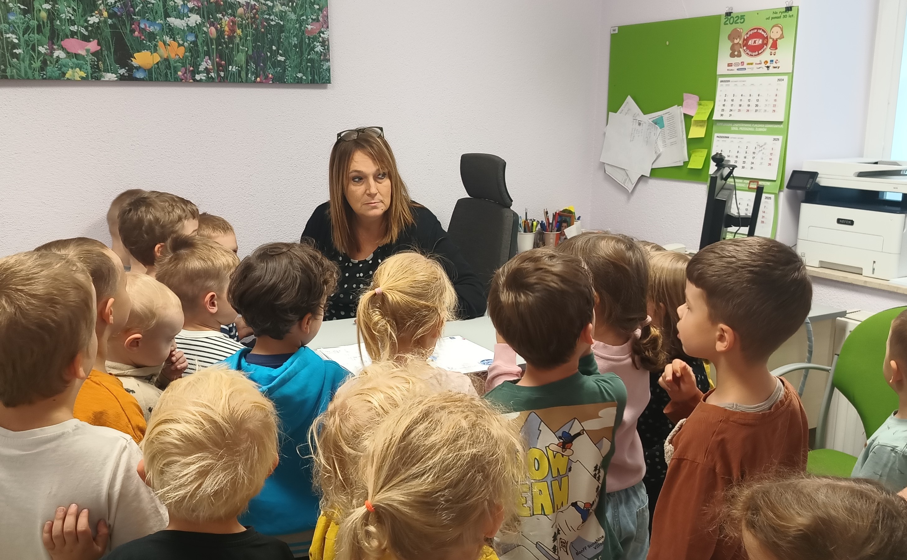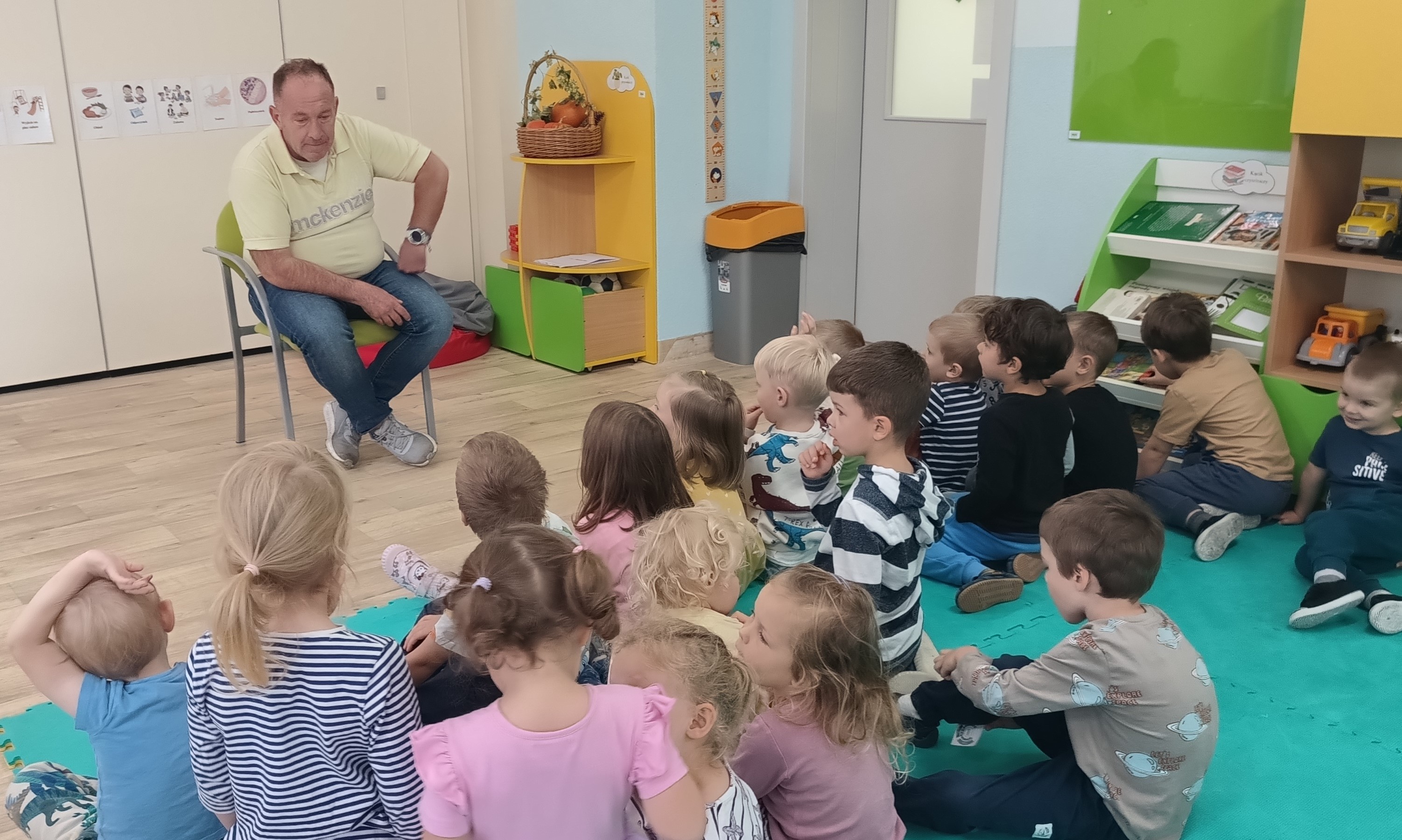 Bratki podczas realizacji tematu kompleksowego ,,Kto pracuje w przedszkolu” miały przyjemność gościć w swojej sali Panią Dyrektor, Panią Kucharkę oraz Pana Dozorcę, którzy opowiedzieli o swojej pracy i obowiązkach, które wypełniają. Dzieci na zaproszenie udały się z rewizytą do gabinetu Pani Dyrektor, która opowiedziała Bratkom o roli jaką pełni w przedszkolu. Dzieci poznały również zawód sekretarki, który pełni Pani Karolina i kierownika gospodarczego sprawowanego przez Panią Ewę. Przedszkolaki dowiedziały się jakie urządzenia potrzebne są do pracy wyżej wymienionym osobom, do czego służy niszczarka, co przechowuje się w dużych szafach i wielu innych ciekawostek.