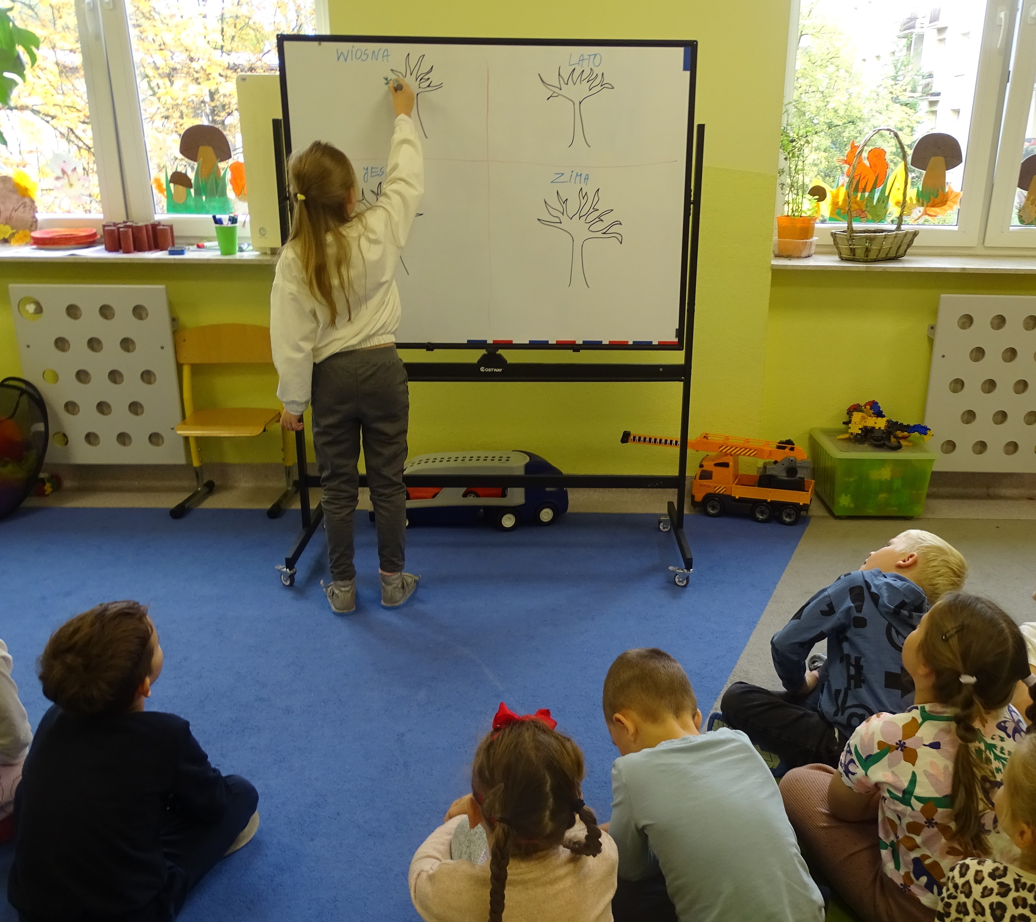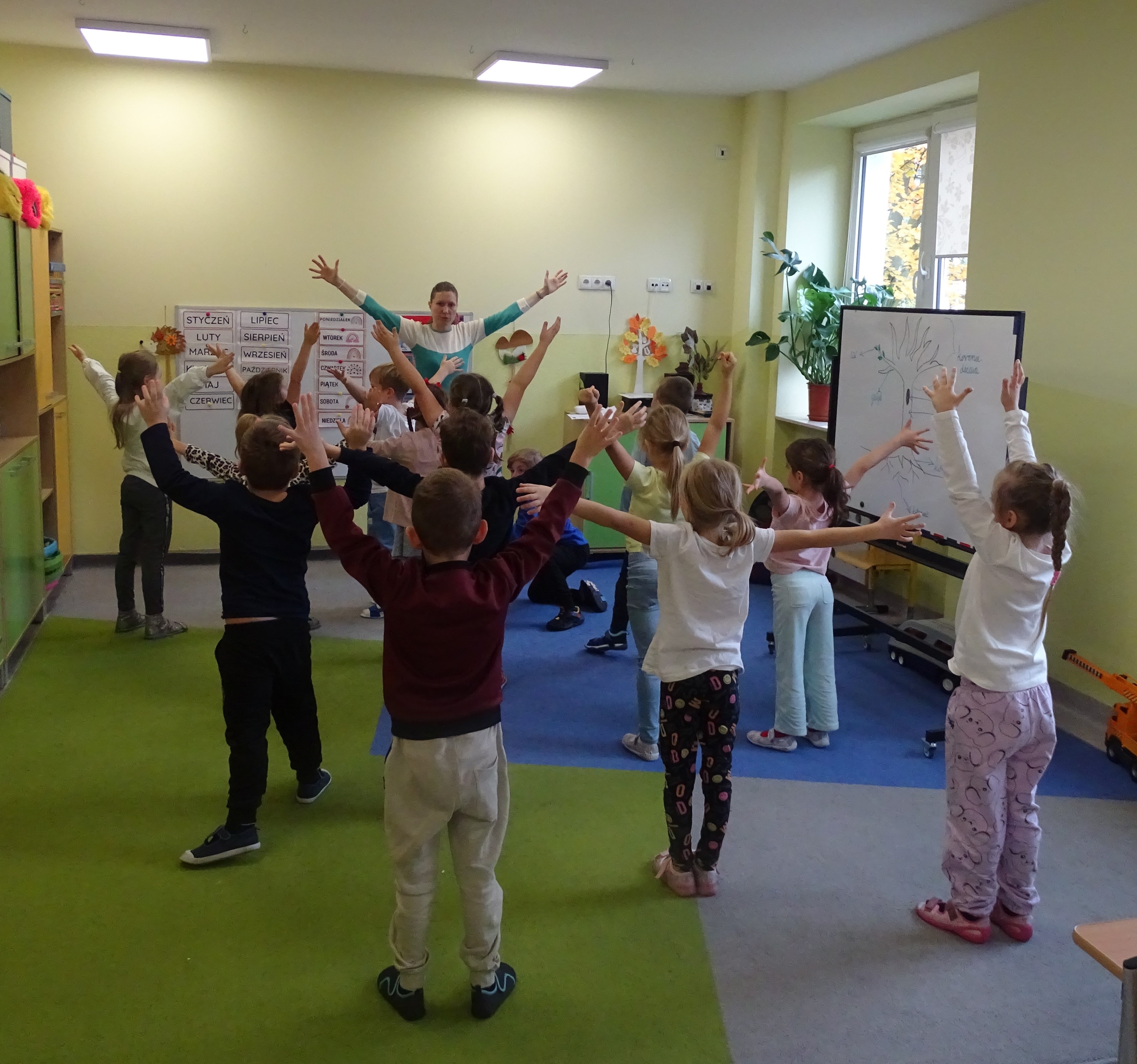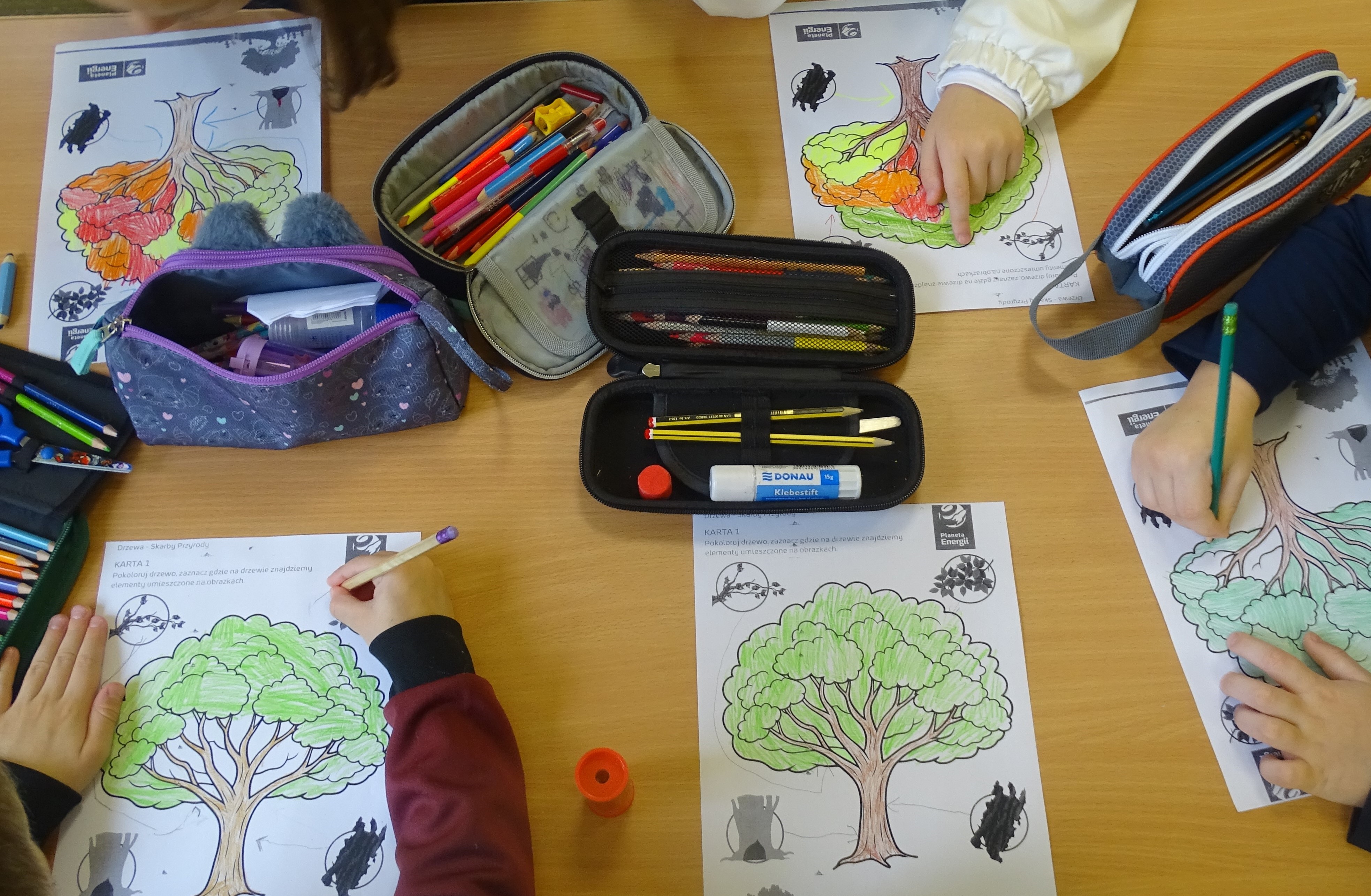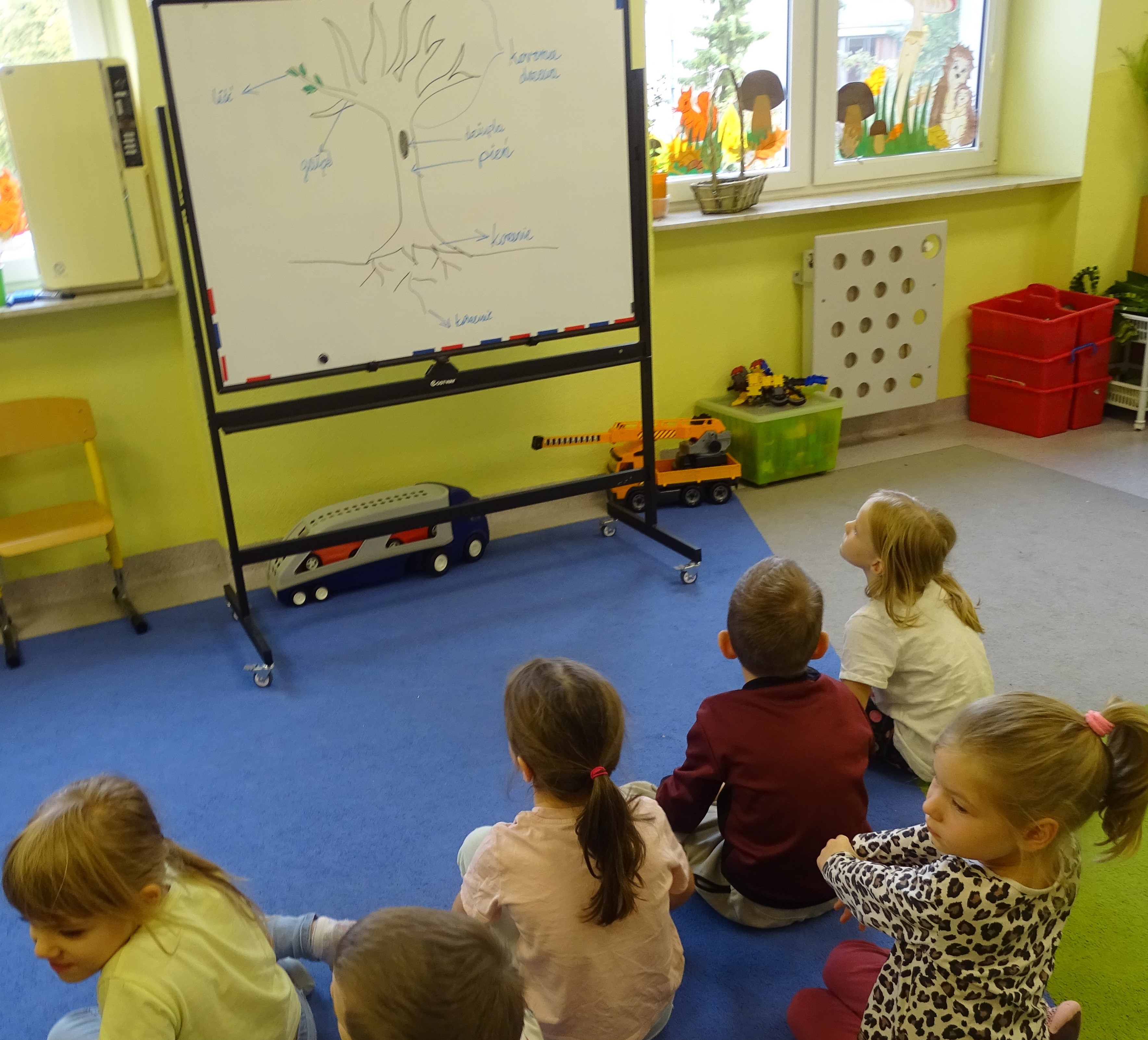 W ramach realizacji projektu Planeta Energia dzieci z grupy Słoneczniki brały udział w październiku w zajęciach o bioróżnorodności pt. „Drzewa – skarby przyrody”. Przedszkolaki poznały budowę drzew, a także ich wygląd i charakterystyczne cechy podczas różnych pór roku. Porównywały wygląd różnych gatunków drzew, łączyły w pary liście drzew i ich owoce, grały w grę memo „Liście”. Badały fakturę kory pod lupą, odbijały ją na kartce papieru. Dzieci wykonały również prace plastyczne, w których wykorzystały prawdziwe liście drzew. Zajęcia odbywały się zarówno w sali, jak i w ogrodzie przedszkolnym i sprawiły dzieciom dużo radości.