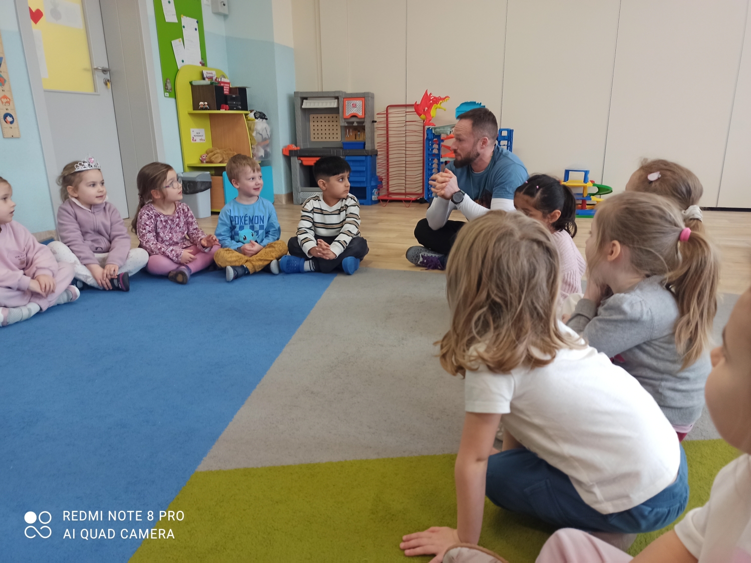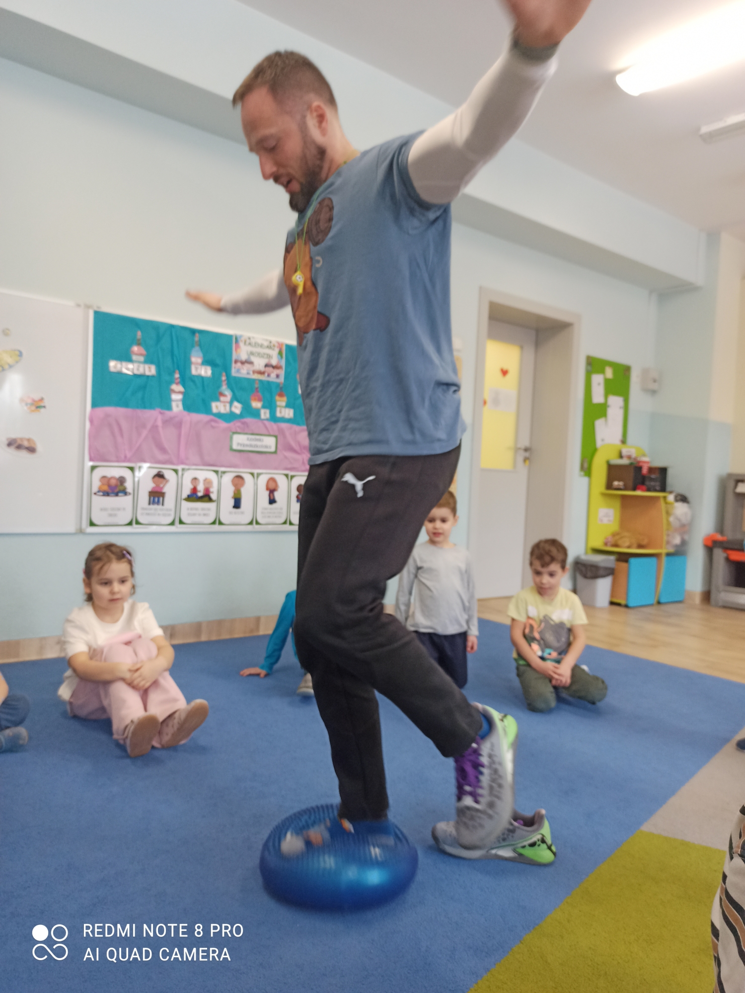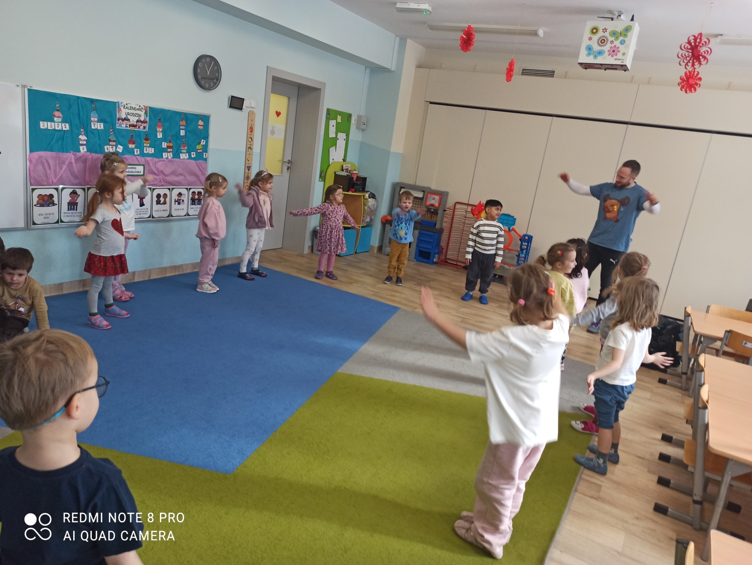 Wtorek upłynął w grupie Niezapominajki bardzo aktywnie i radośnie. Zajęcia ruchowe dla dzieci poprowadził jeden z rodziców, wpisując się w realizowany w całym przedszkolu temat tygodnia „W zdrowym ciele zdrowy duch”. Podczas spotkania dzieci z dużym entuzjazmem uczestniczyły w różnorodnych ćwiczeniach i zabawach ruchowych. Aktywności te sprzyjały rozwijaniu sprawności fizycznej, koordynacji ruchowej oraz kształtowaniu zdrowych nawyków. Ruch dostarczył dzieciom wiele radości i pozytywnej energii. Serdecznie dziękujemy za zaangażowanie, inicjatywę oraz wspólnie spędzony czas.